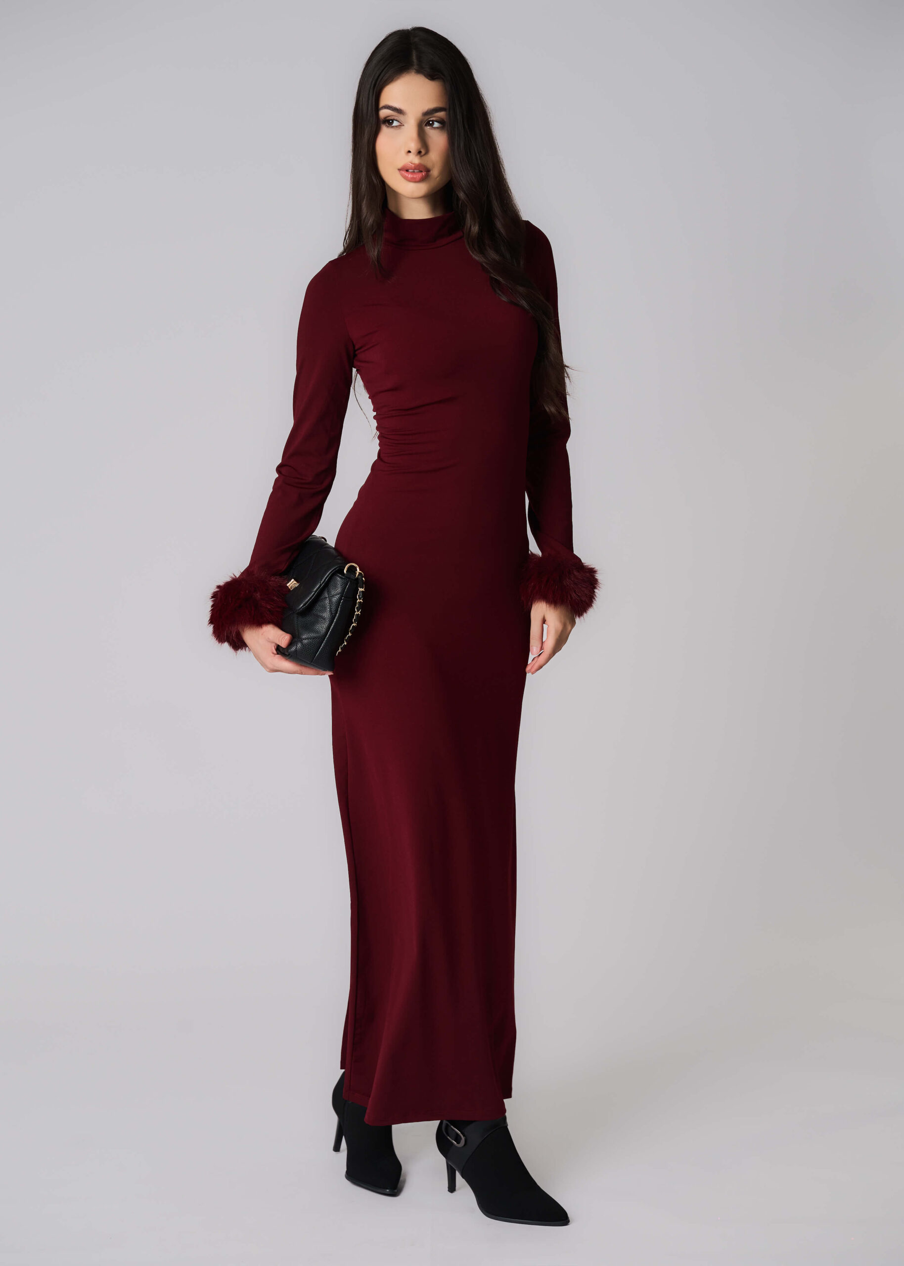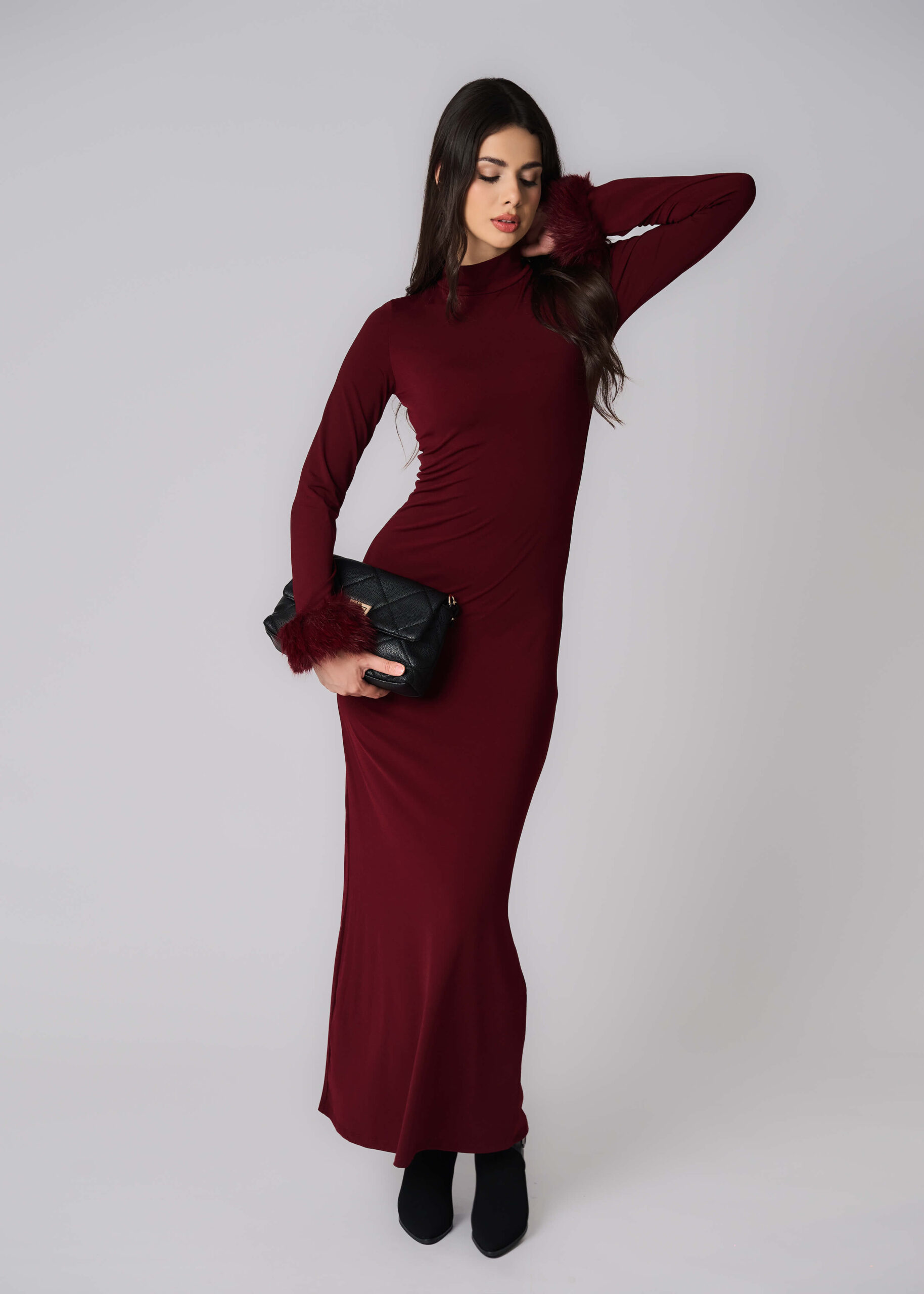Women dress, long, plain, stand collar with back button, long sleeves with fur cuffs, unique and modern