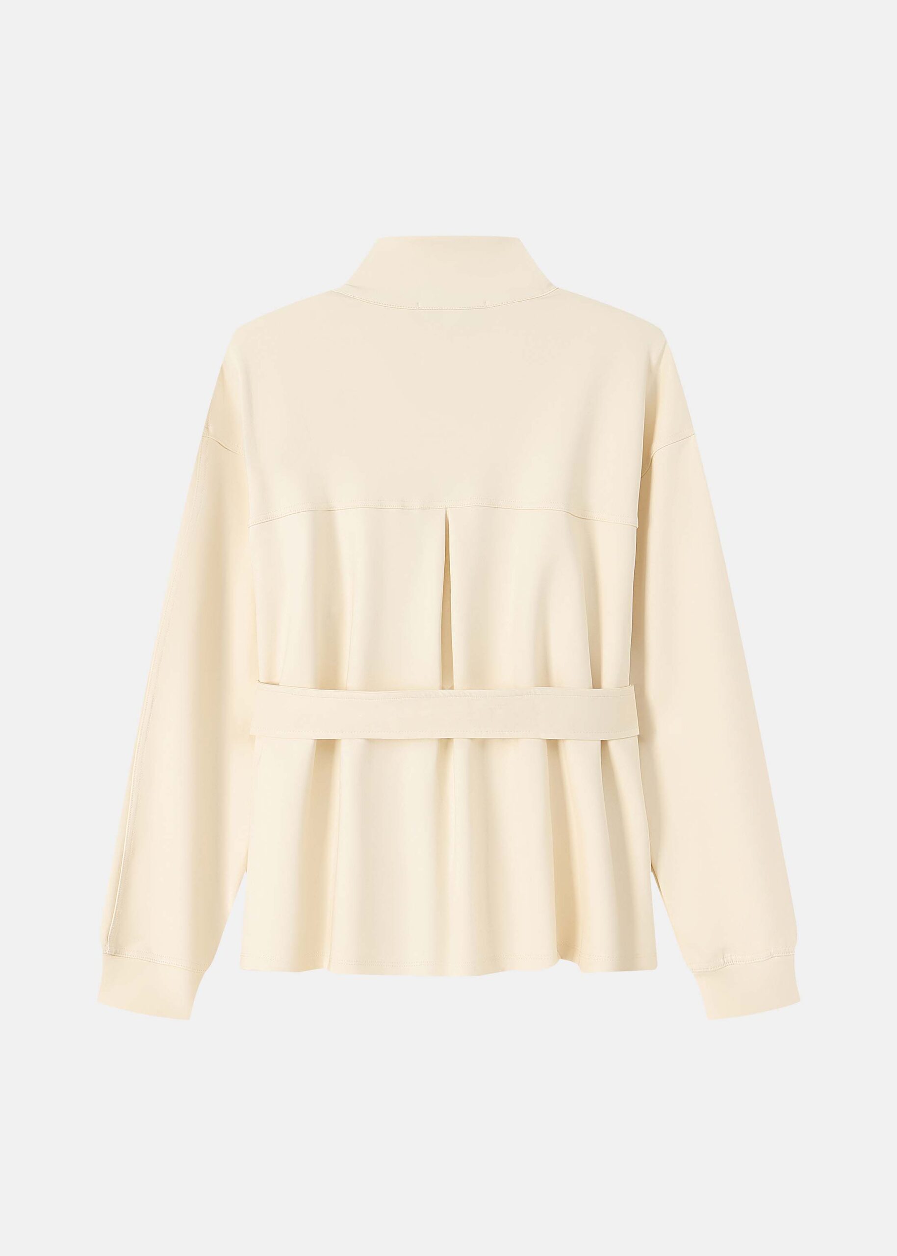 Women track jacket, scuba fabric, plain, stand collar, front zipper closure, long sleeves with tight cuff, fake front pockets, belt, unique and practical