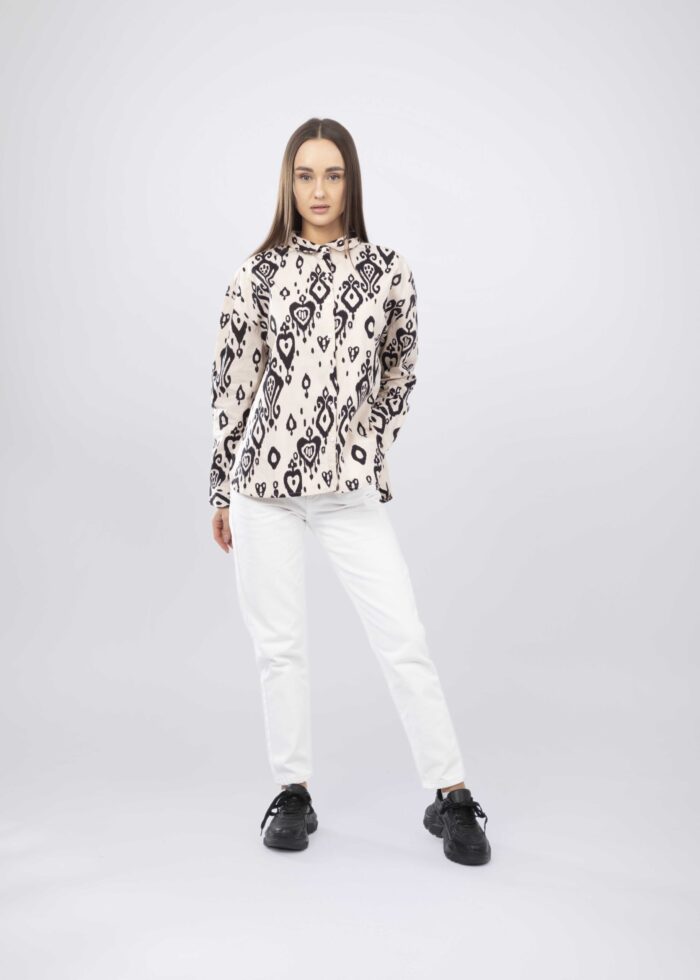 Women shirt, plain, front buttons to close, long sleeves with tight cuff, rolled collar, unique and practical