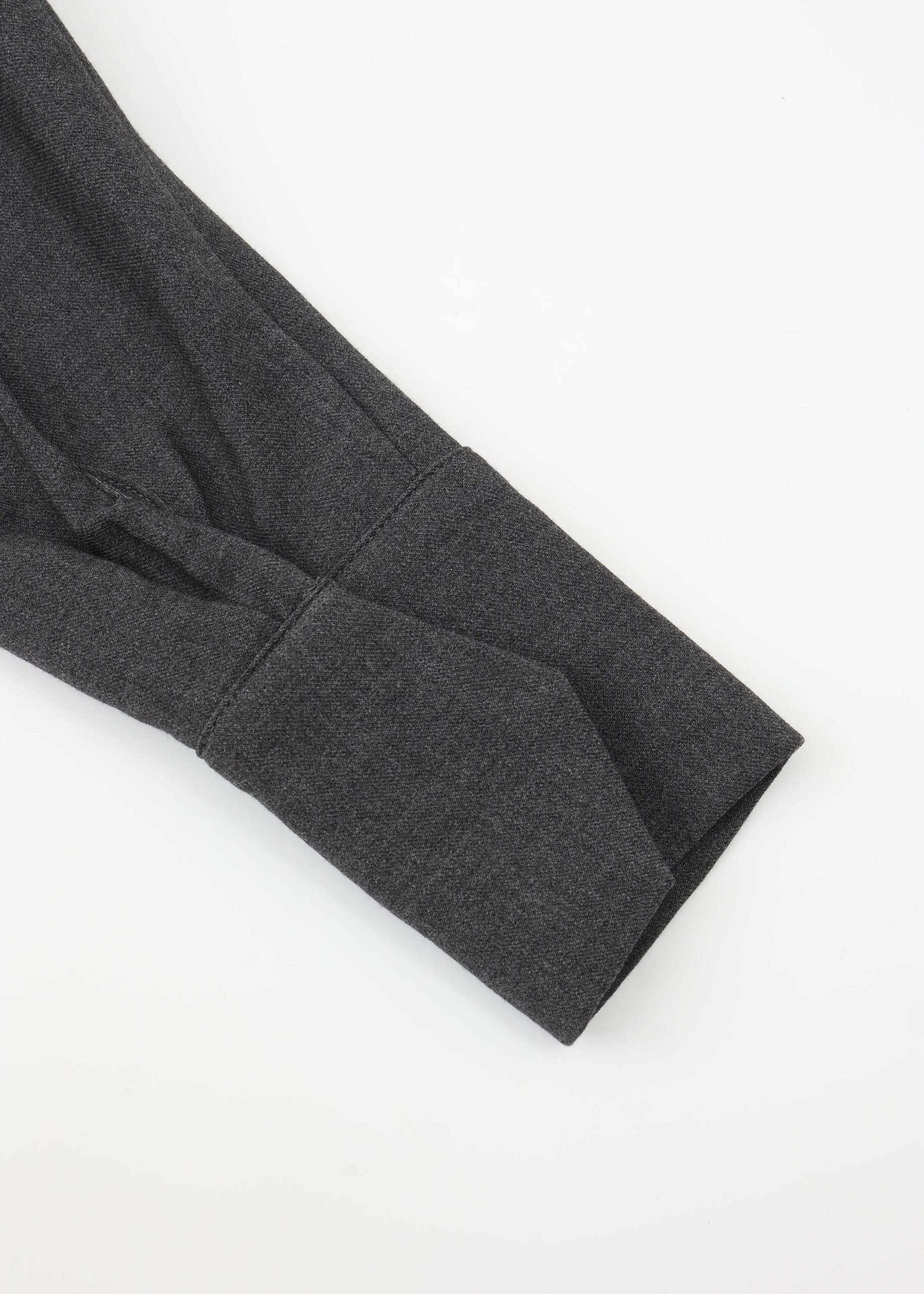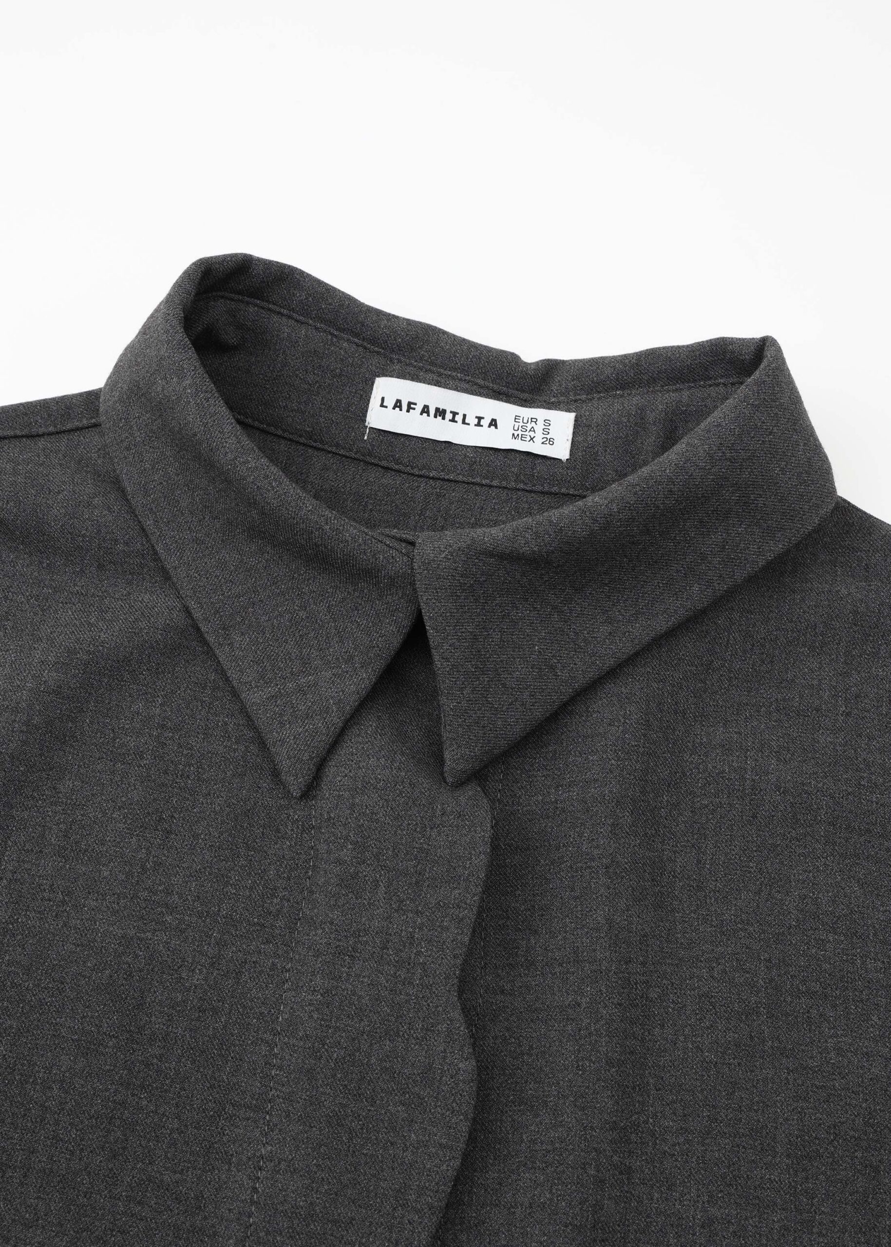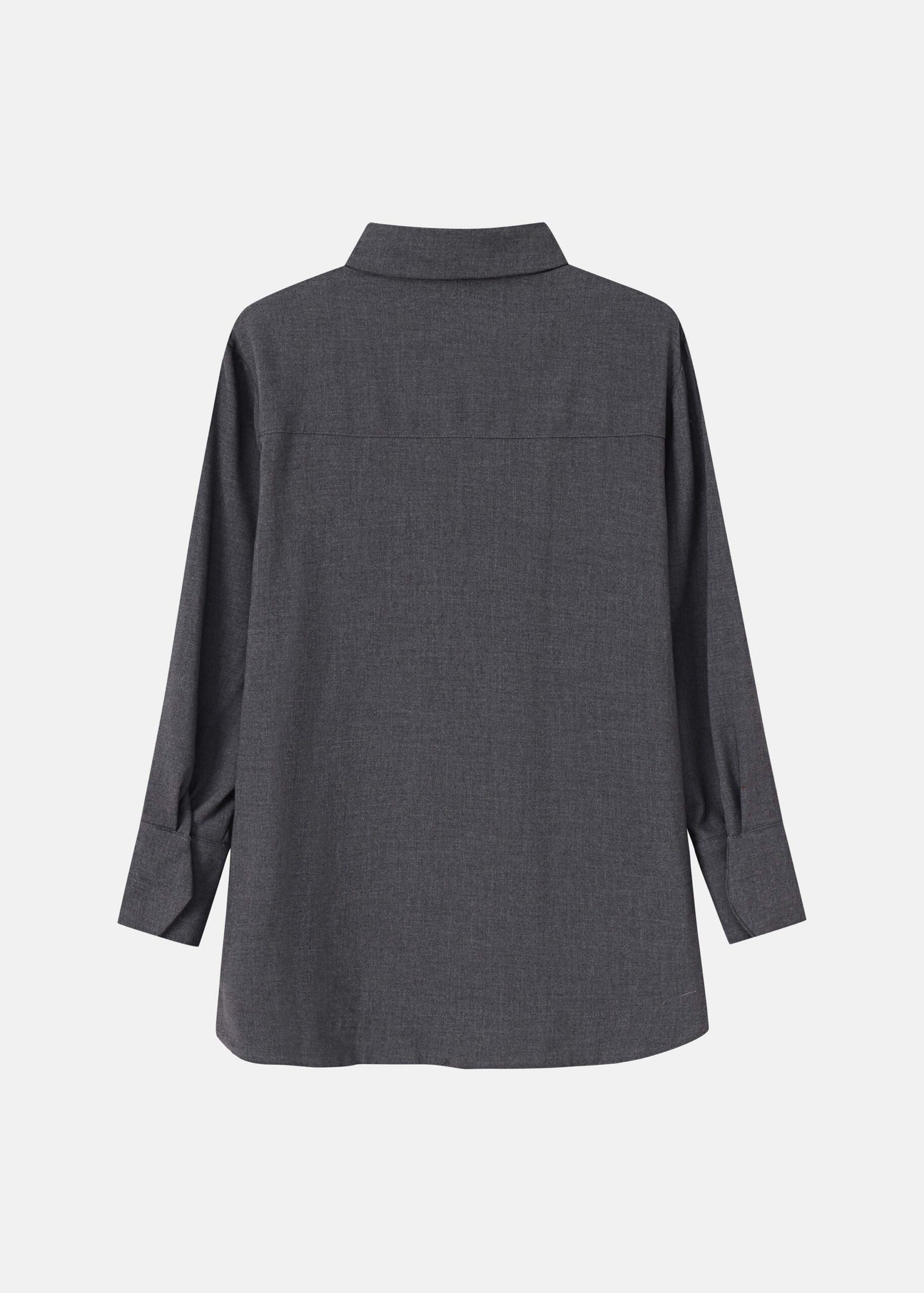 Women shirt, plain, rolled collar with front buttons, asymmetrically cut with front buttons to close, long sleeves, tight cuff with buttons, unique and practical