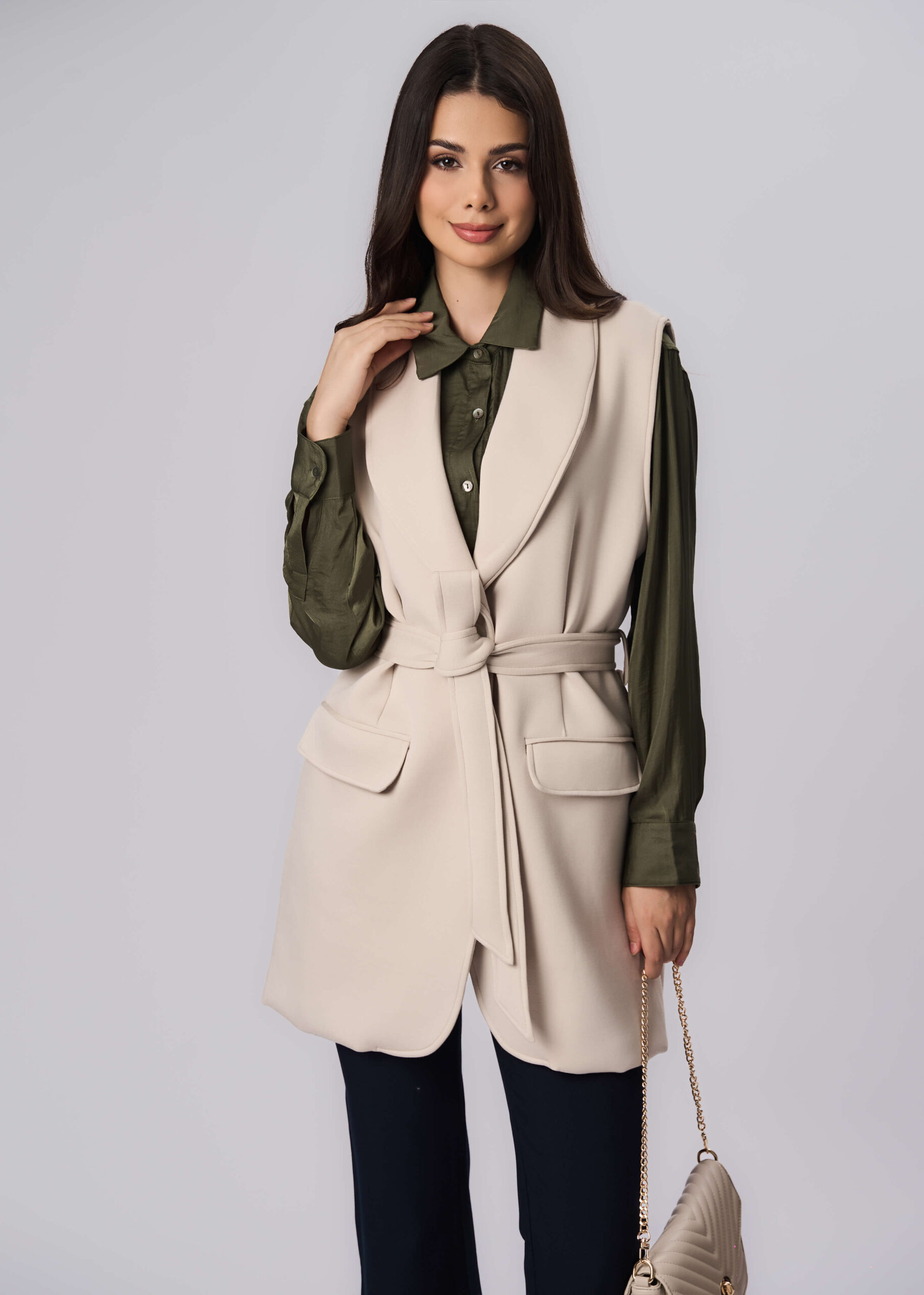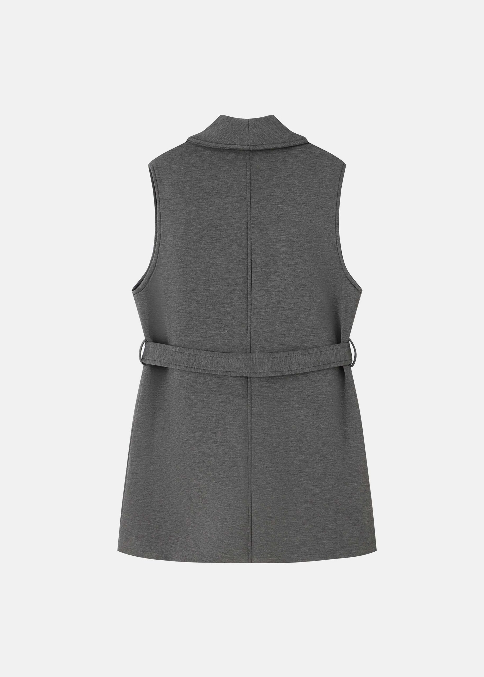 Women vest, plain, rolled collar with V neck, sleeveless, front button to close, front fake pockets, waist belt, unique and modern