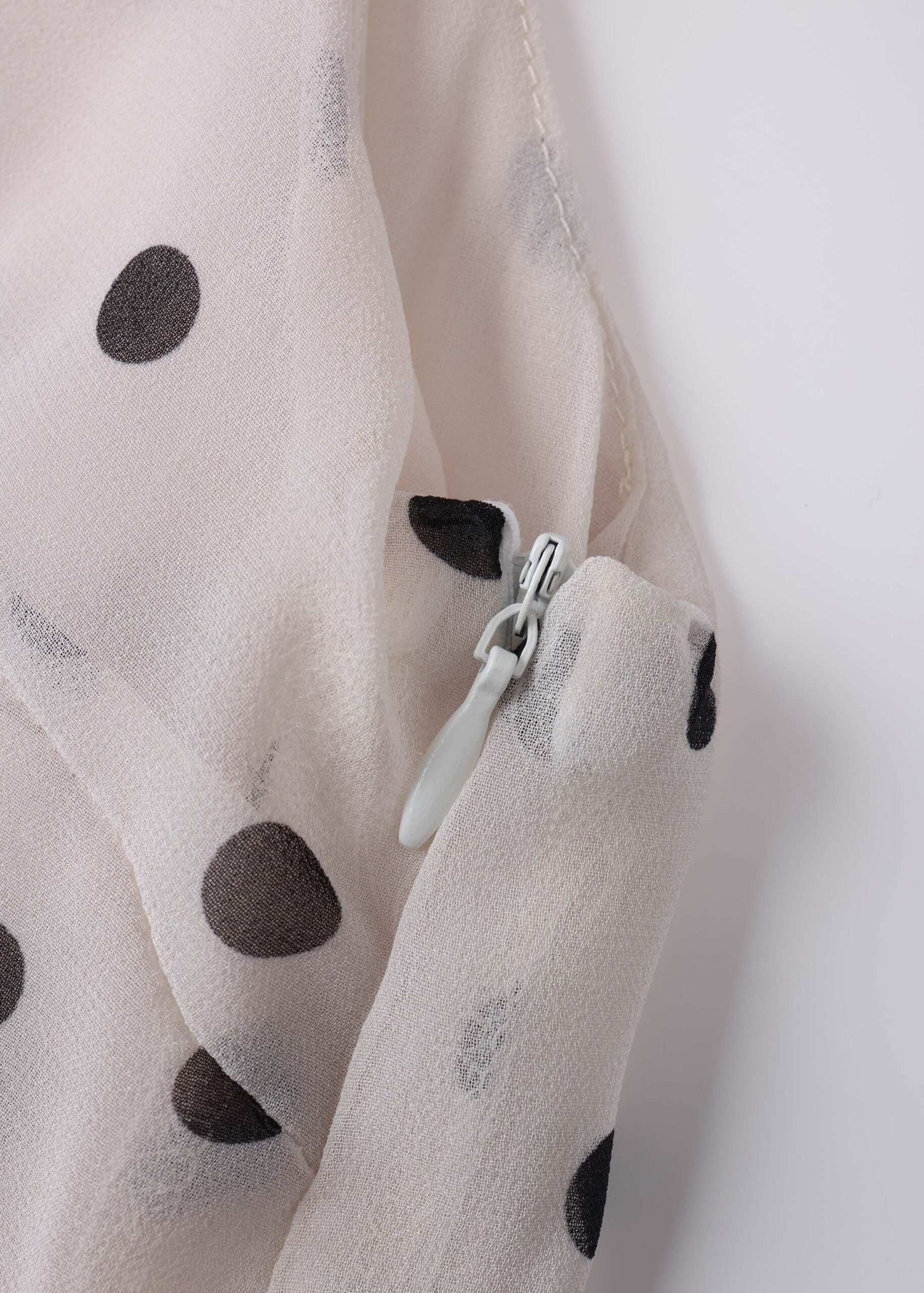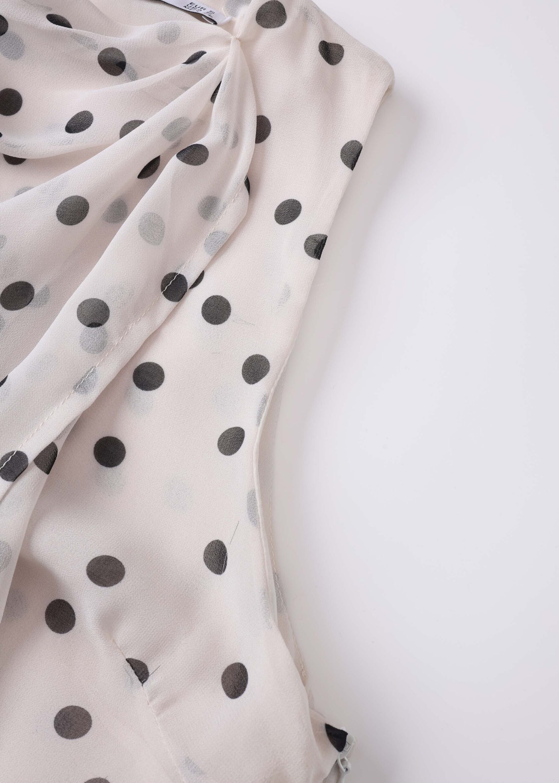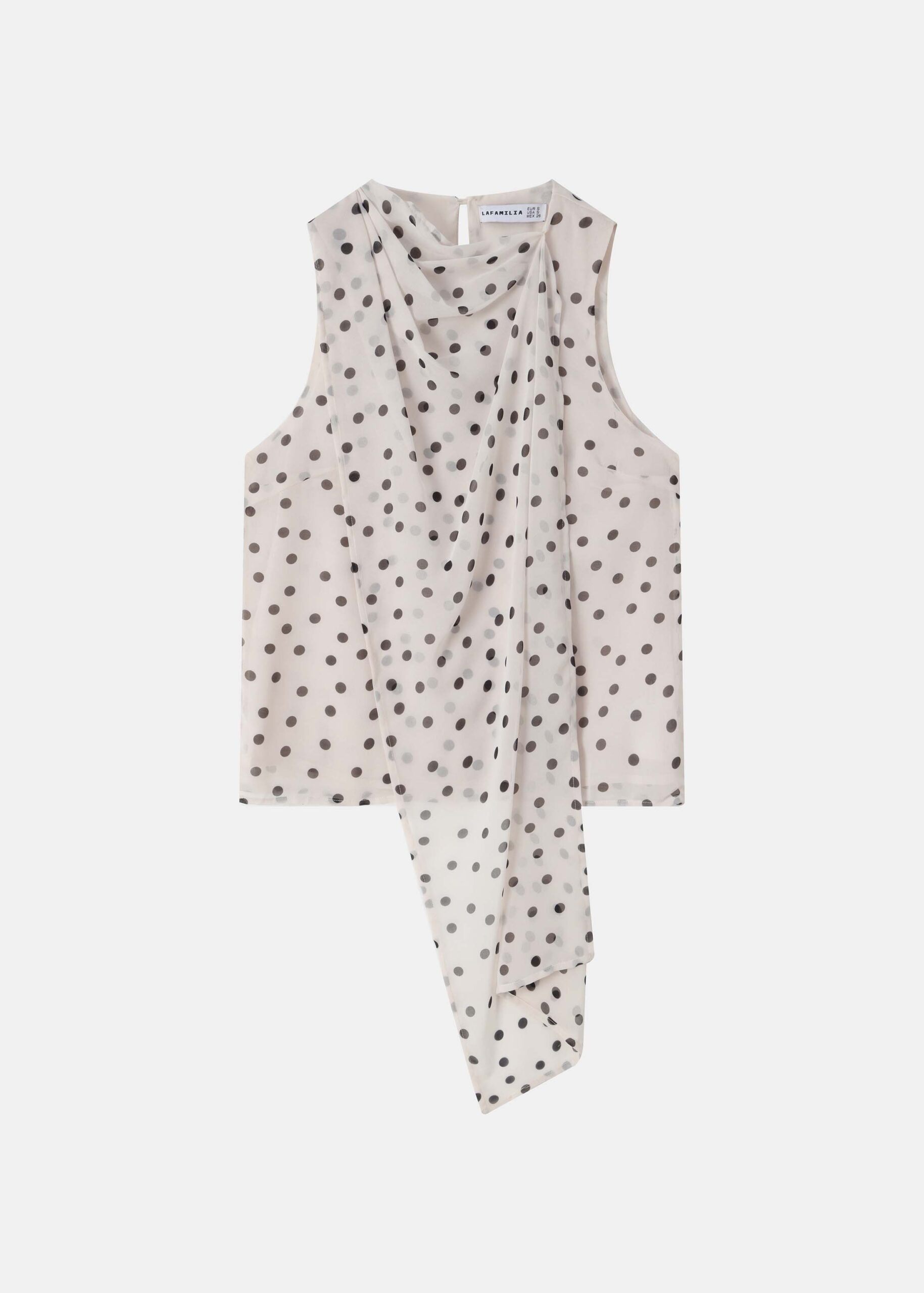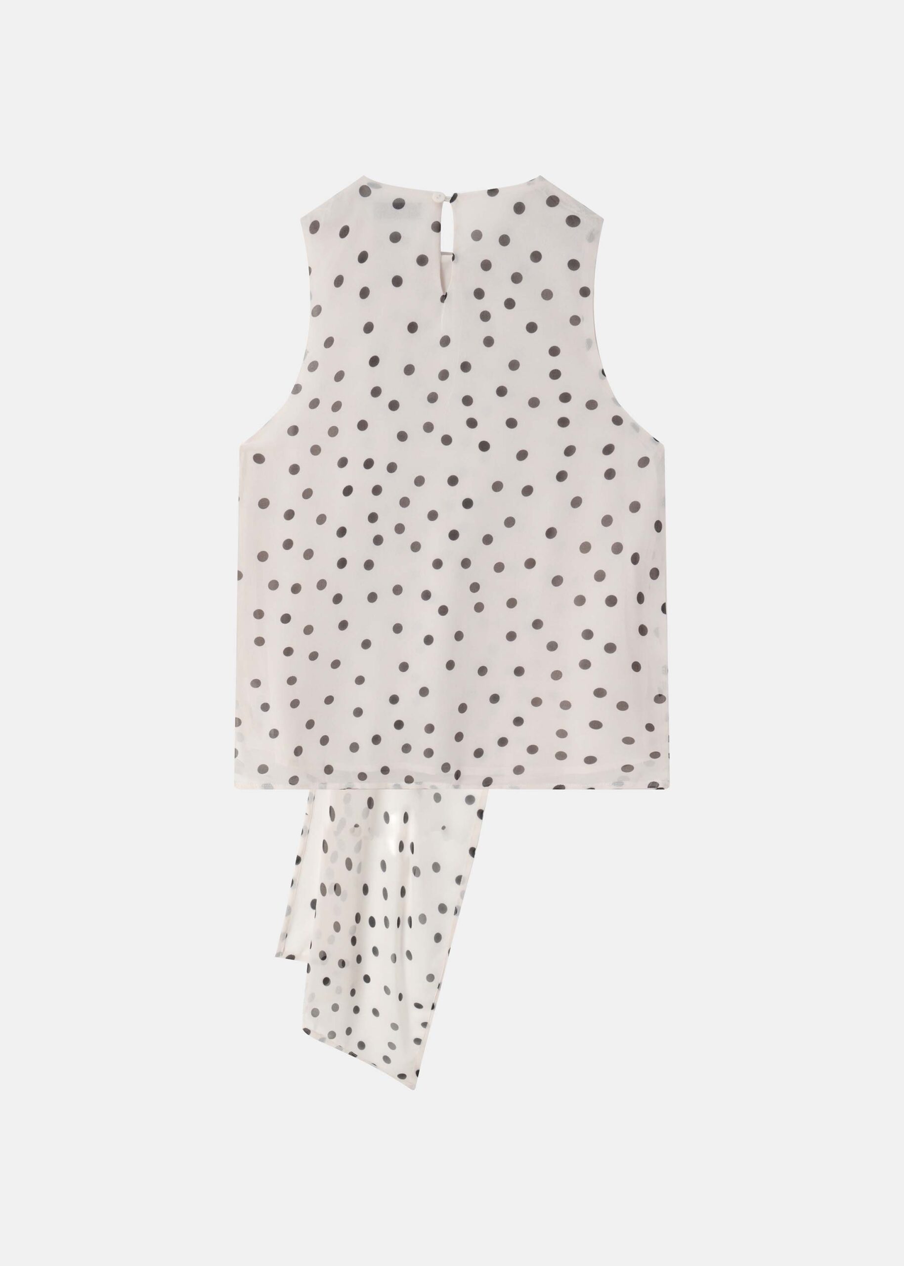 Women top, polka dot print, round neck with back button, sleeveless, front scarf design, unique and modern