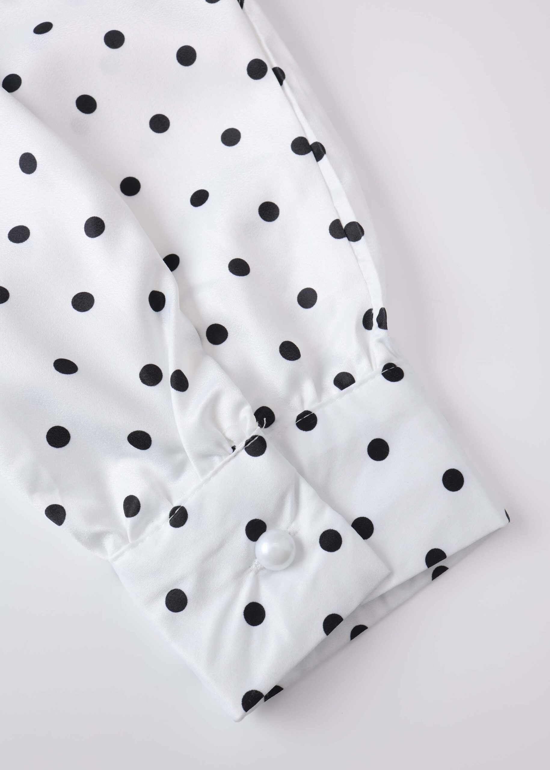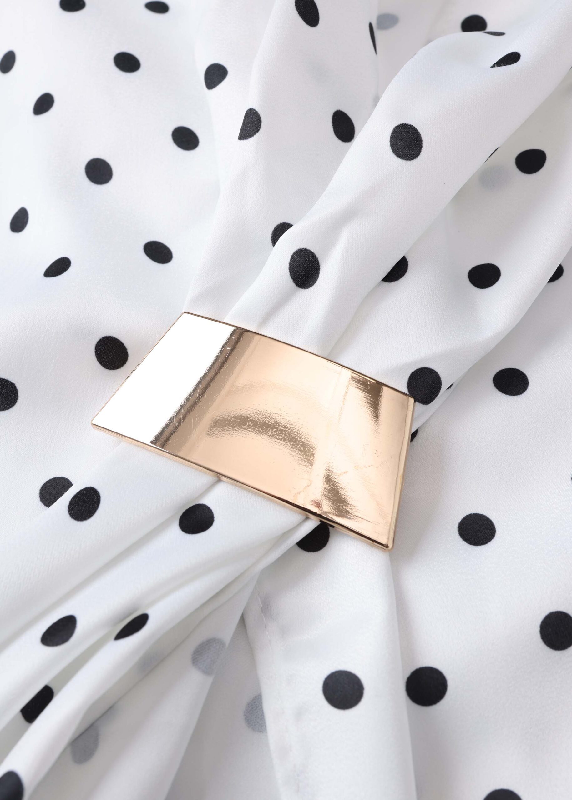 Women blouse, satin, polka dot print, V neck with front tie and metal piece decor, front buttons, long sleeves with tight cuff, unique and modern