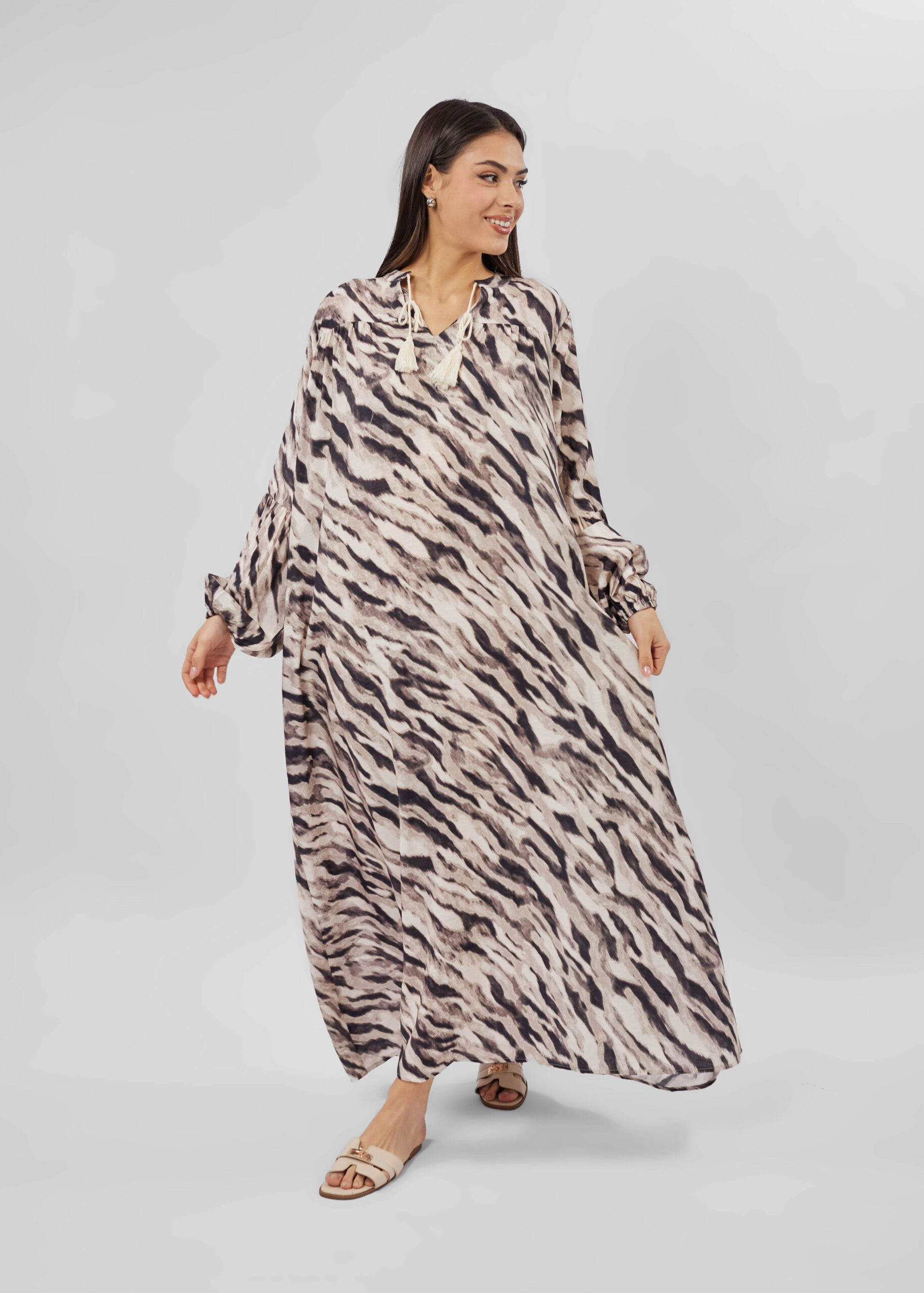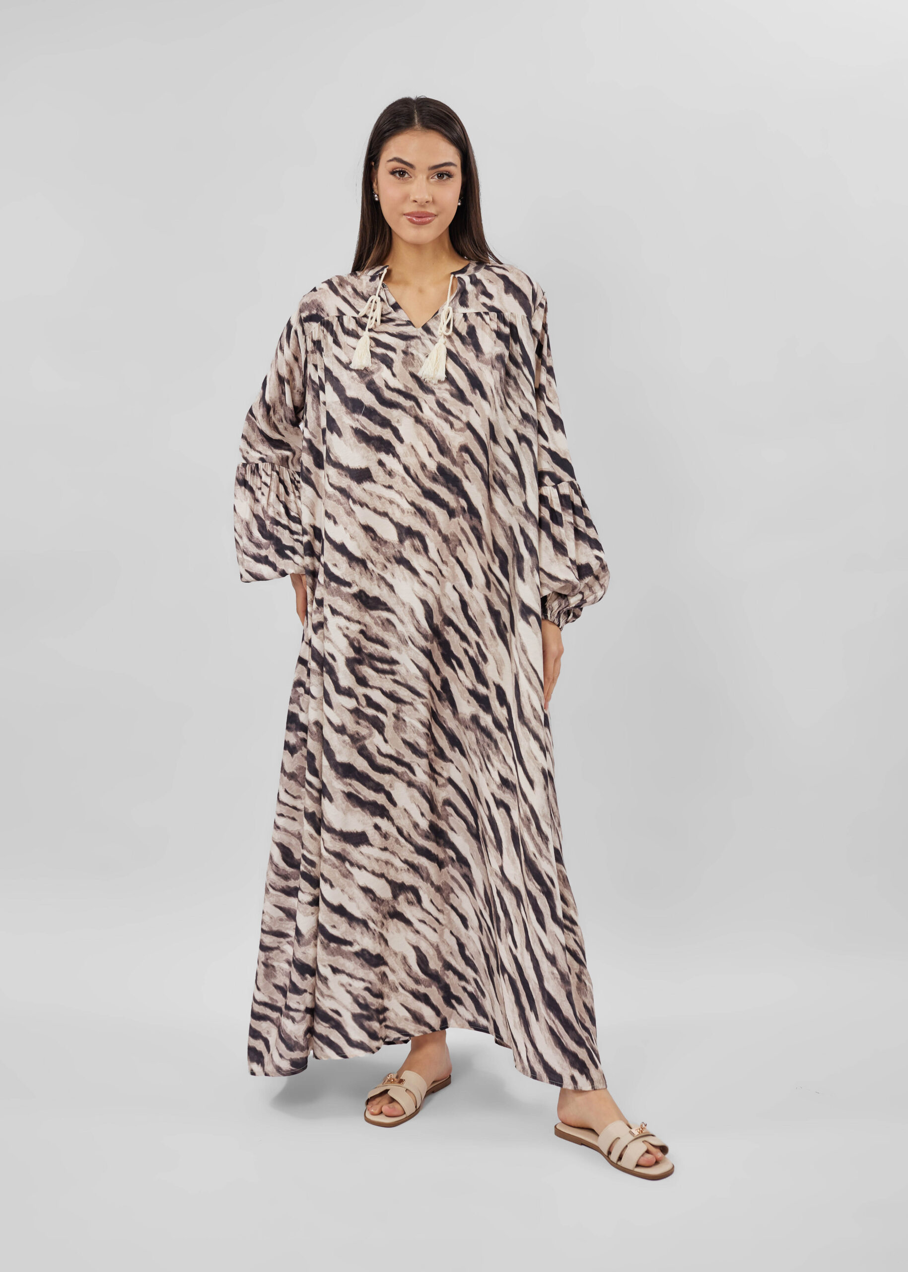 Women dress, long, printed, long sleeves with tight cuff, V neck with front tie, unique and practical