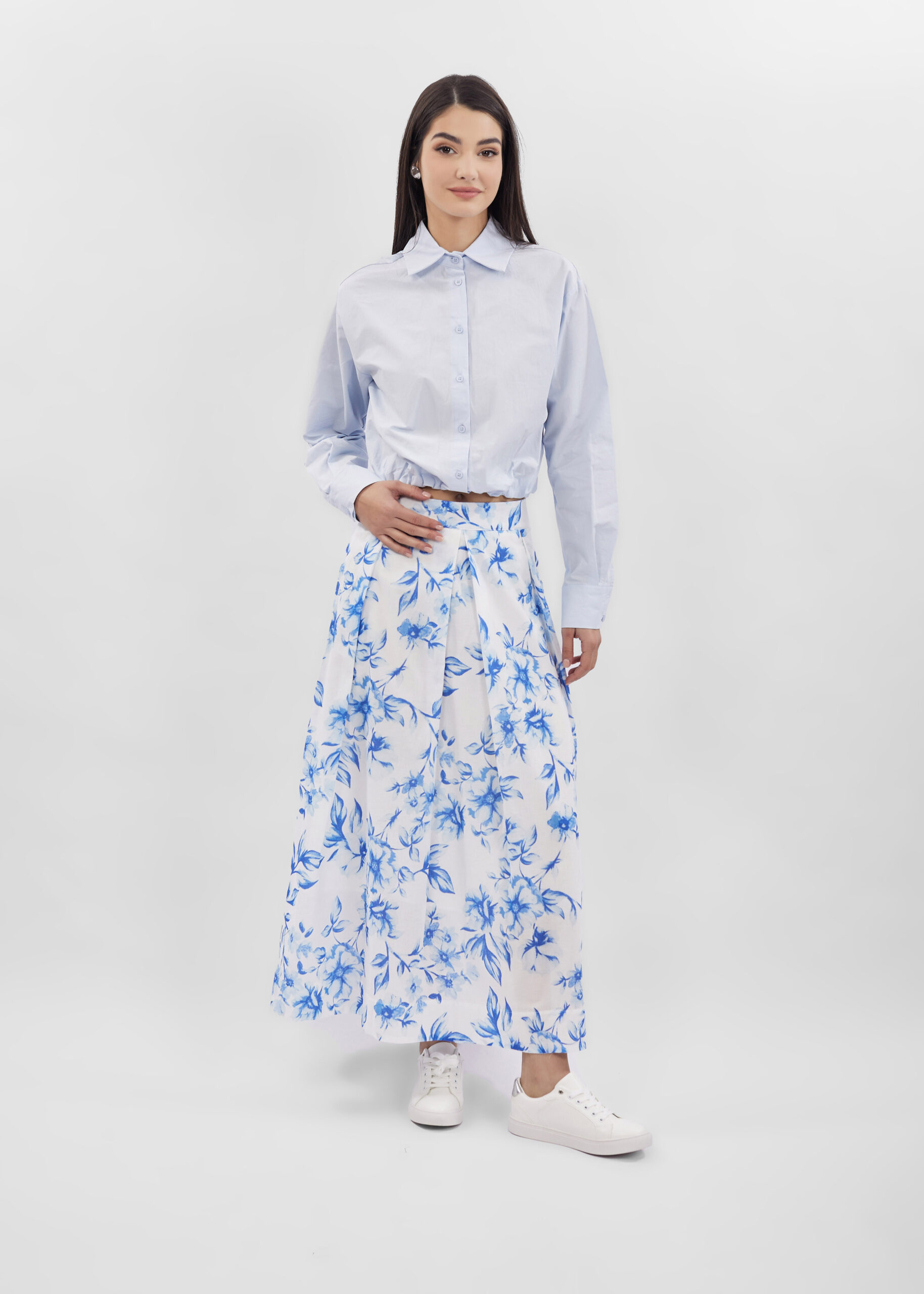 Women skirt, long, printed, pleated, front pockets, back zipper closure, unique and modern