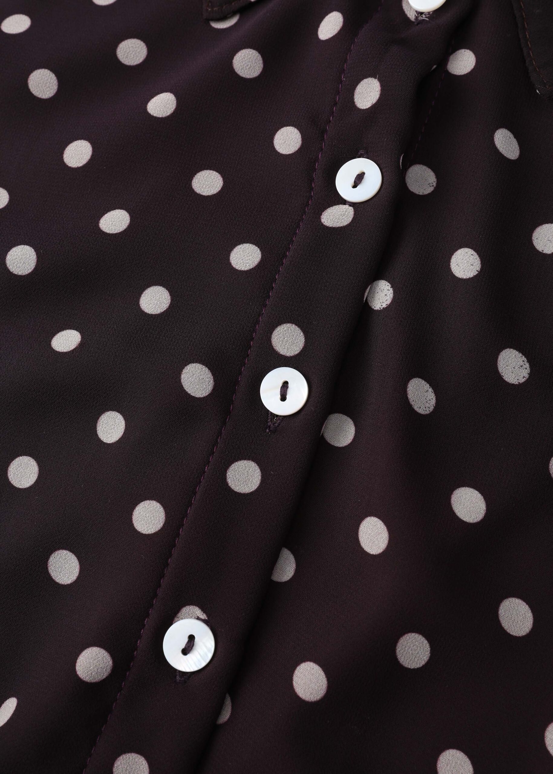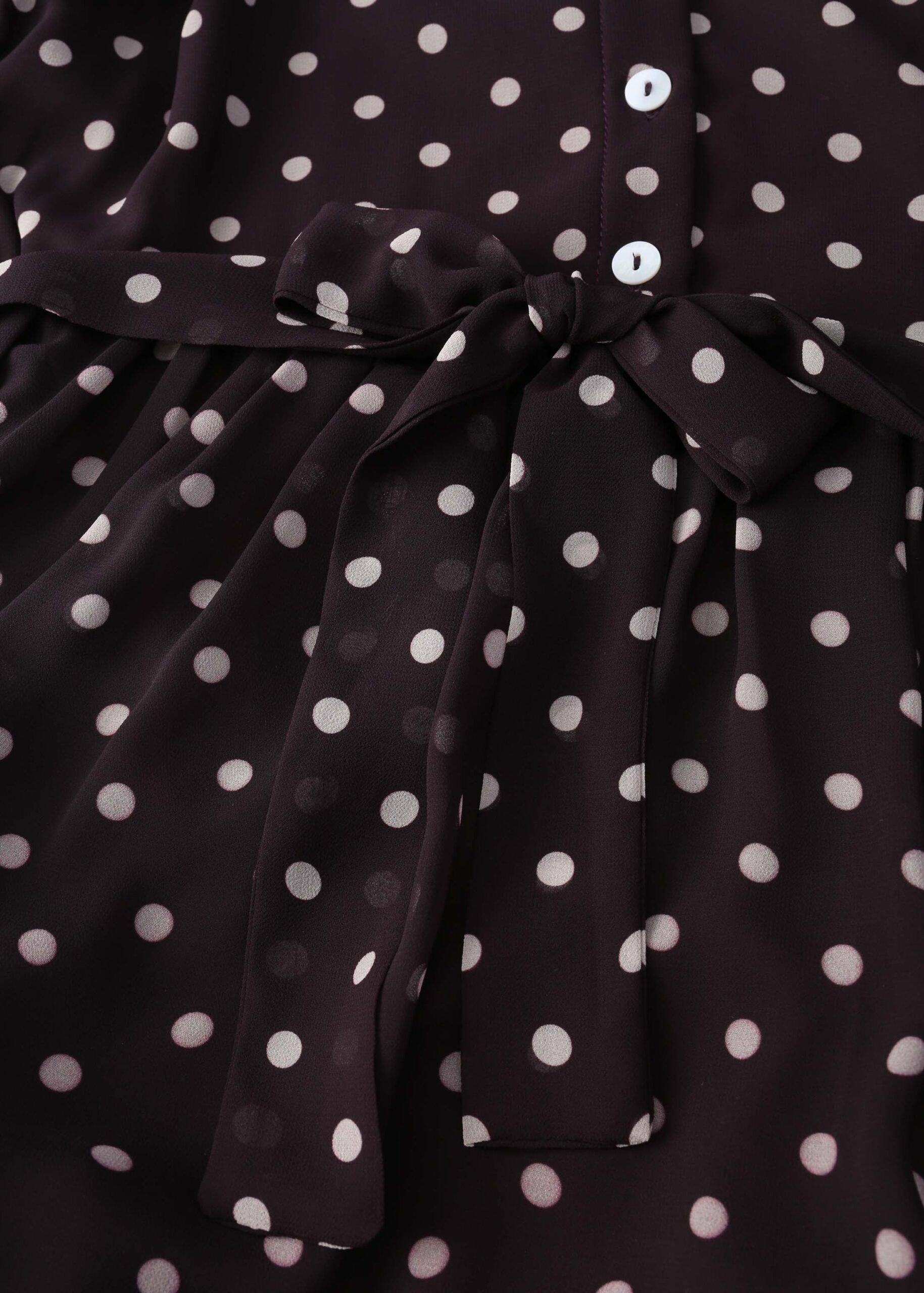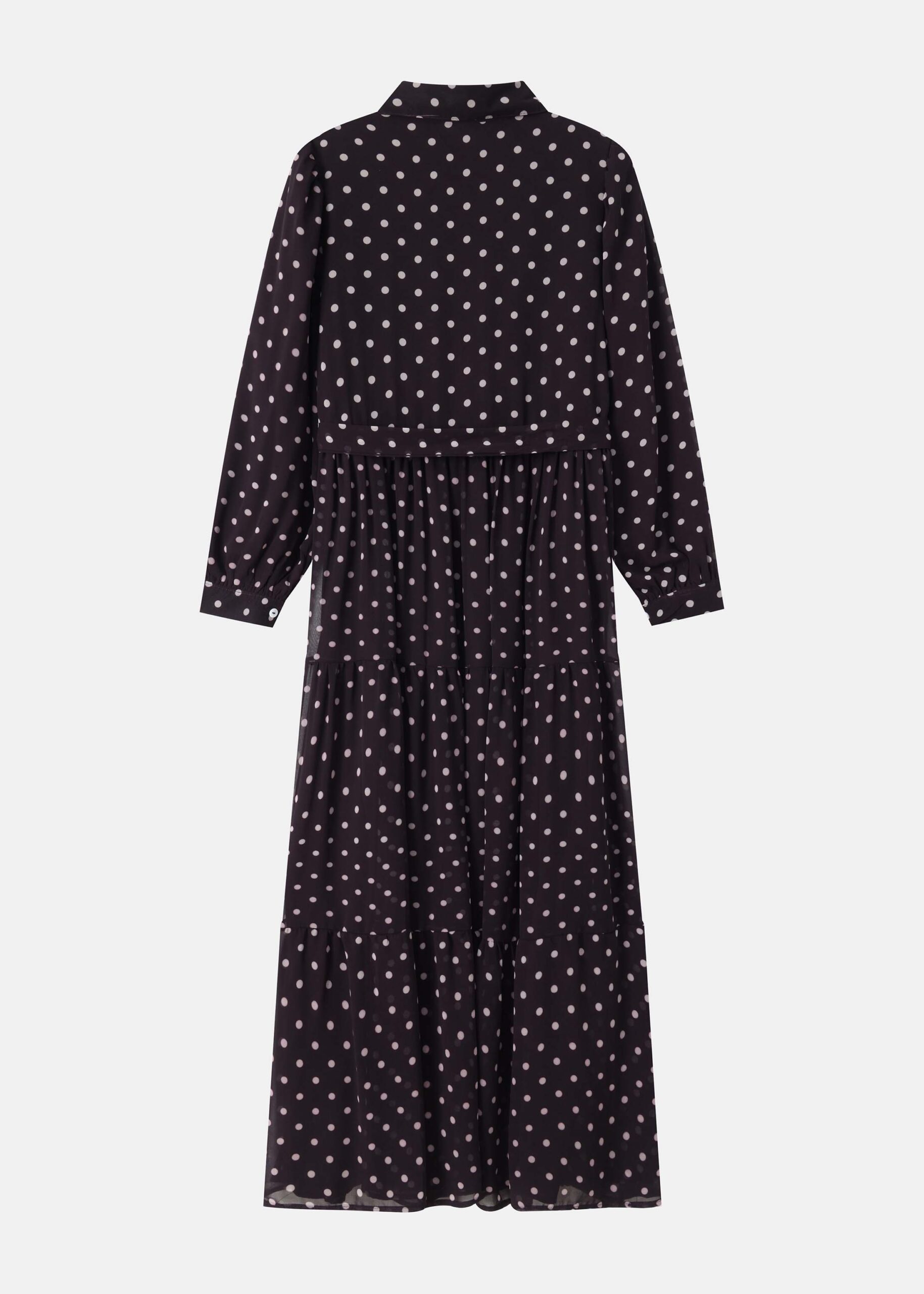 Women dress, long, dotted, rolled collar, front buttons to close, long sleeves with tight cuff, waist tie, layers design, unique and modern