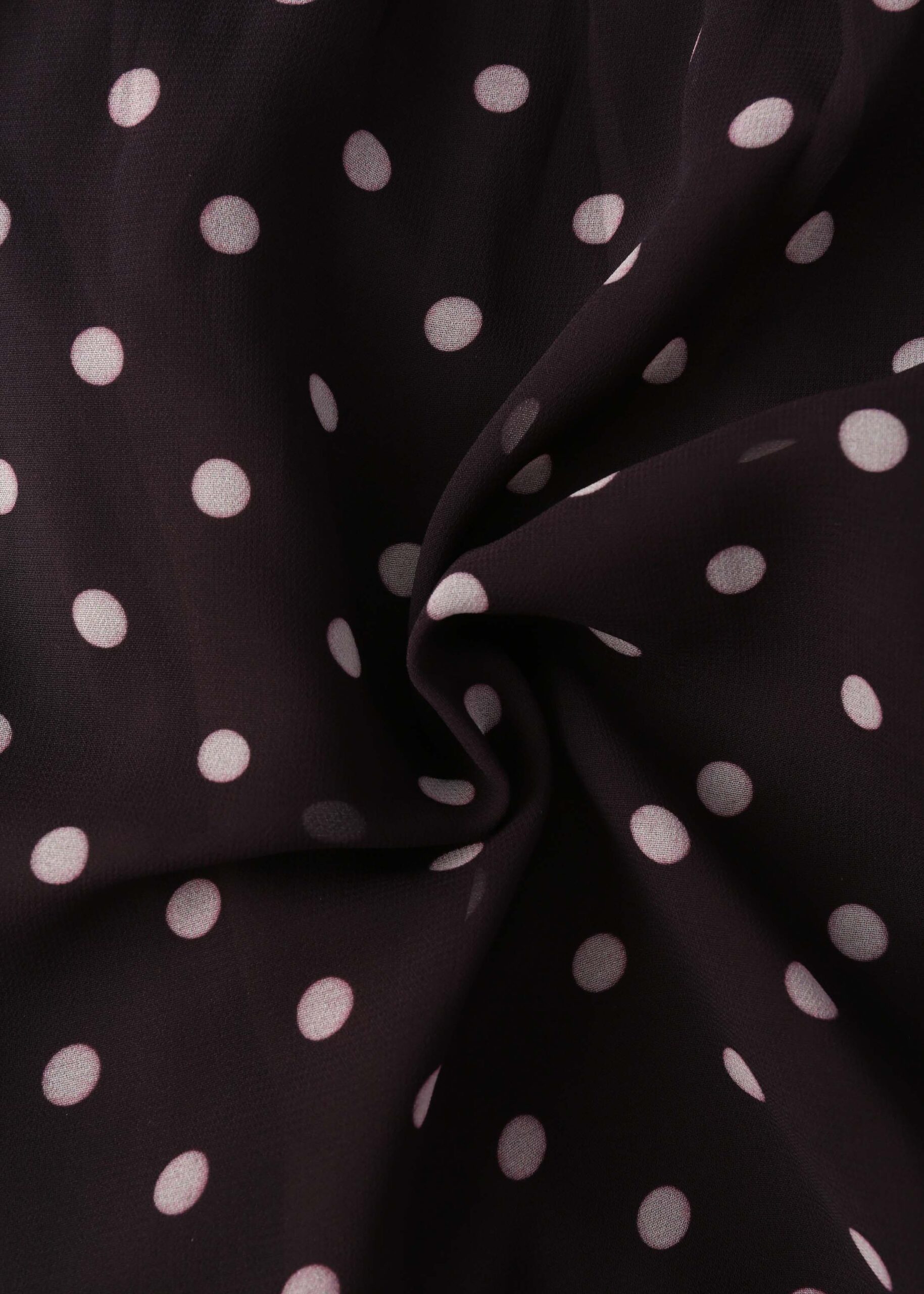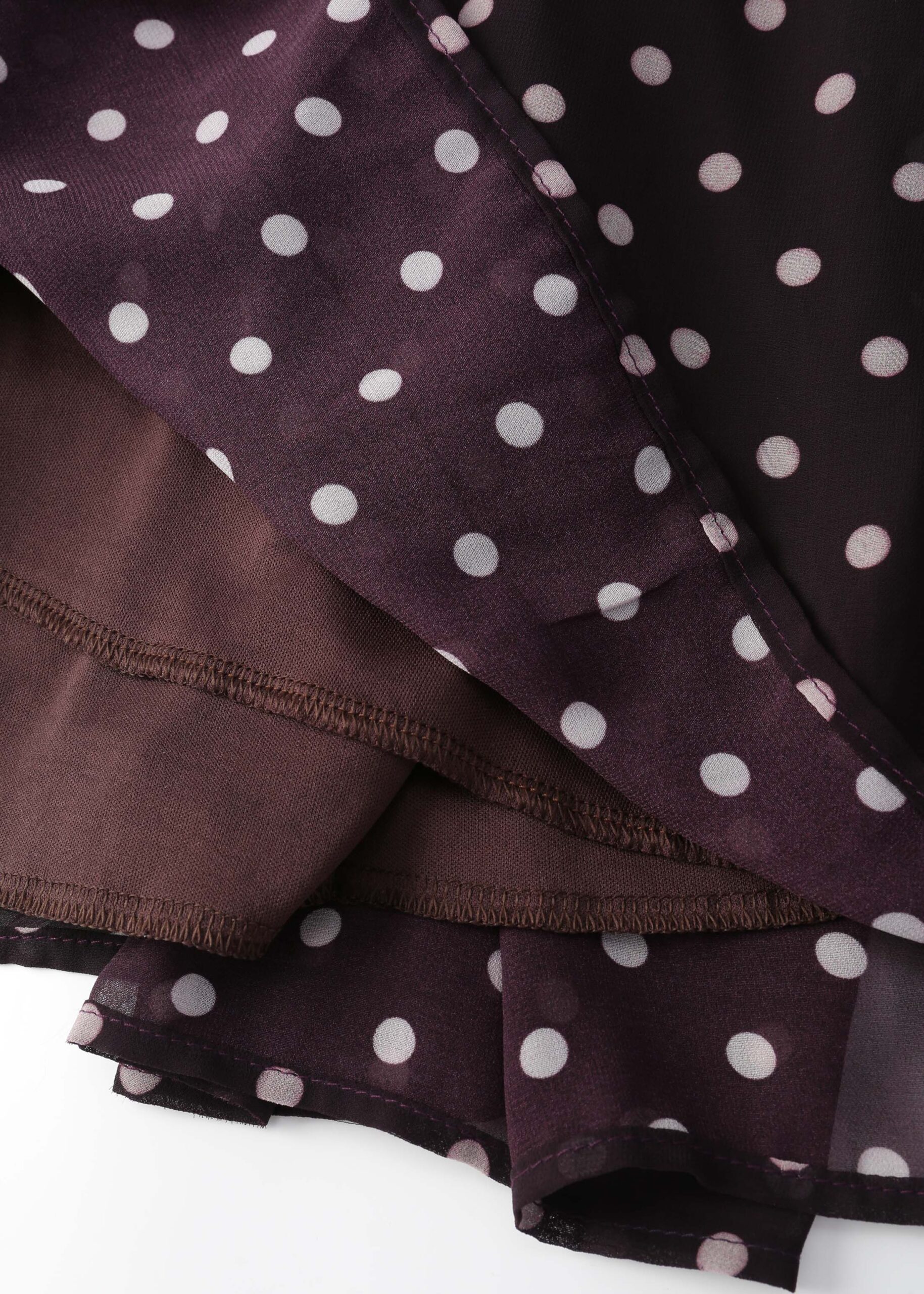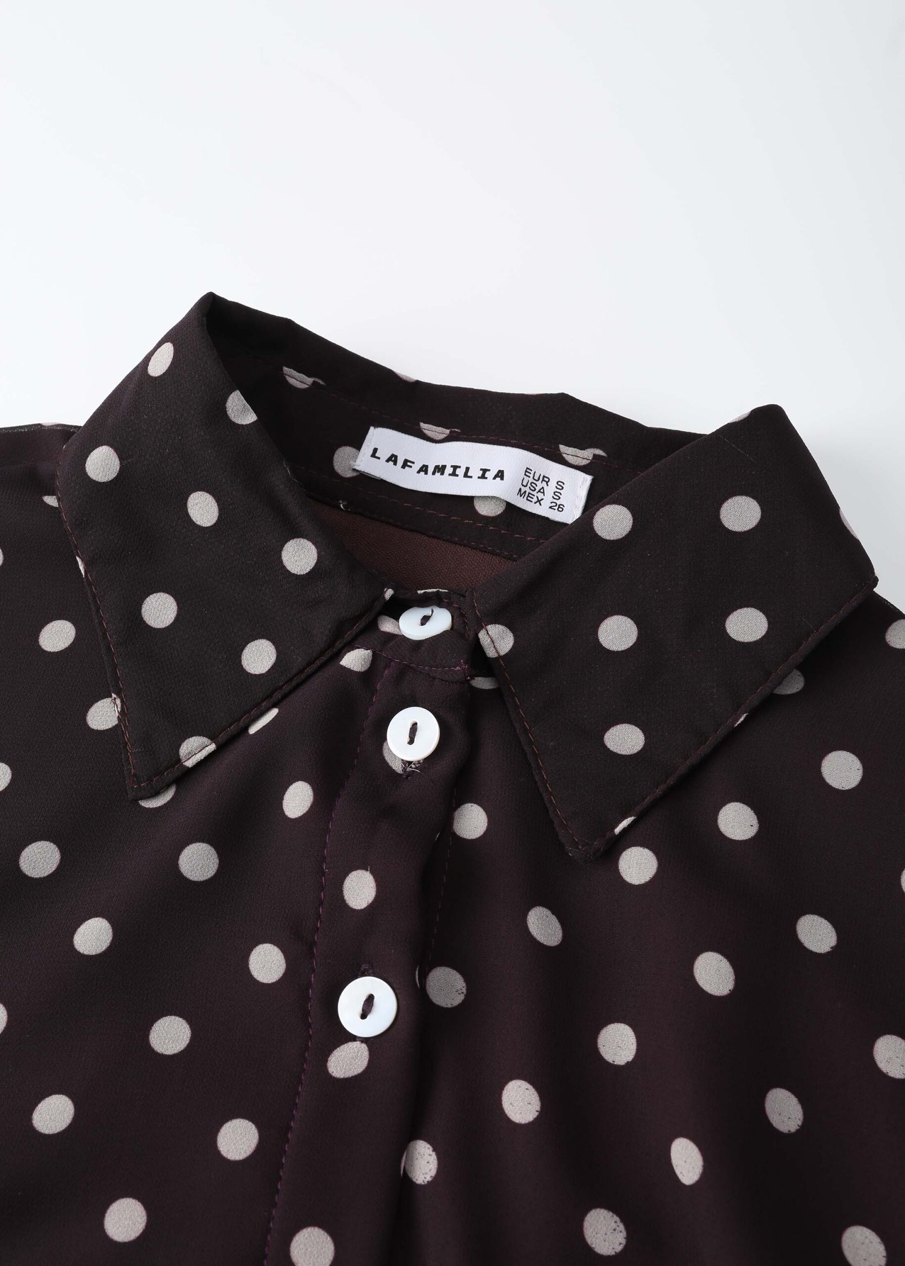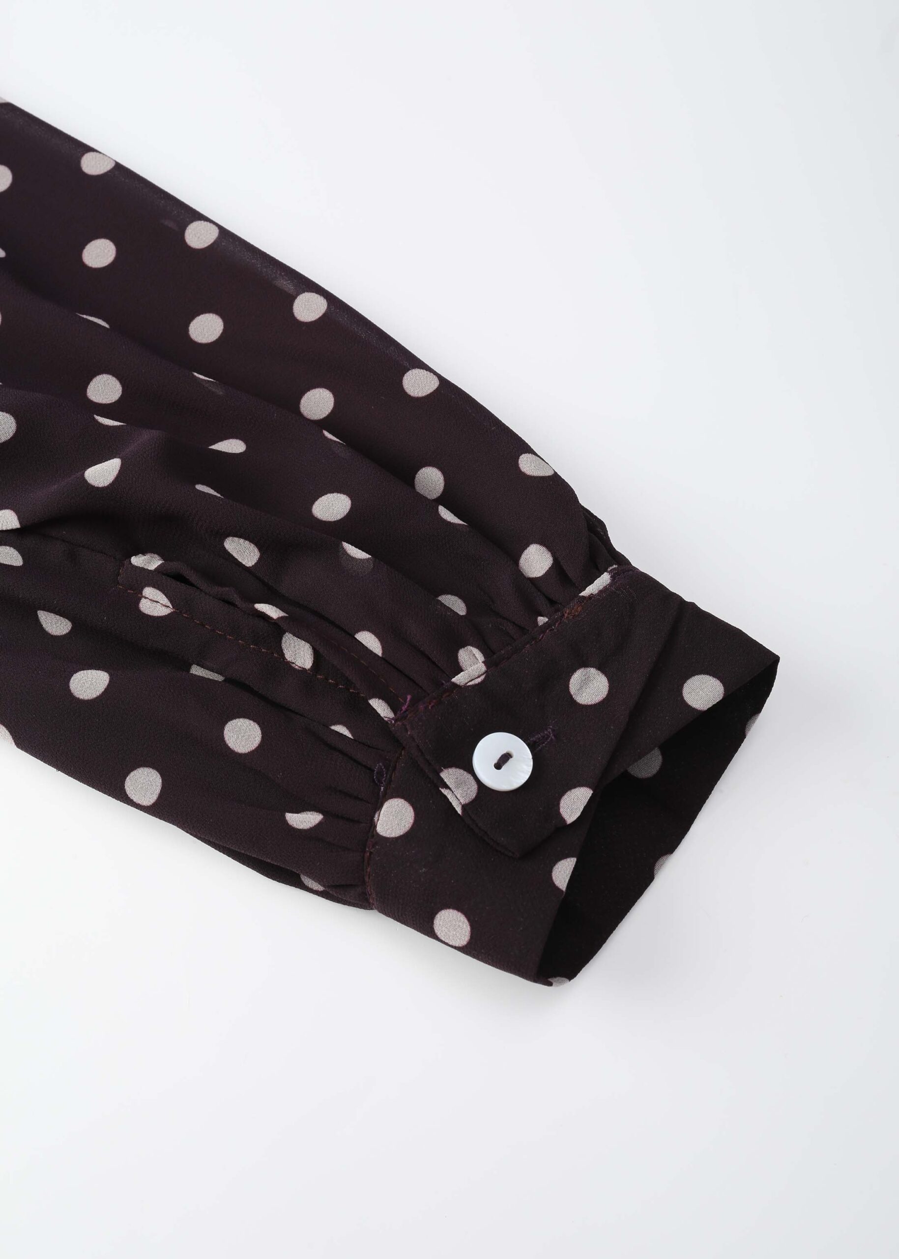 Women dress, long, dotted, rolled collar, front buttons to close, long sleeves with tight cuff, waist tie, layers design, unique and modern