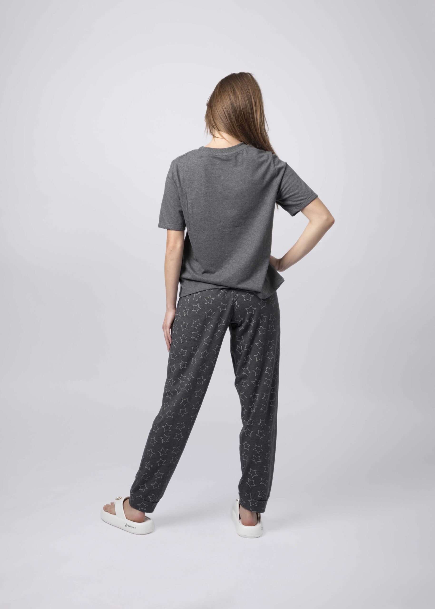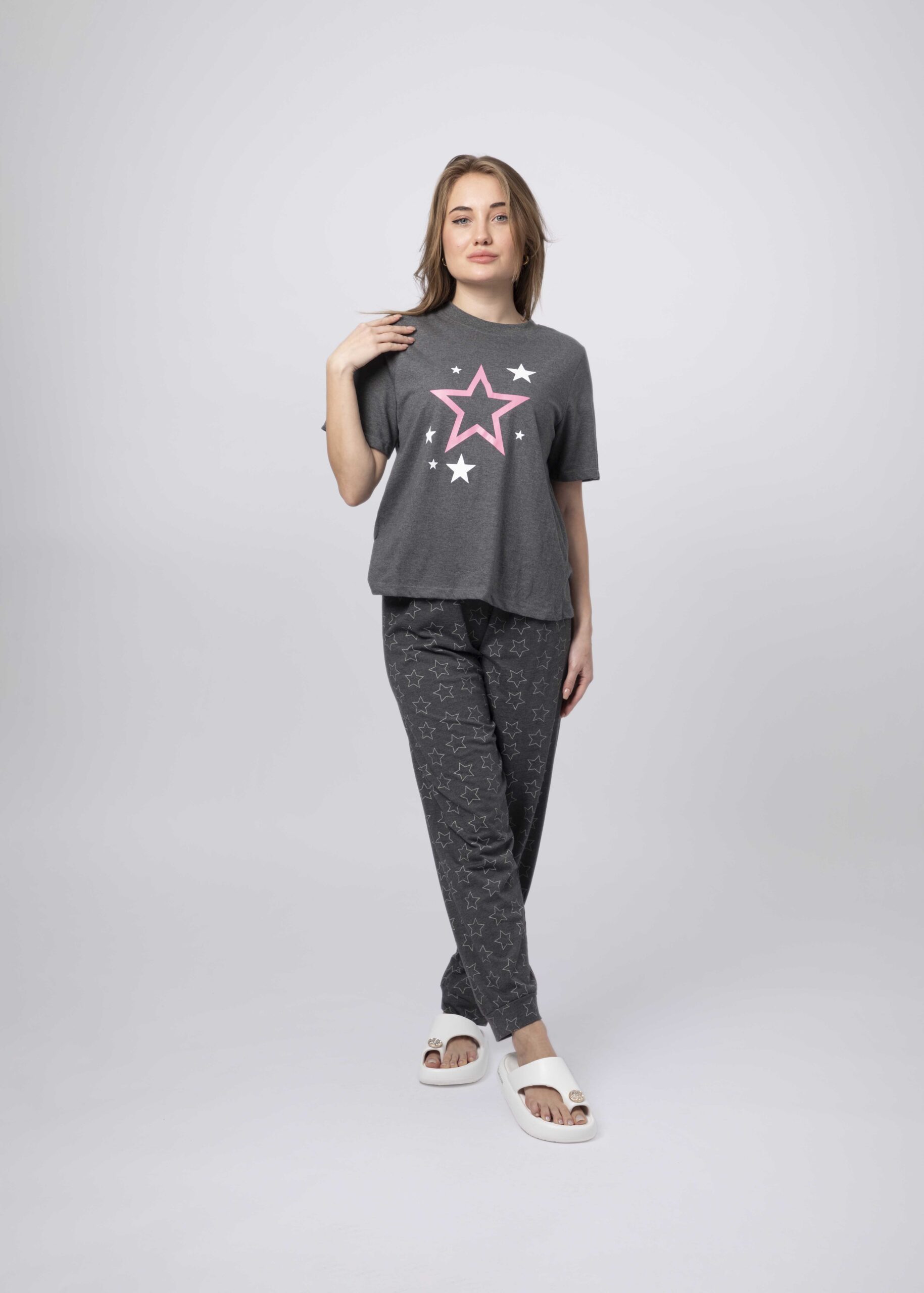 Women pajama, two-pieces, printed, t-shirt, round neck, short sleeves, trouser, elastic waist, comfortable and practical