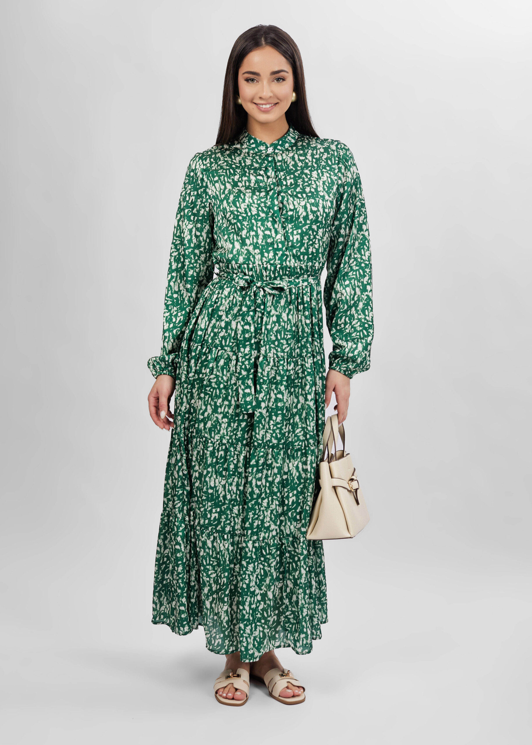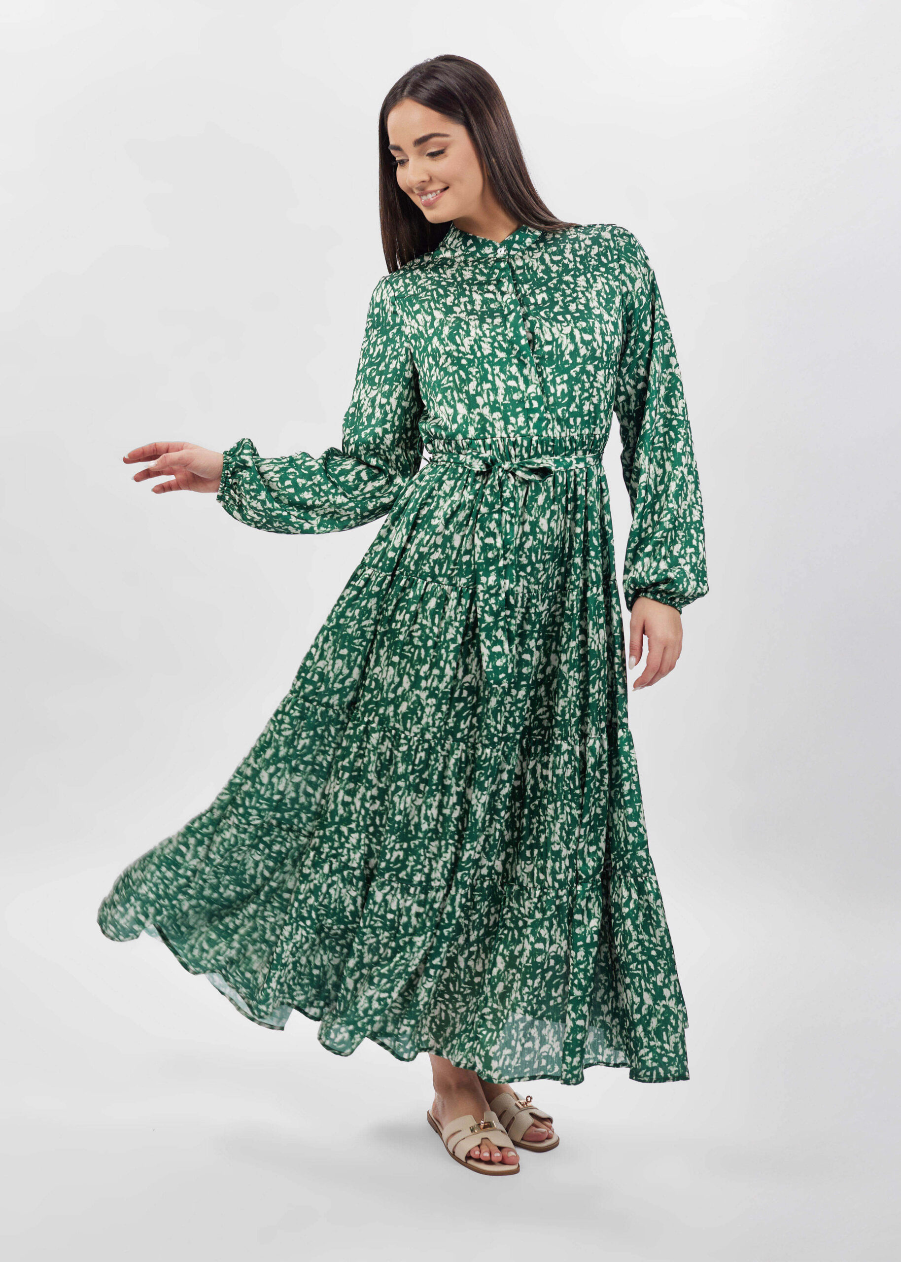 Women dress, printed, long, long sleeves with tight cuff, round neck with front buttons, pleated waist, waist belt, layers design, unique and practical