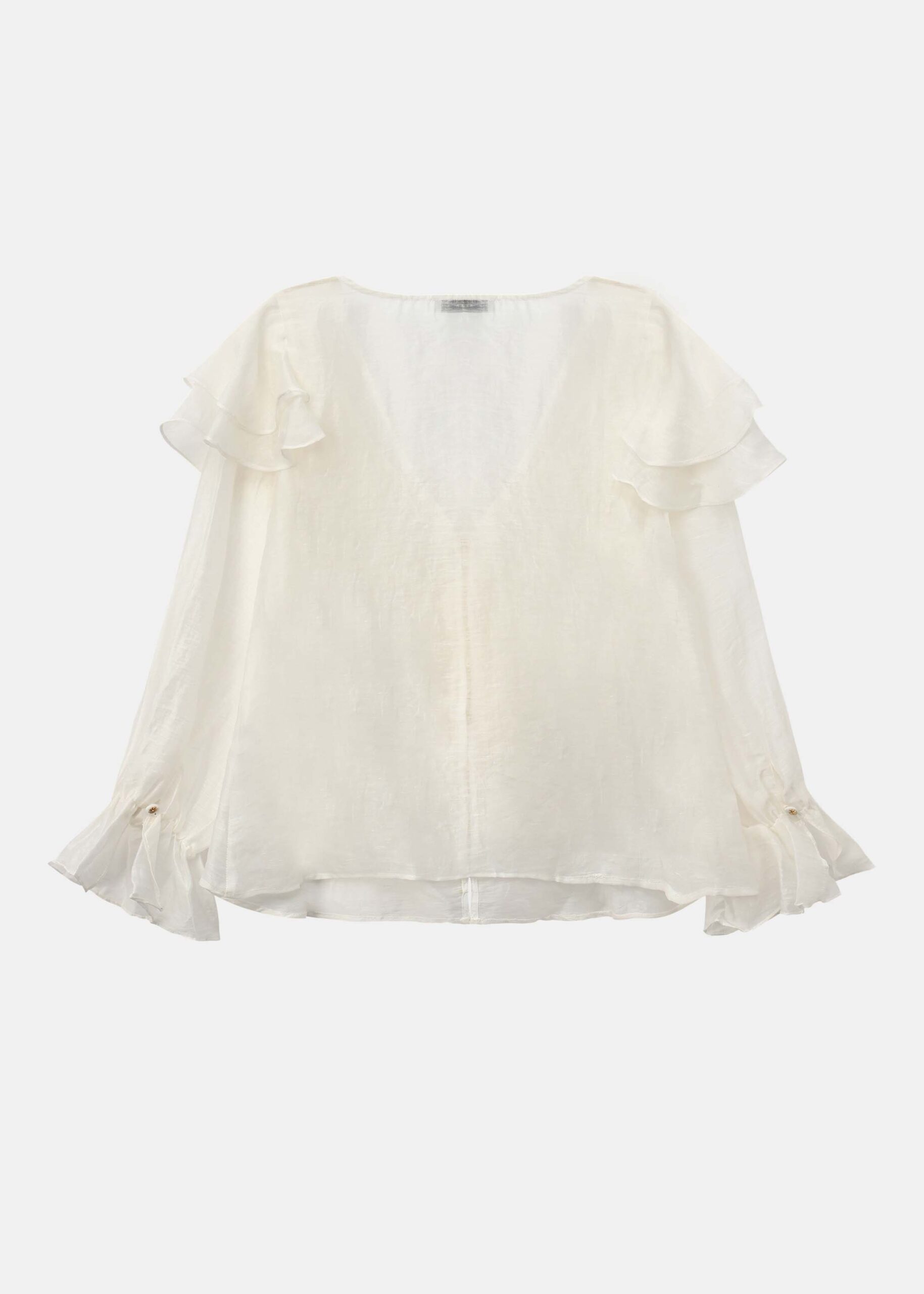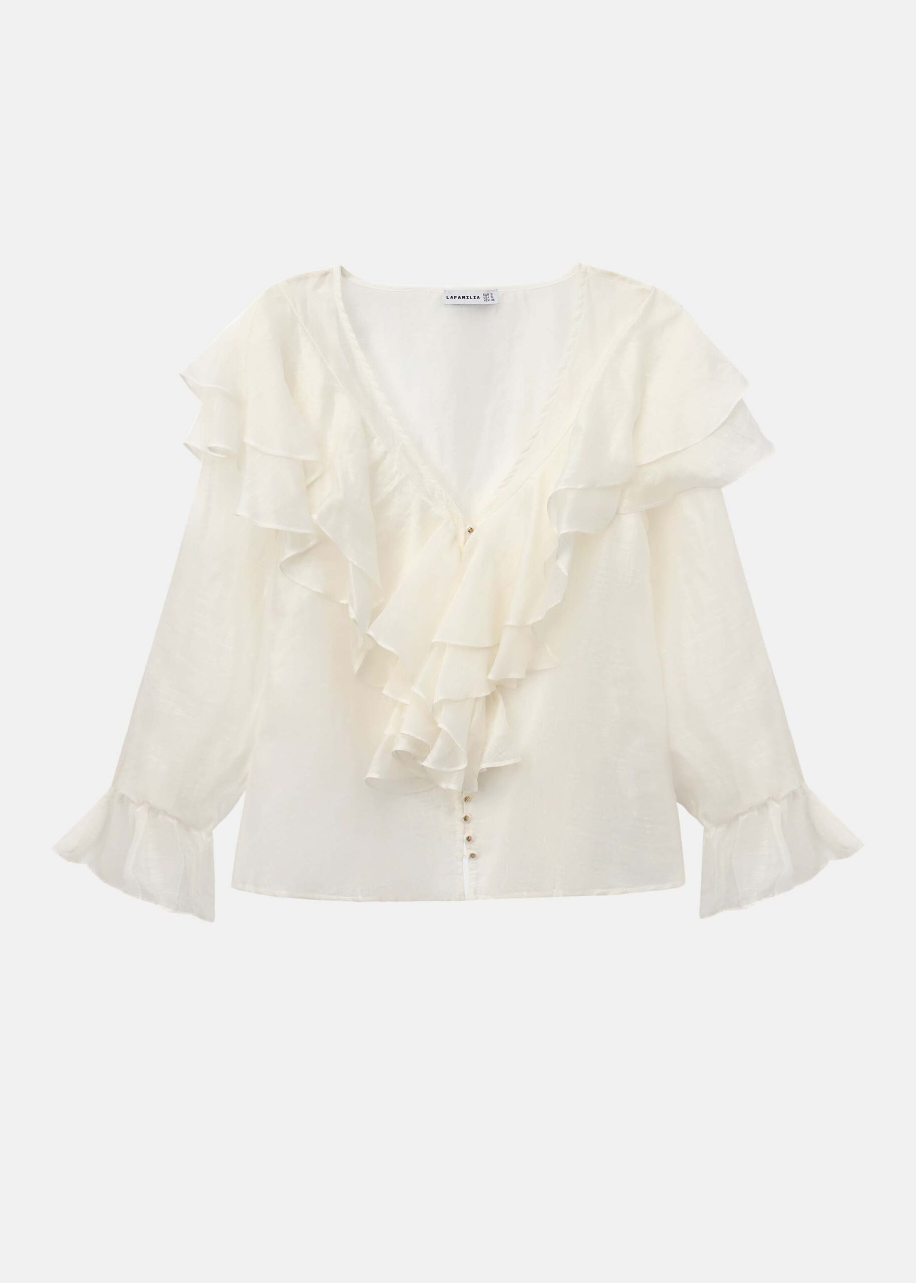 Women shirt, ruffled deocr, long sleeves with ruffled cuff, front buttons to close, V neck, unique and modern
