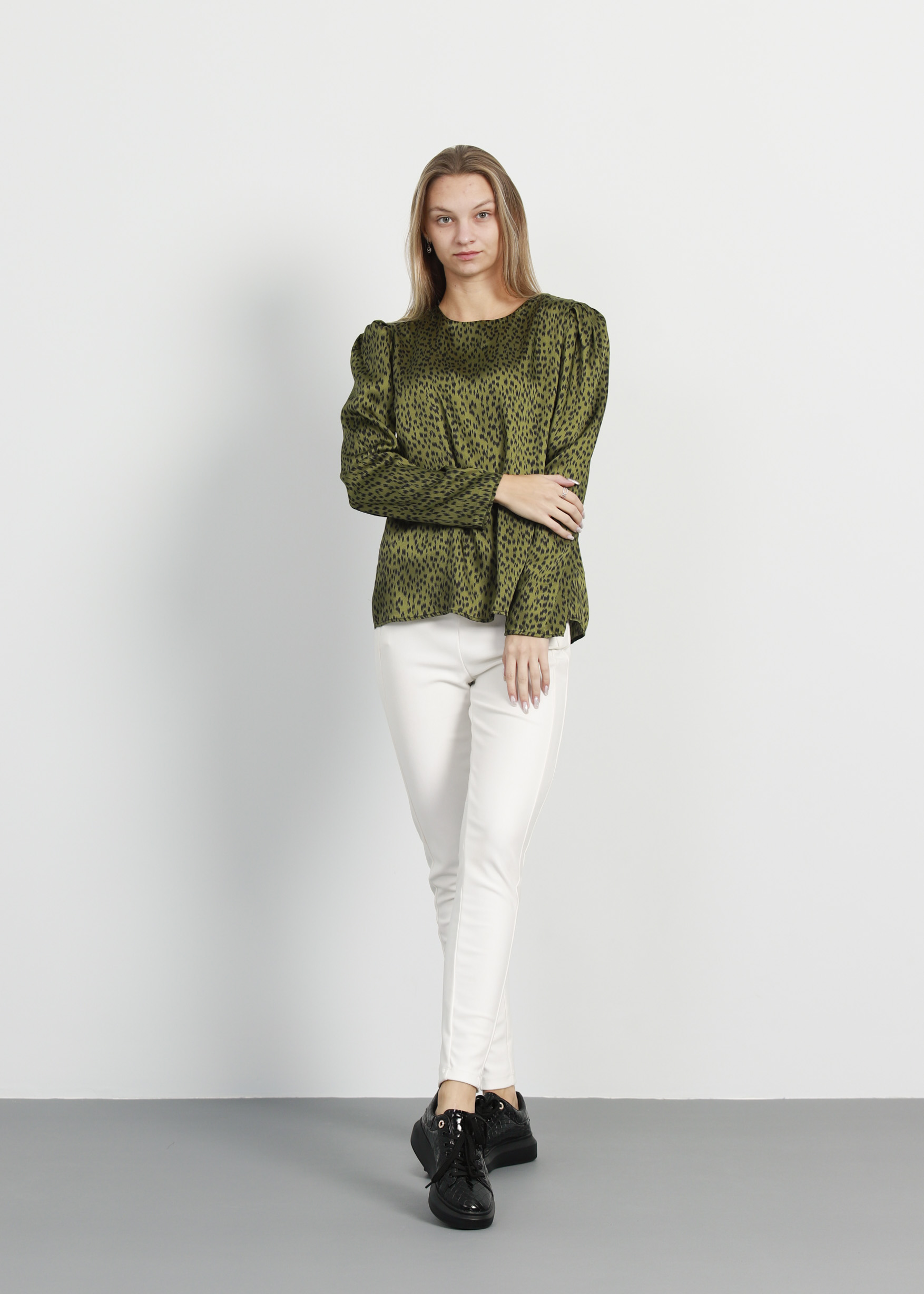 Women blouse, satin, long sleeves, round neck with back button to close, pleated shoulders, unique and modern, 100% Polyester