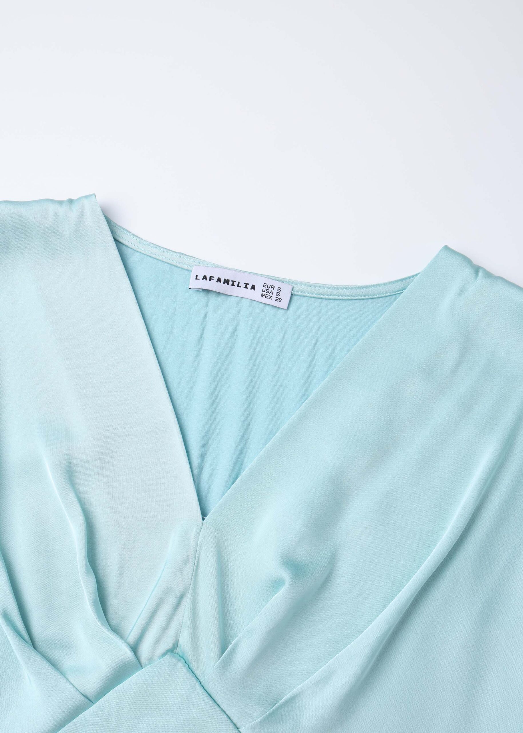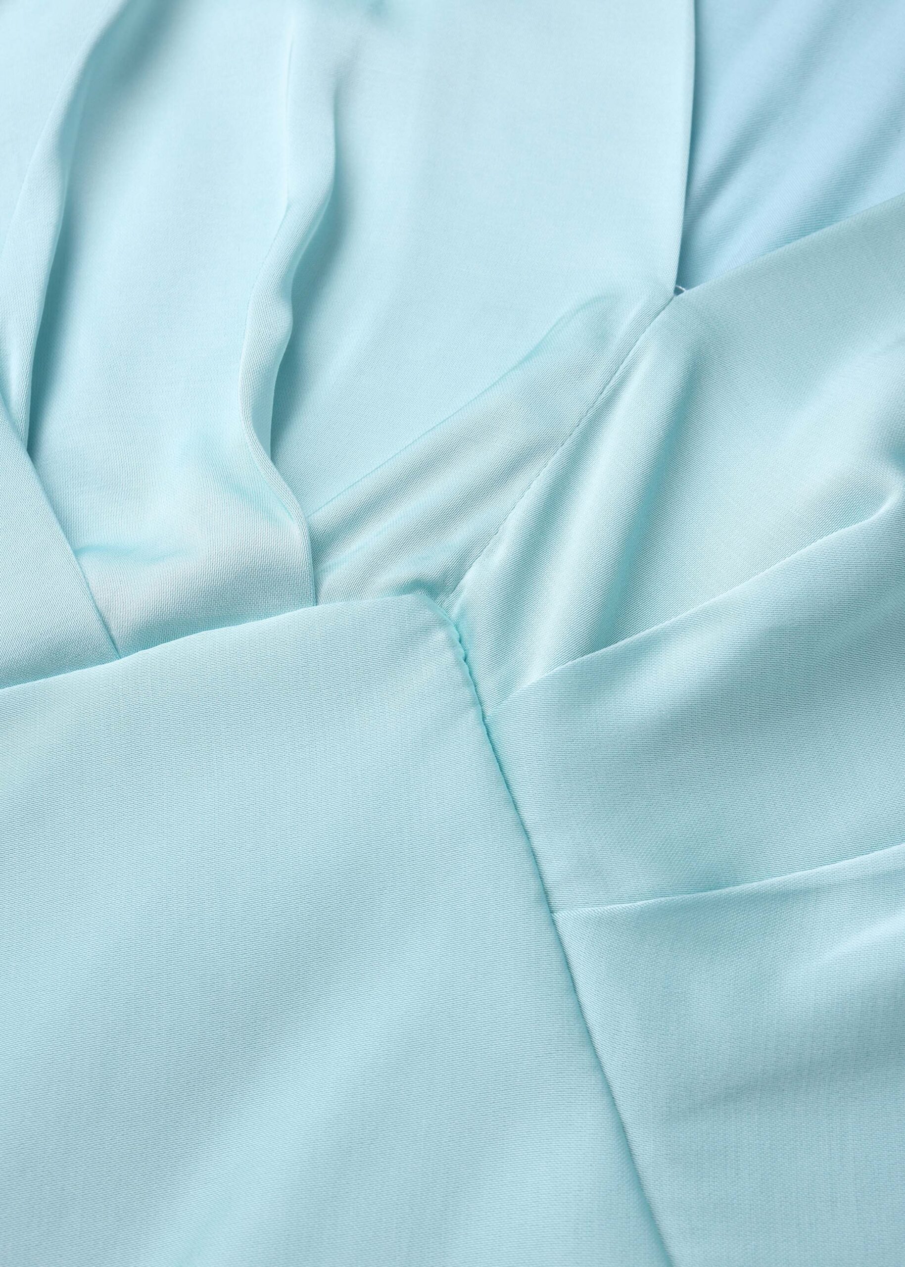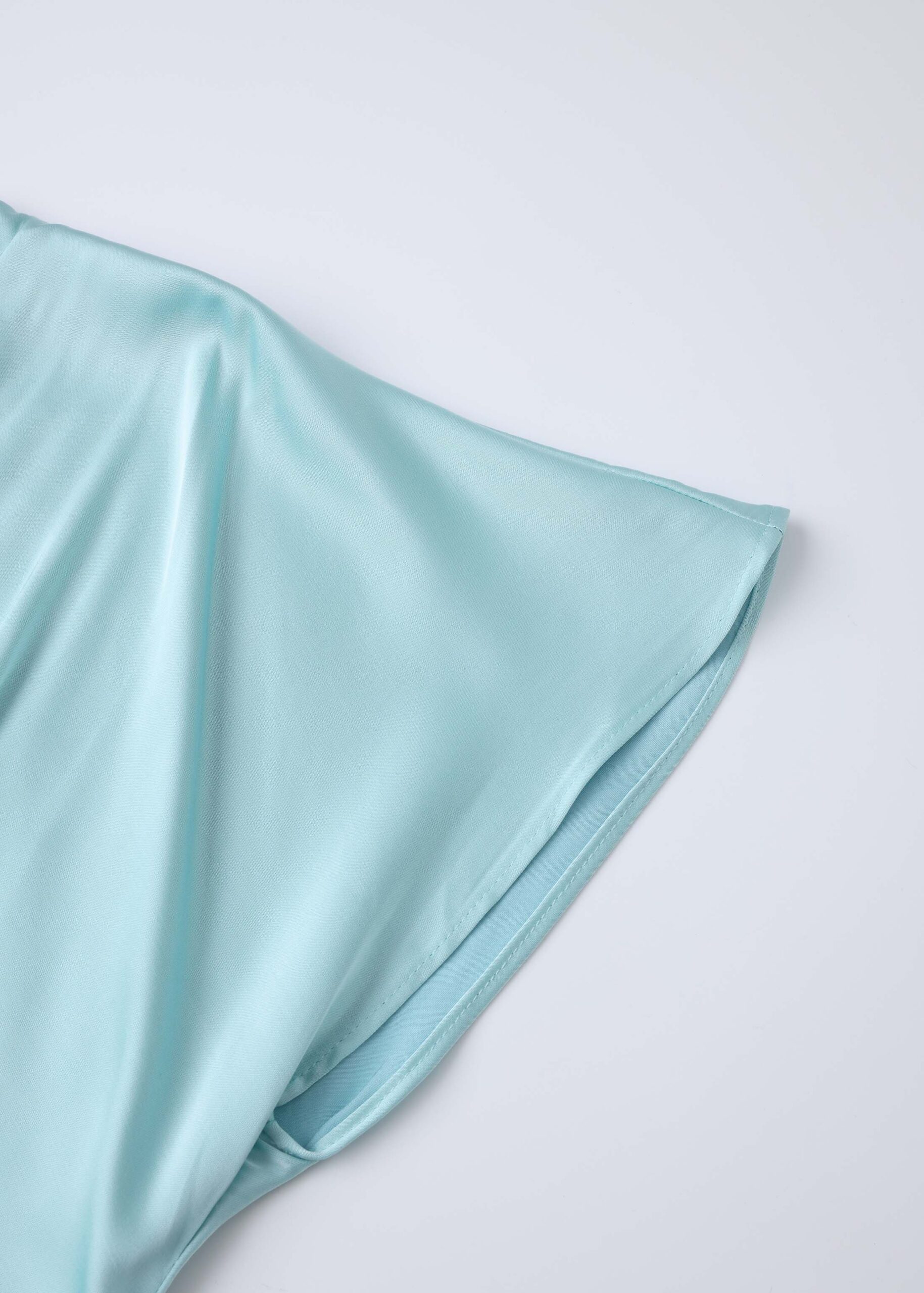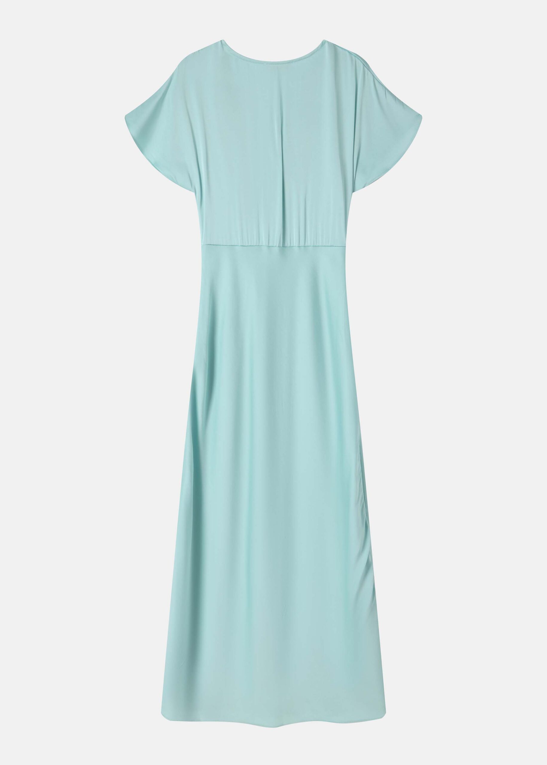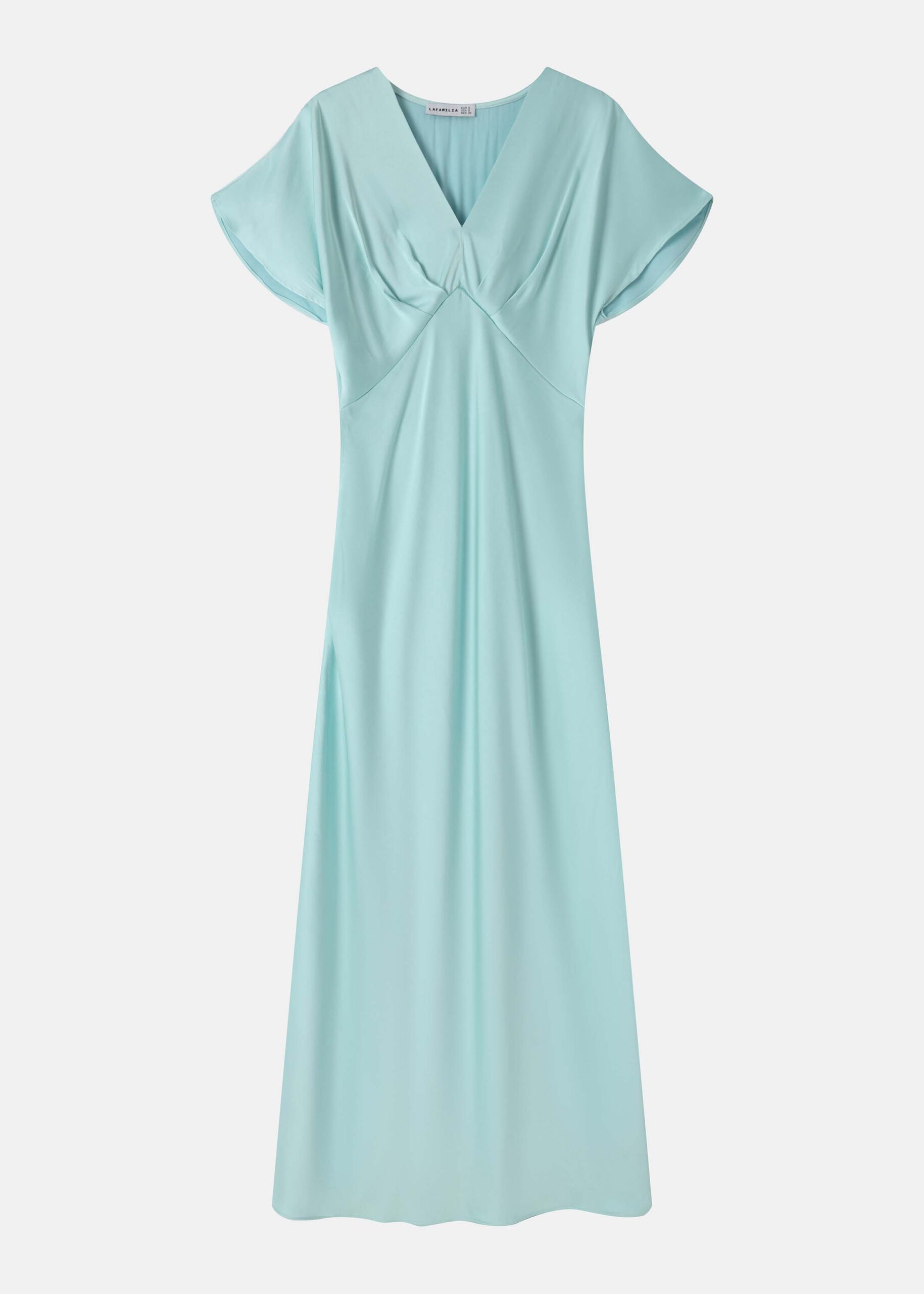 Women dress, maxi, satin, V neck with pleated detail , short flutter-style sleeves, unique and modern