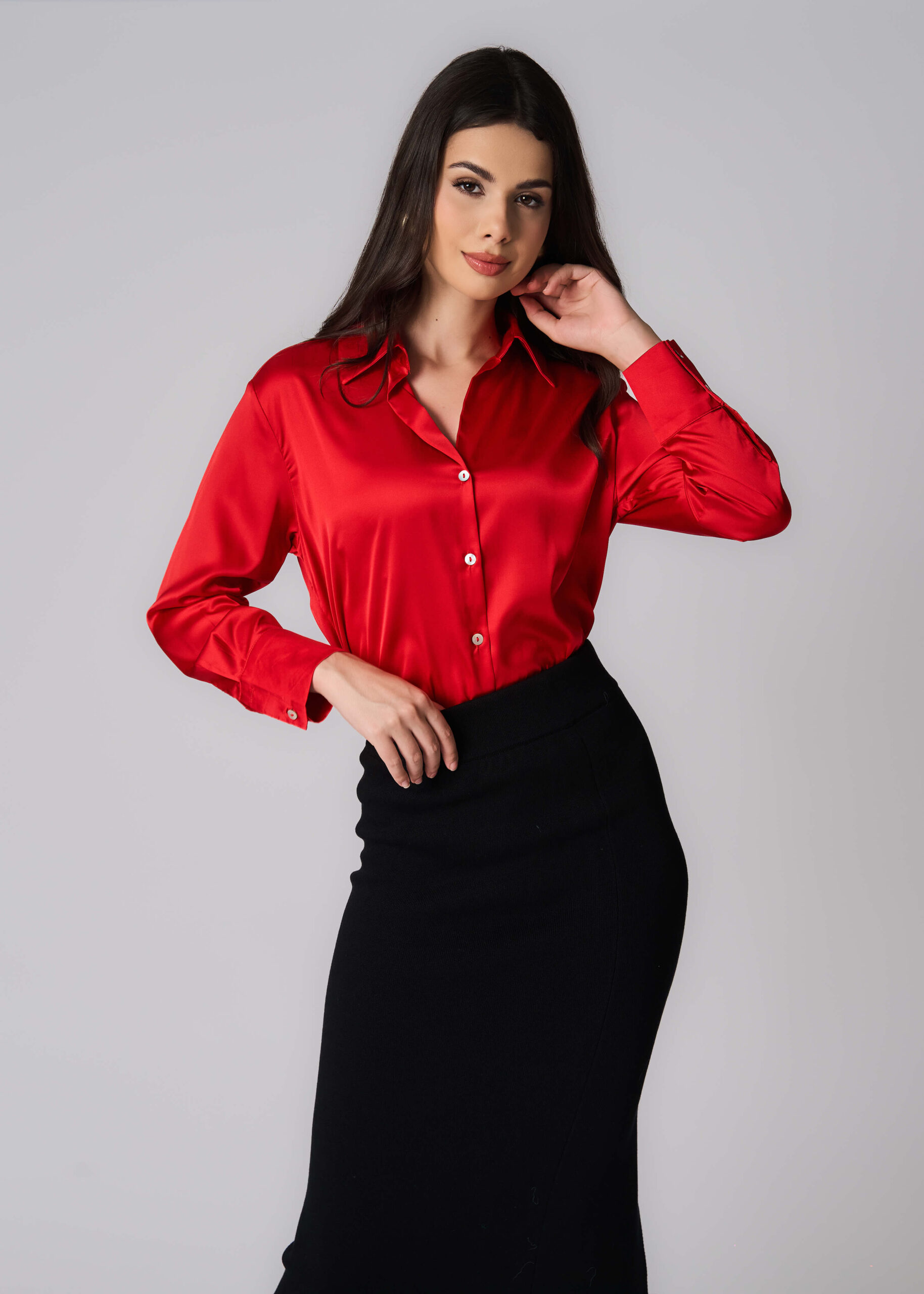 Women shirt, satin, plain, rolled collar, V neck, front buttons to close, long sleeves, tight cuff, unique and modern