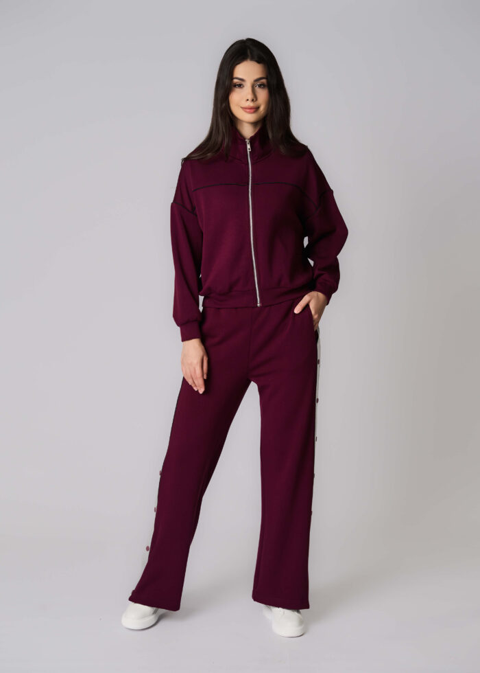 Women trouser, plain, scuba fabric, elastic waist, front pockets, side buttons, comfortable and practical