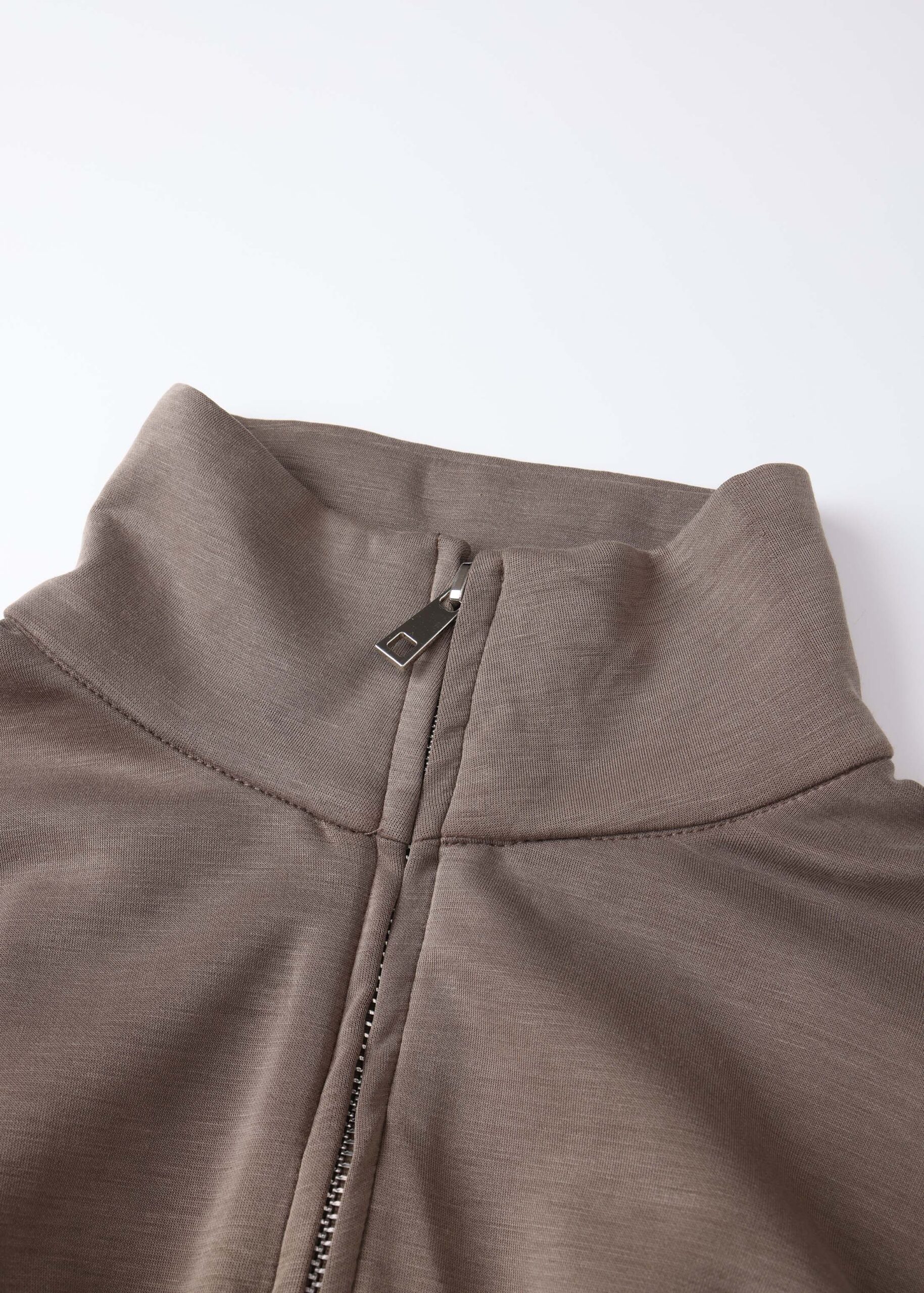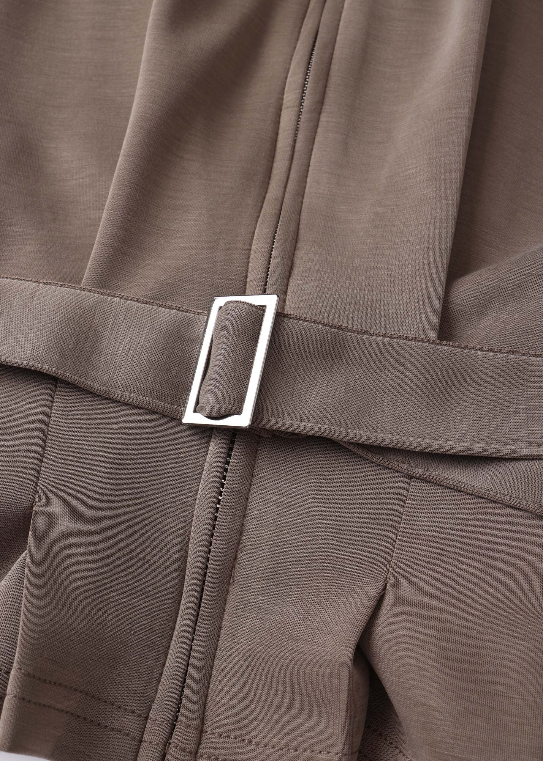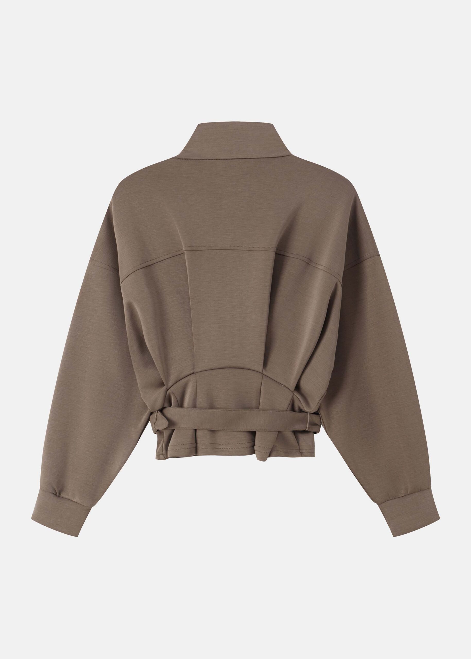 Women jacket, high collar, front zipper closure, waist belt, waist cinched with corset-style design, long sleeves with tight cuff, practical and comfortable