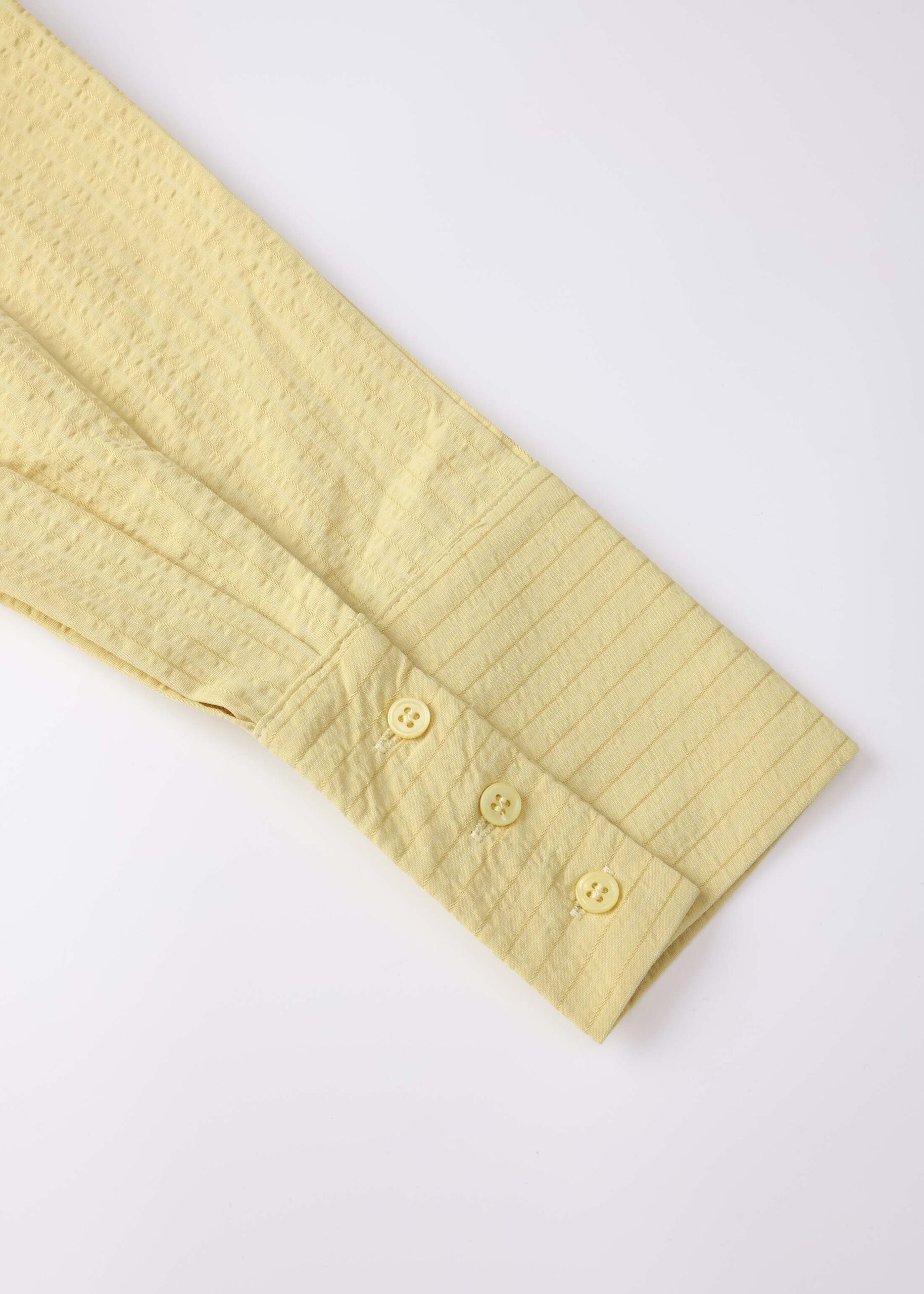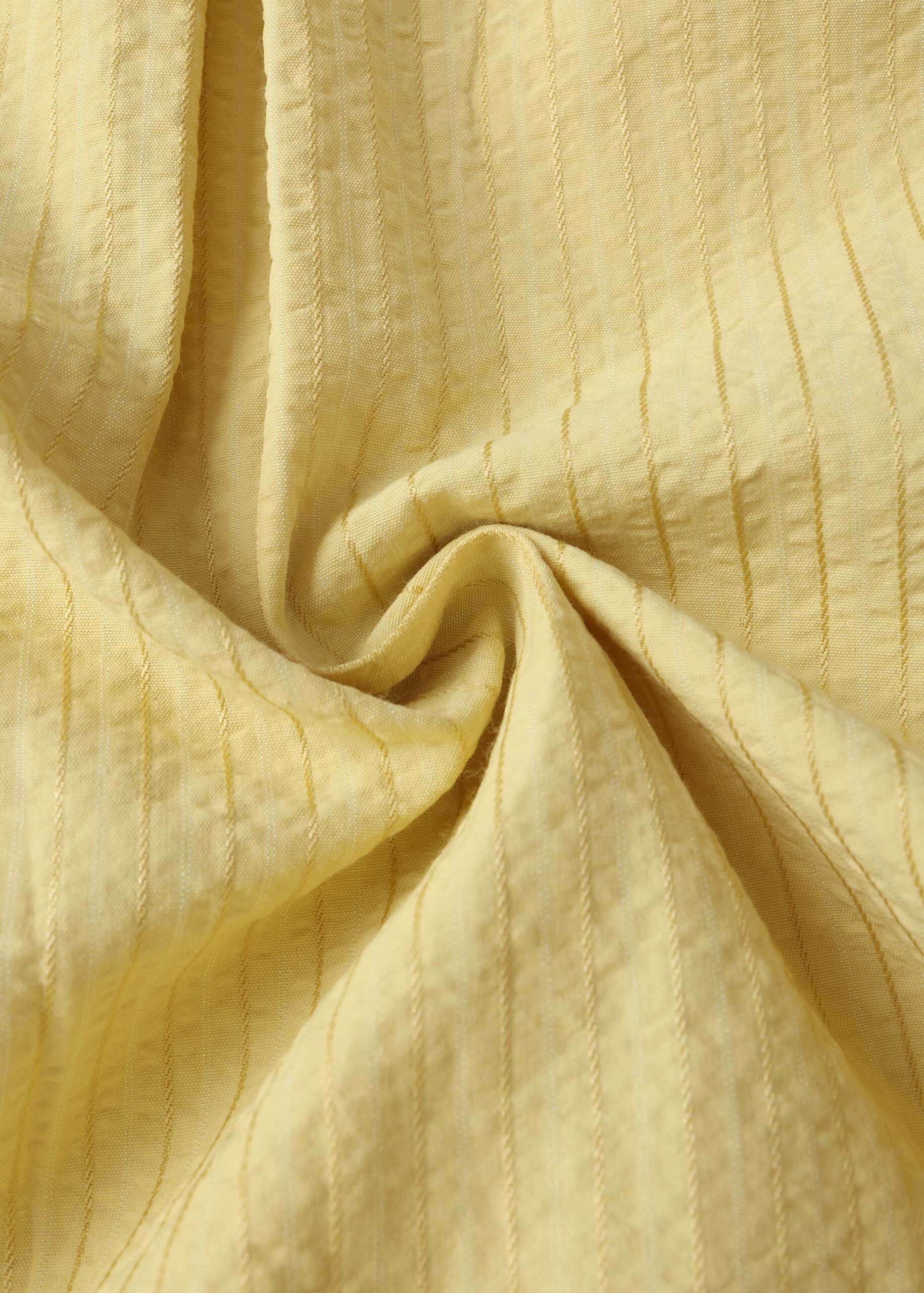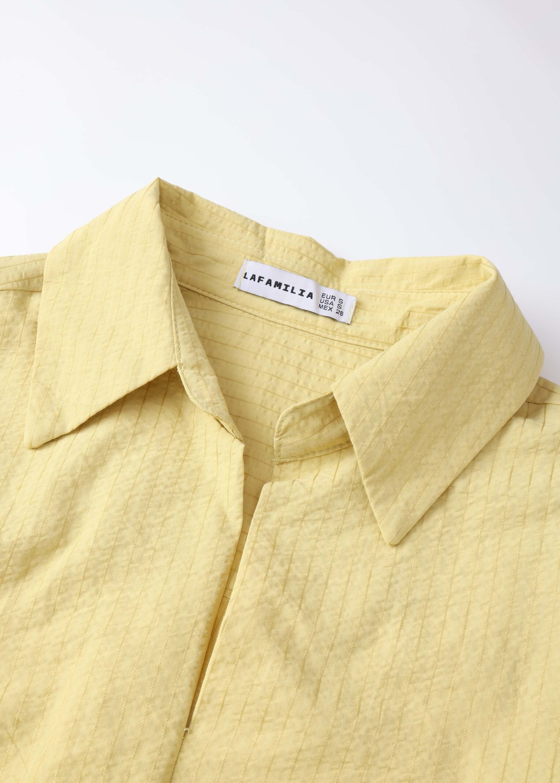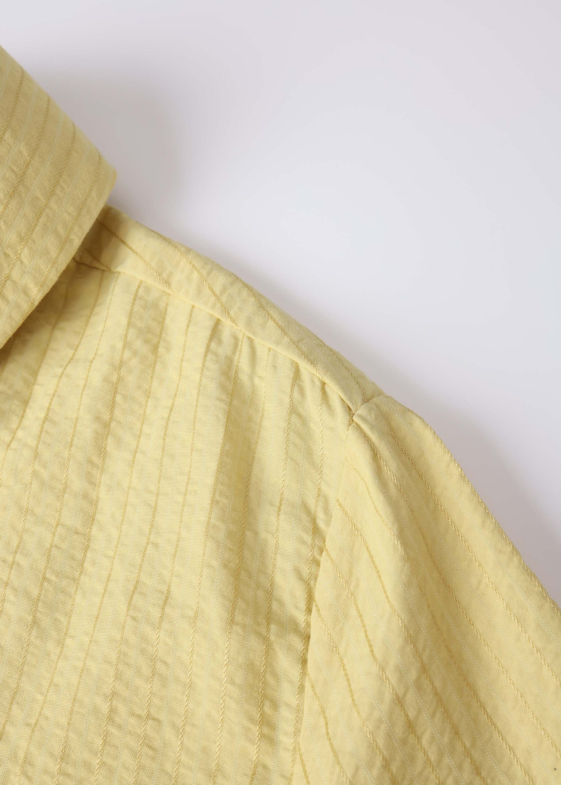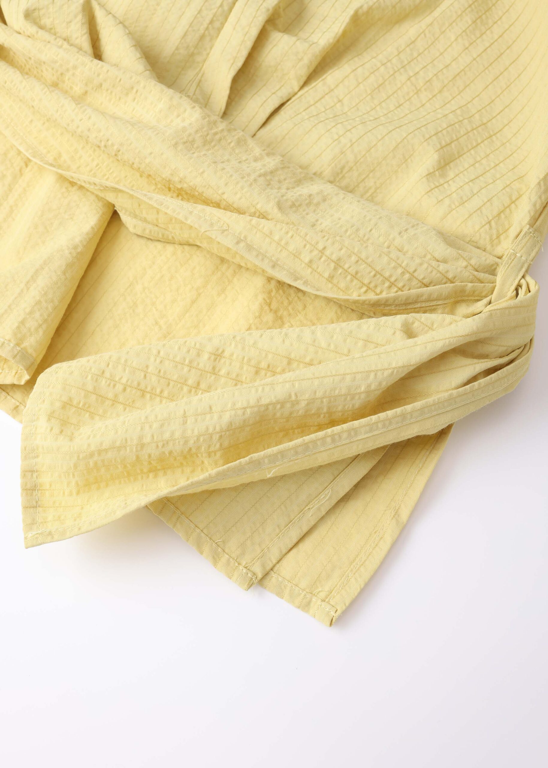 Women shirt, striped, rolled collar V neck, long sleeves with buttons cuff, wrap-around detail at the waist with side knot, asymmetrical hem, unique and modern