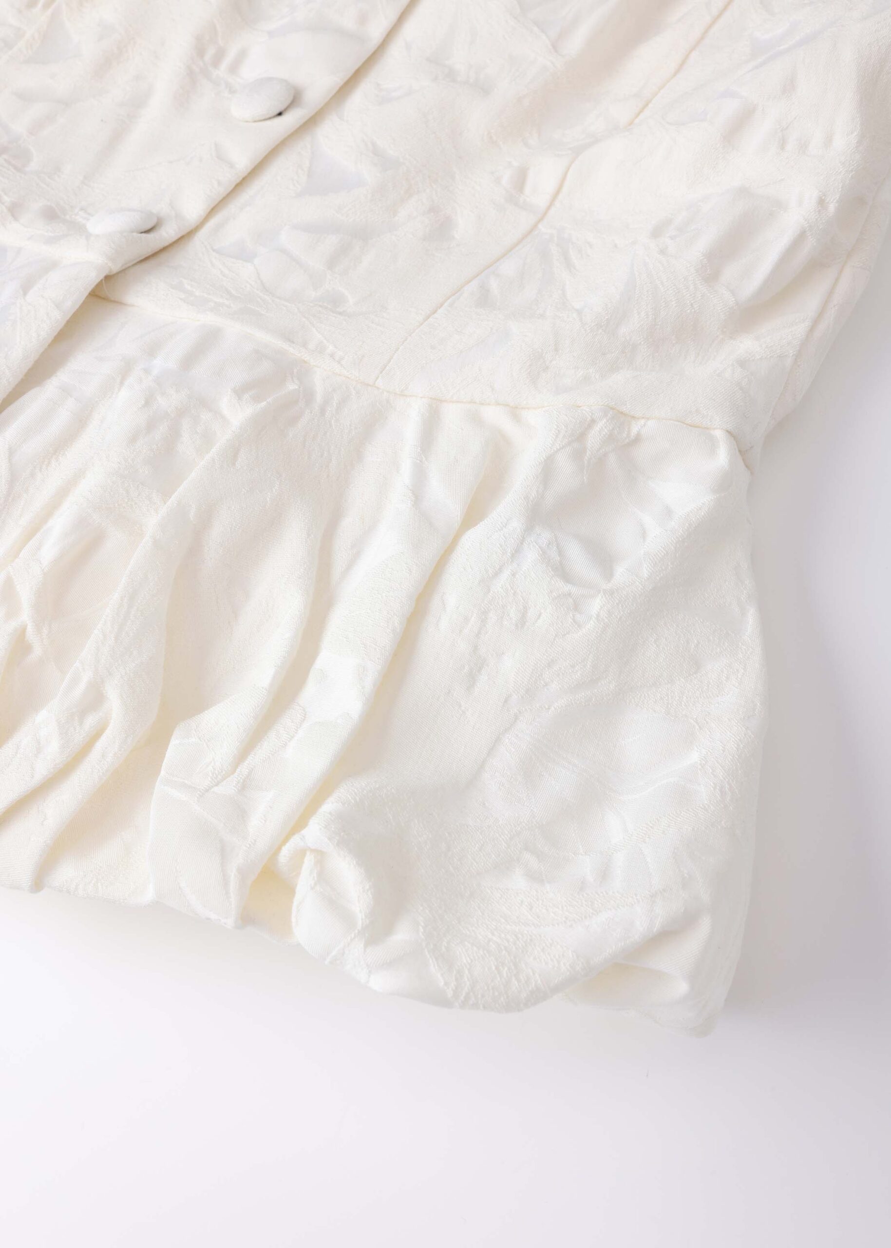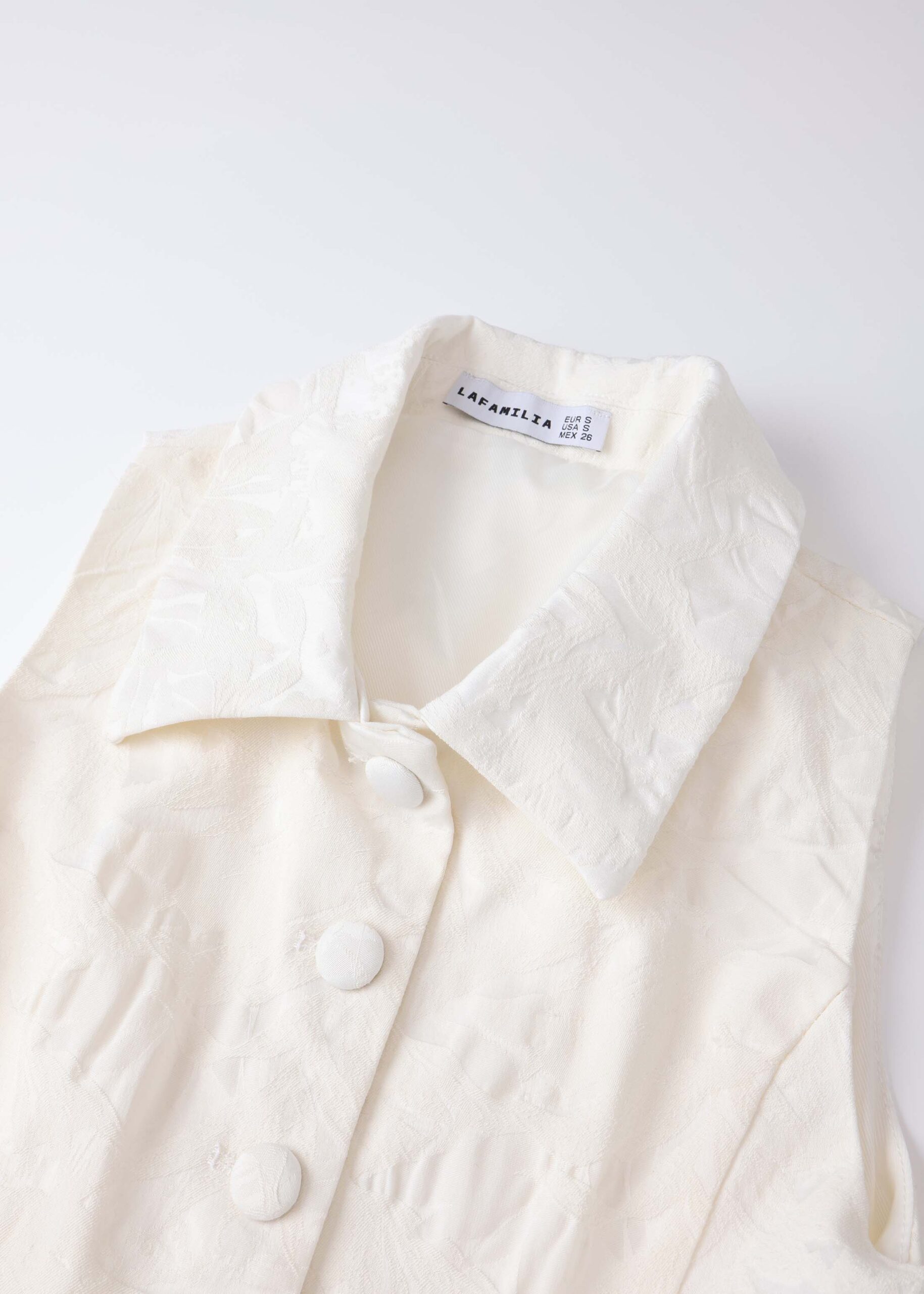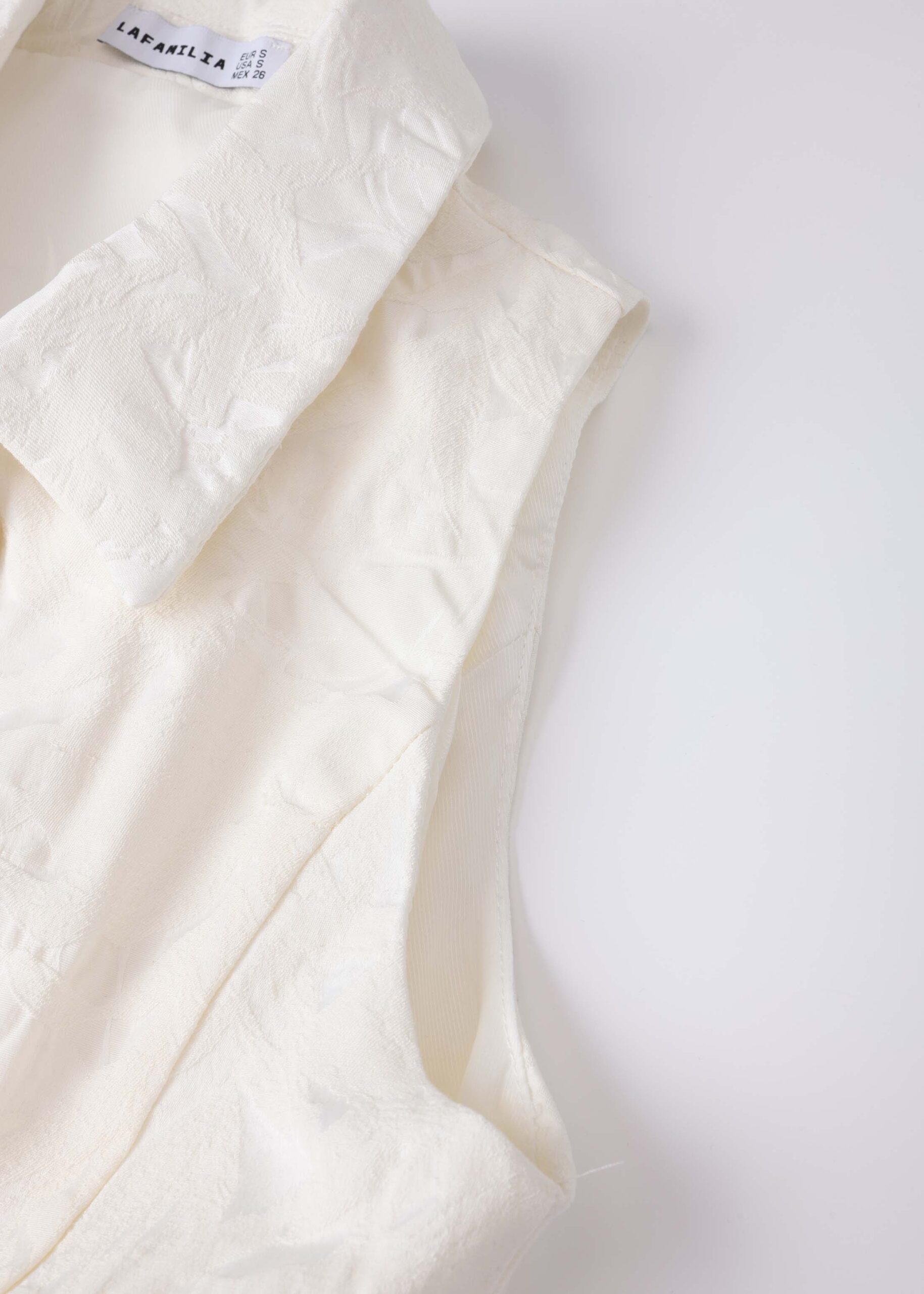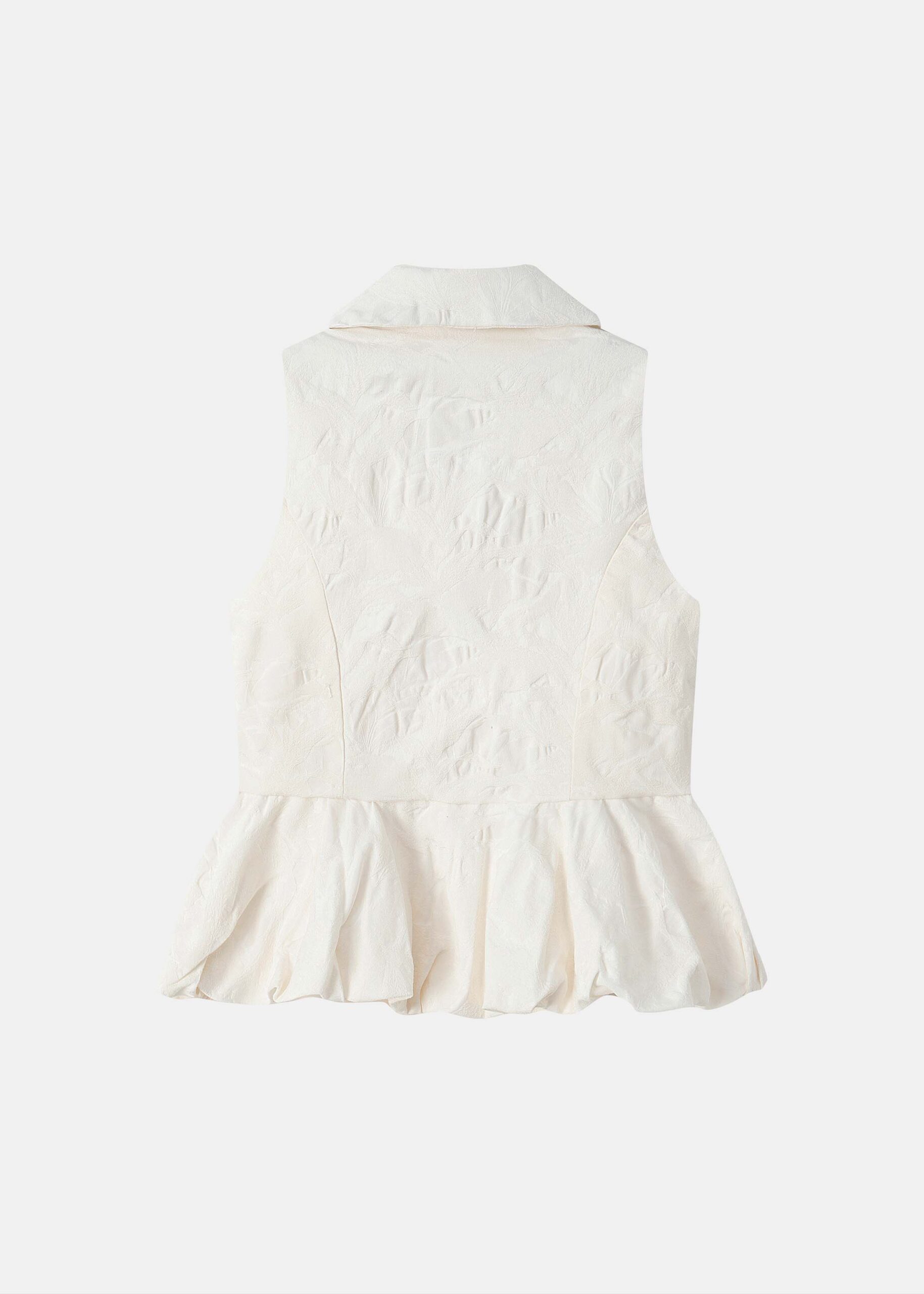 Women top, textured, rolled collar, front buttons to close, sleeveless, frilled layer, unique and modern