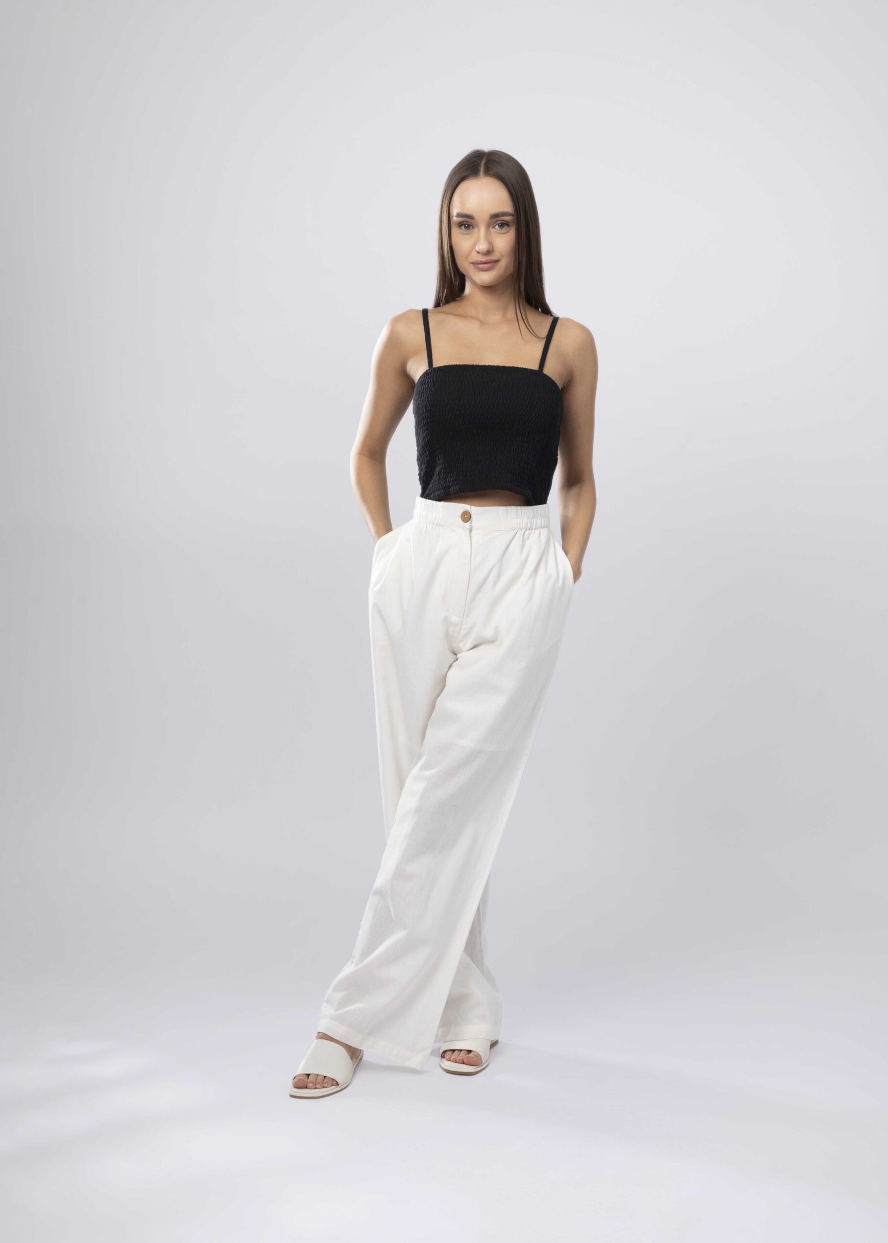 Women trouser, straight-leg, elastic waist with front button and zipper closure, front pockets, unique and modern