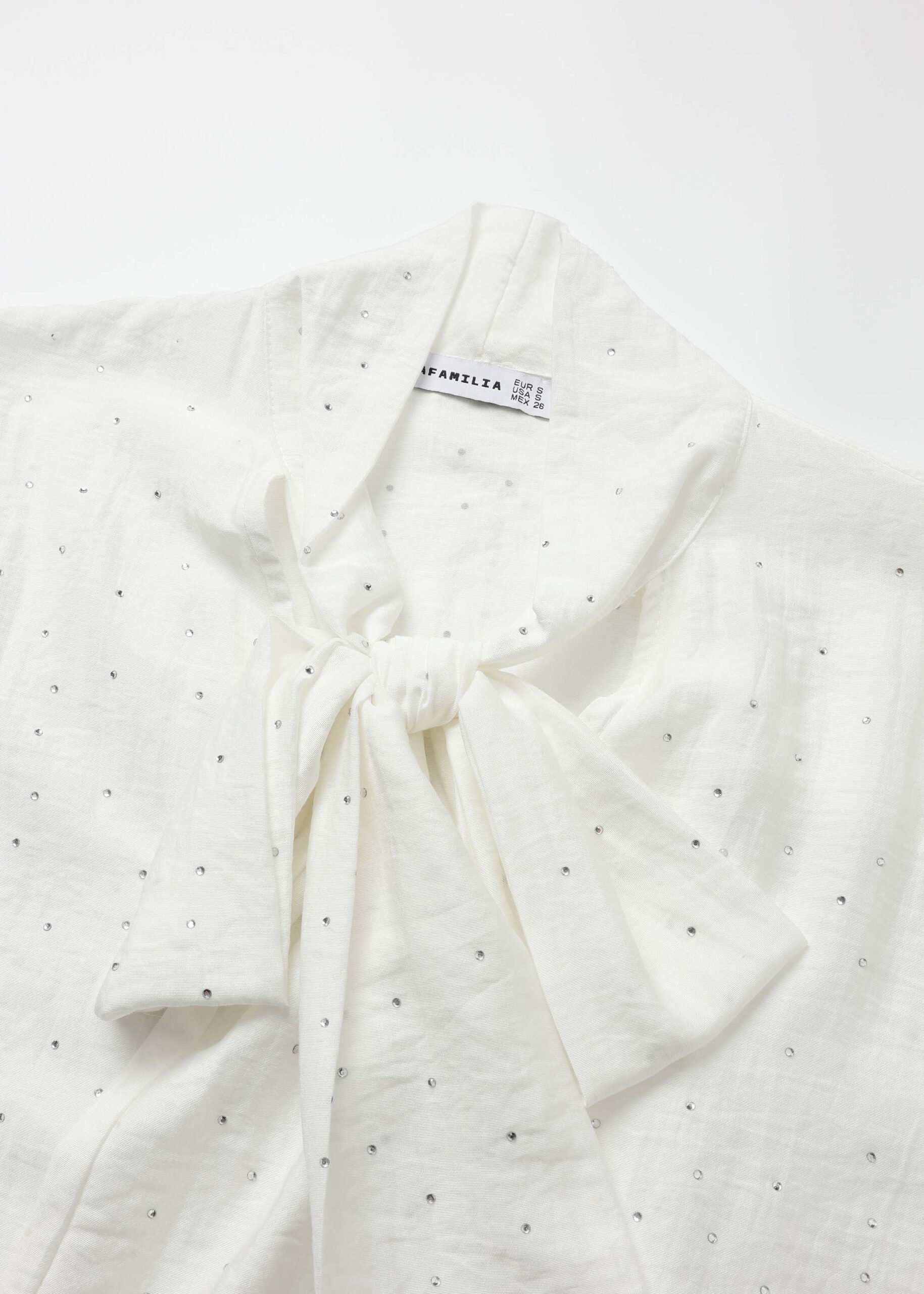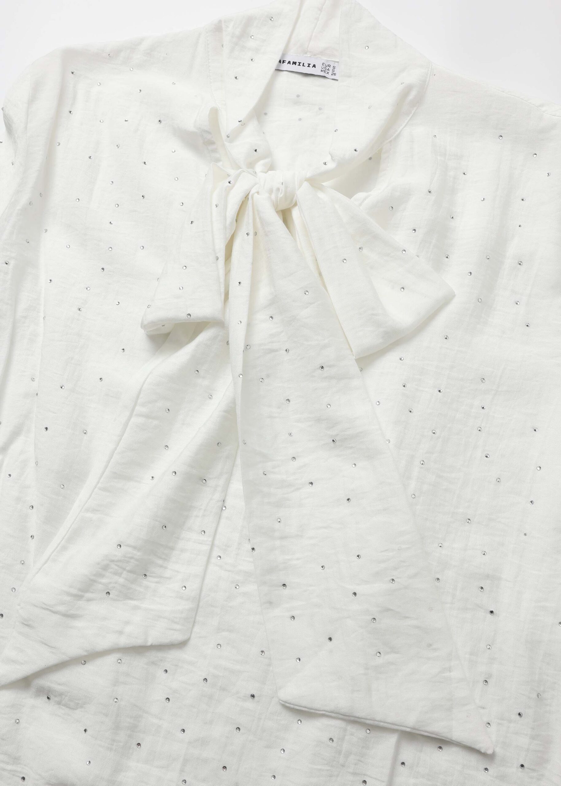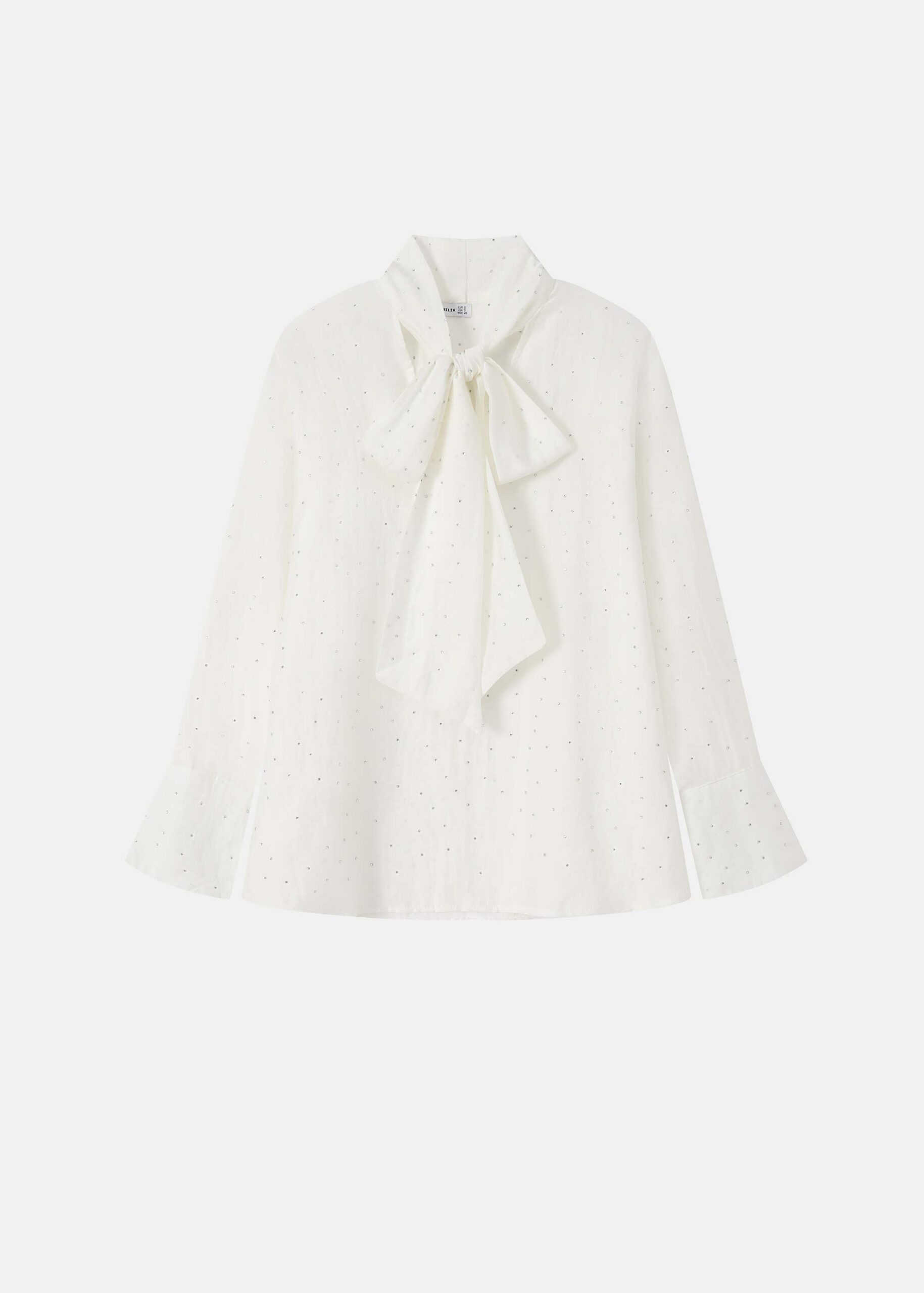 Women blouse, strass decor, round neck with front tie, long sleeves, tight cuff with button, unique and modern
