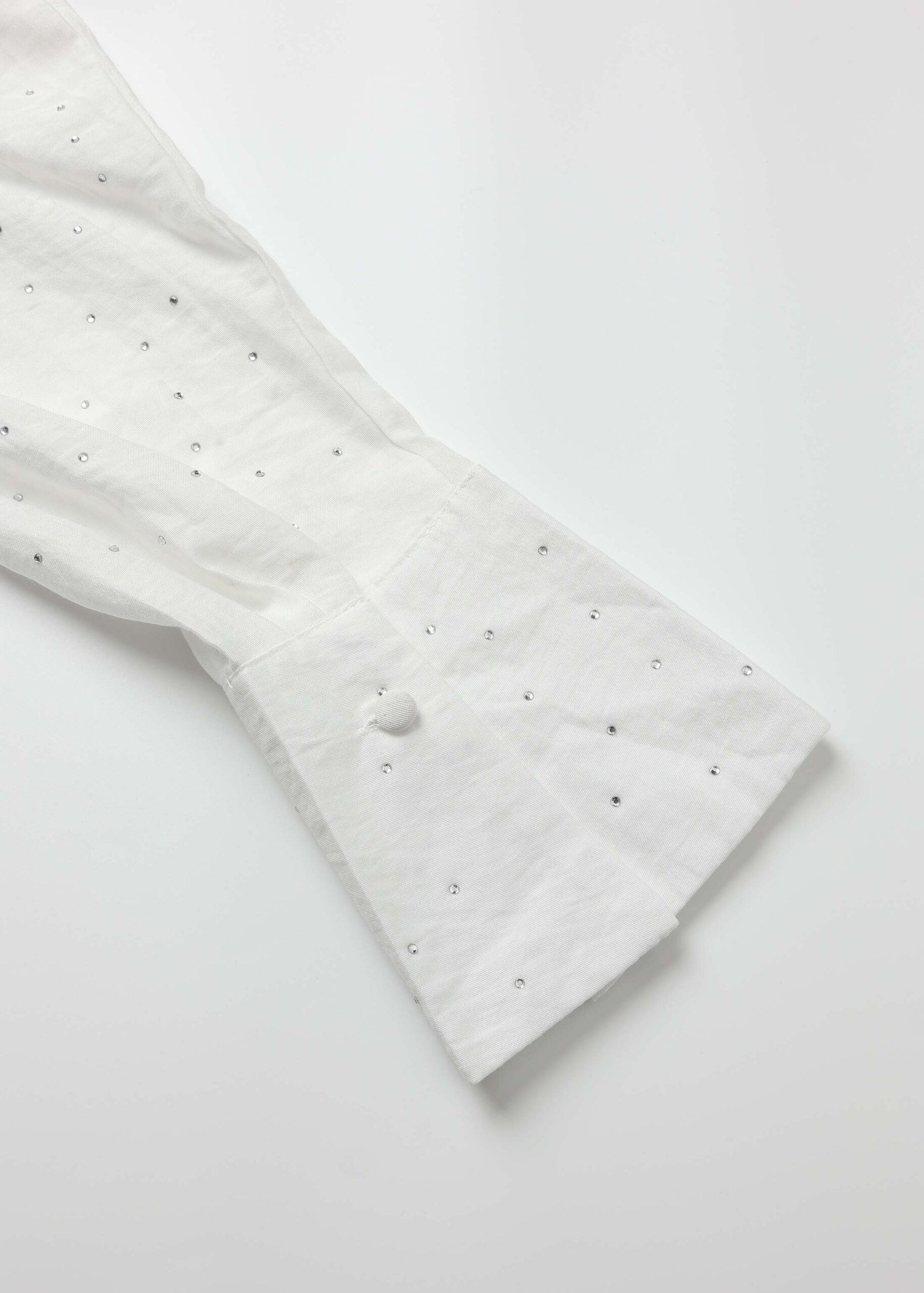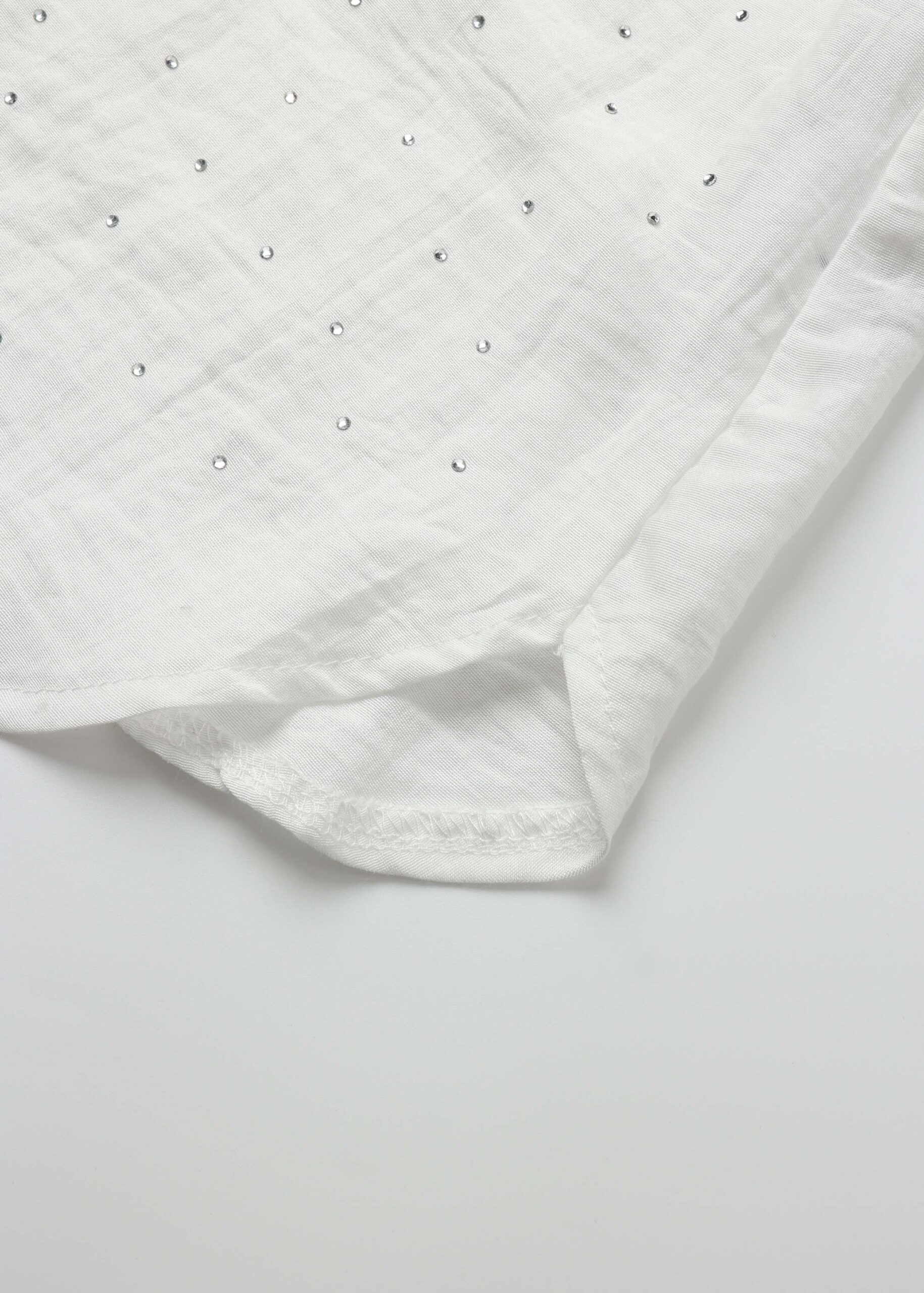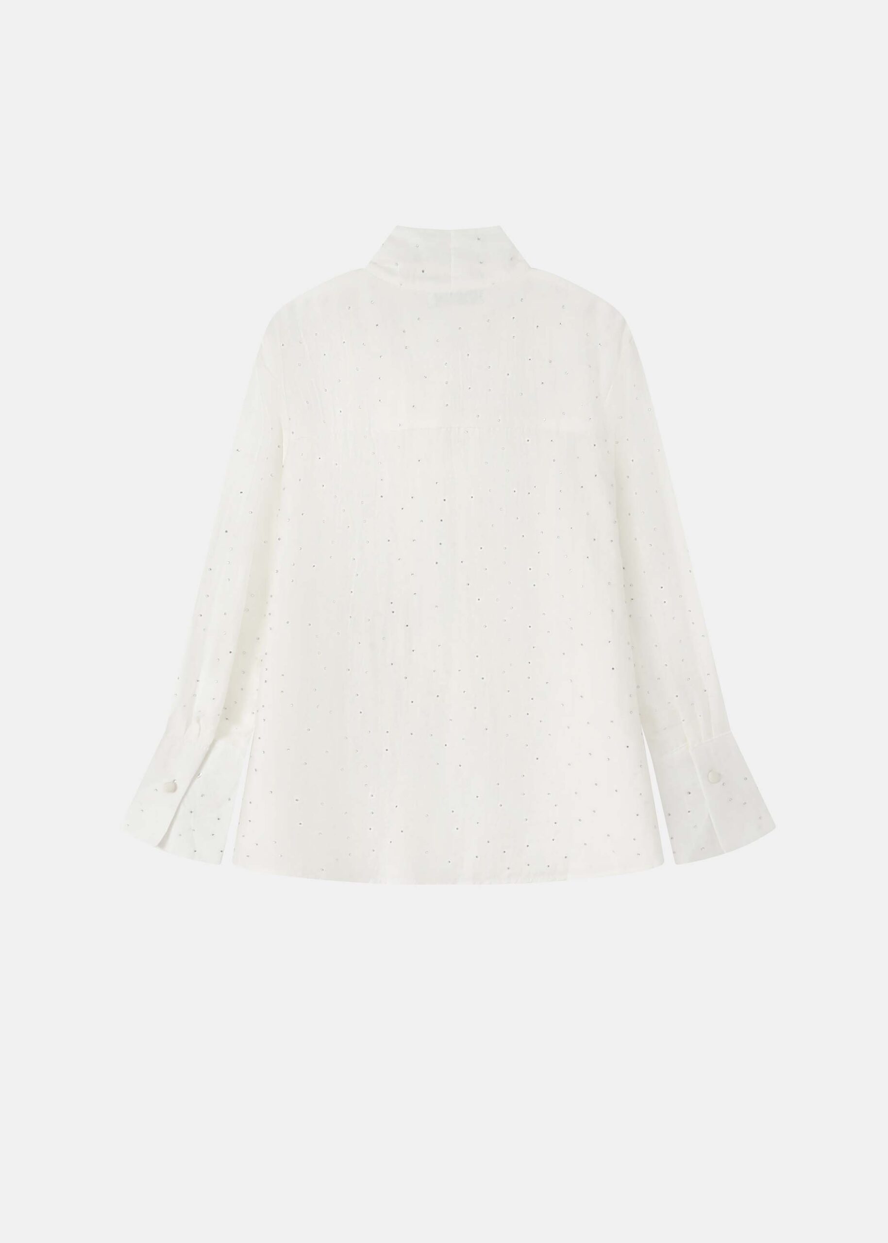 Women blouse, strass decor, round neck with front tie, long sleeves, tight cuff with button, unique and modern