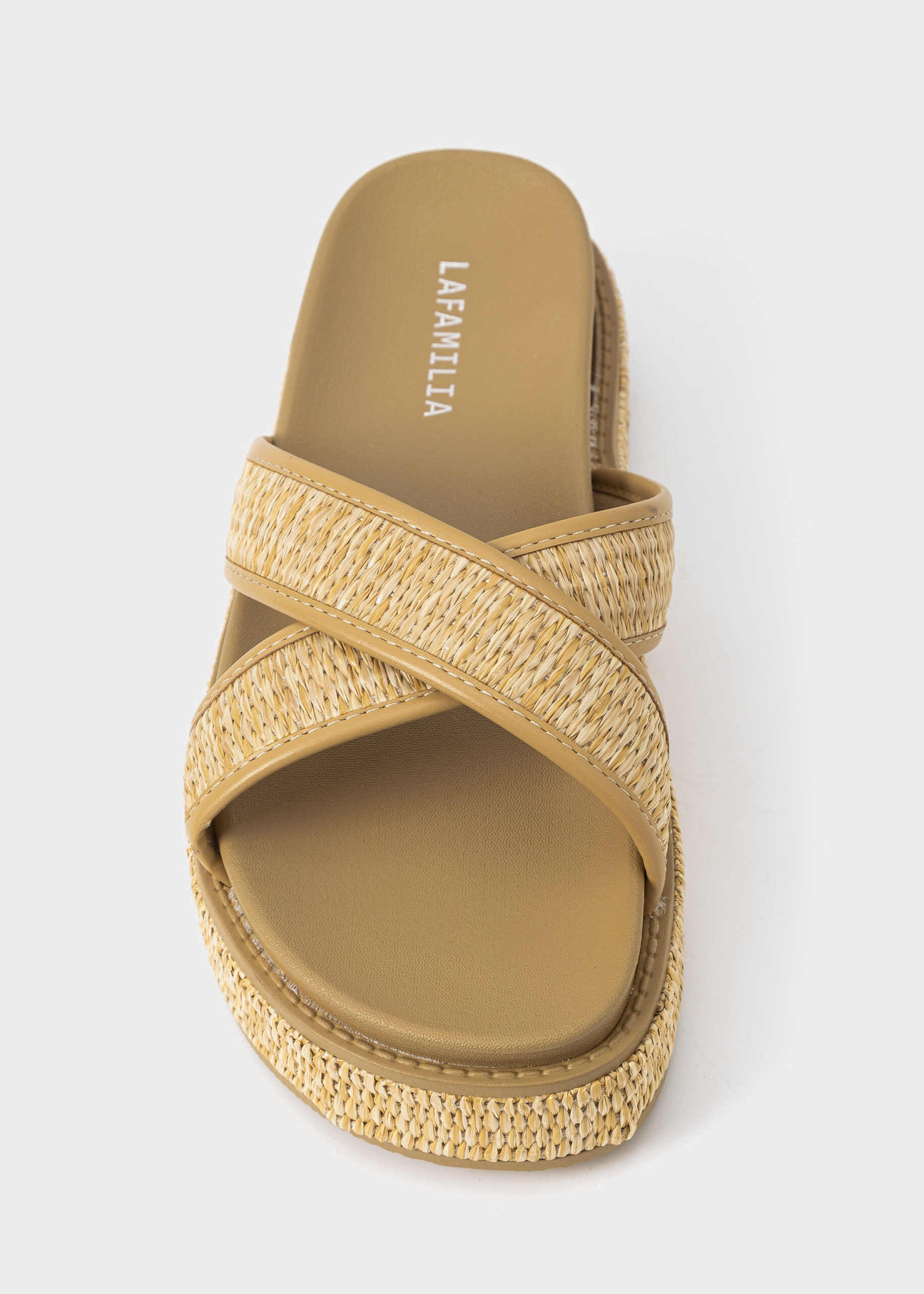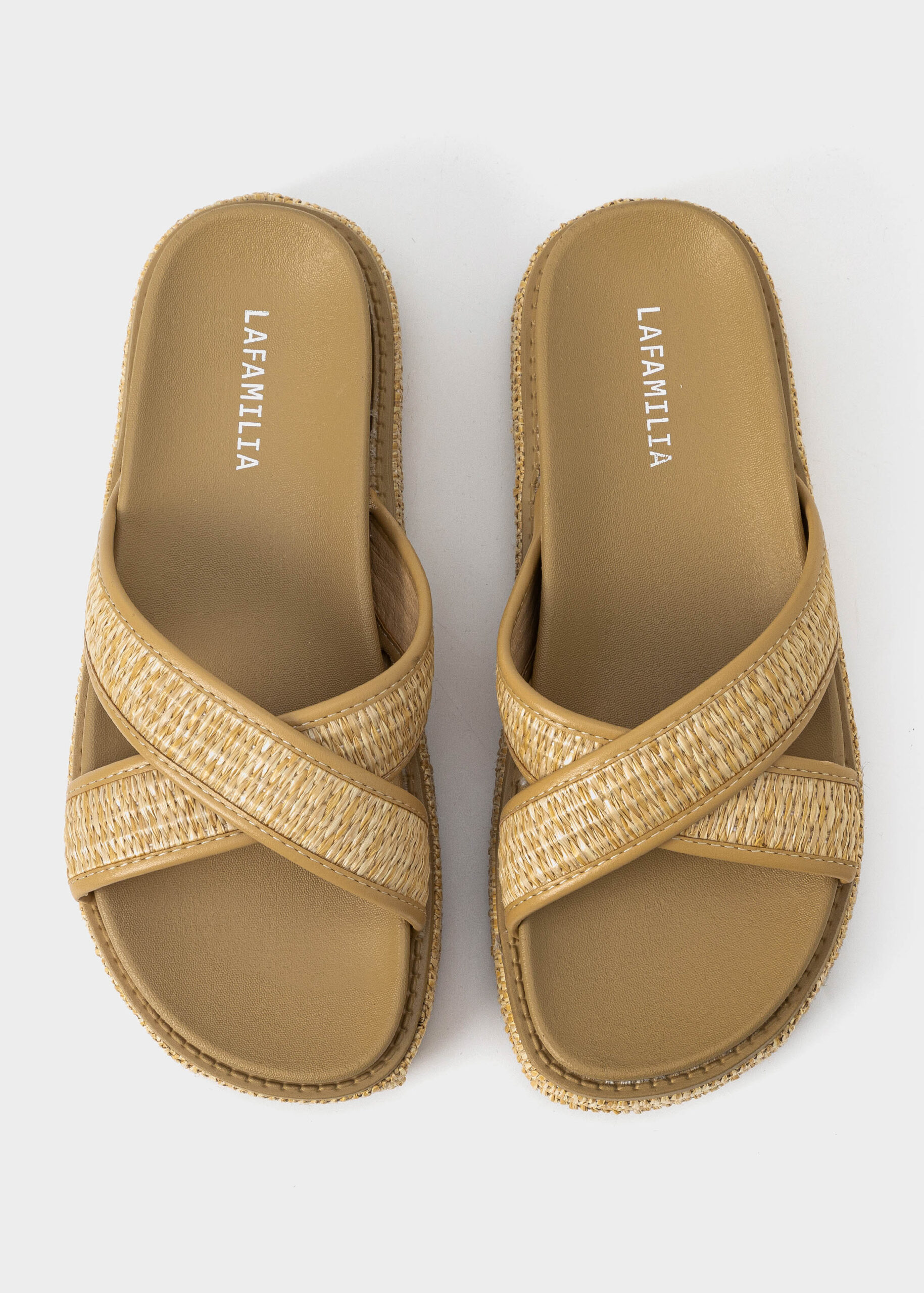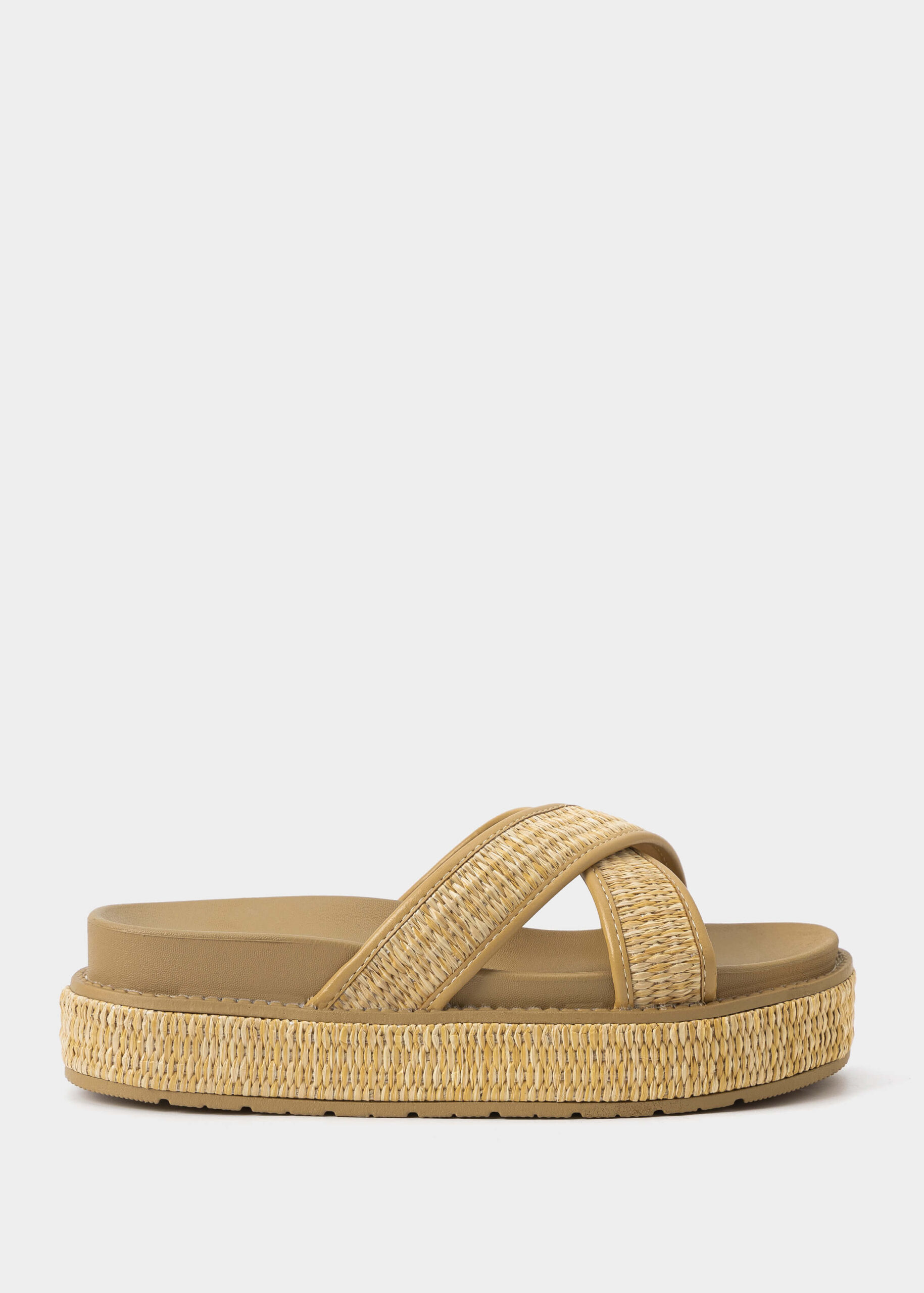 Women slipper, straw, upper cross straps, flat, round open toe, chunky sole, unique and practical