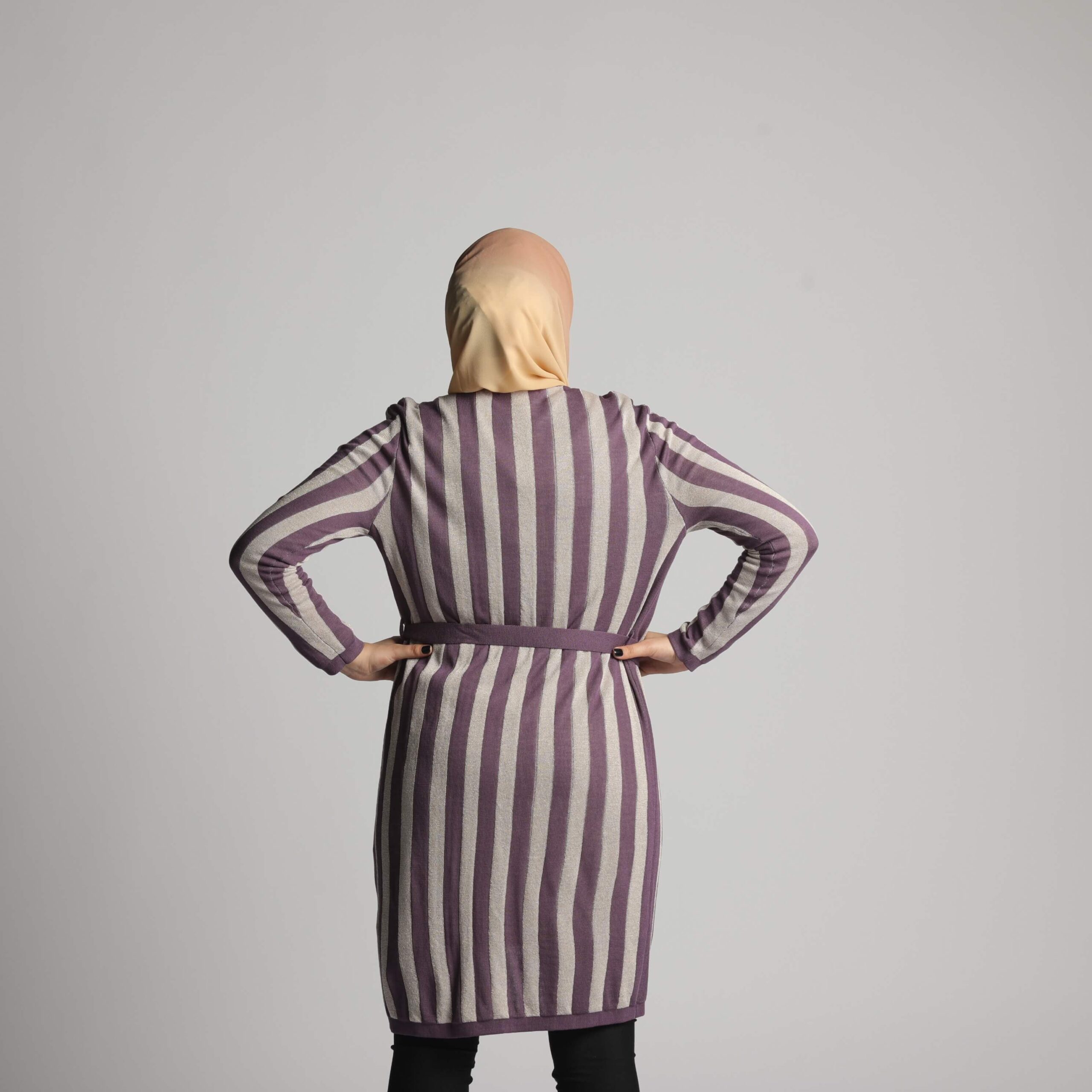 Medium length cardigan featuring stiped design finished with a tie belt.