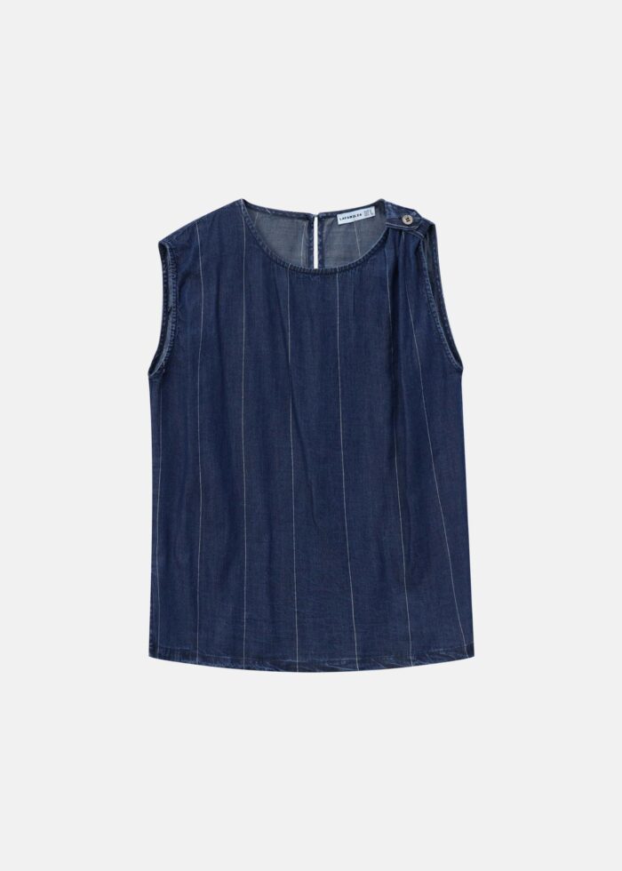 Women blouse, jeans, striped, round neck with back button to close, sleeveless, unique and modern