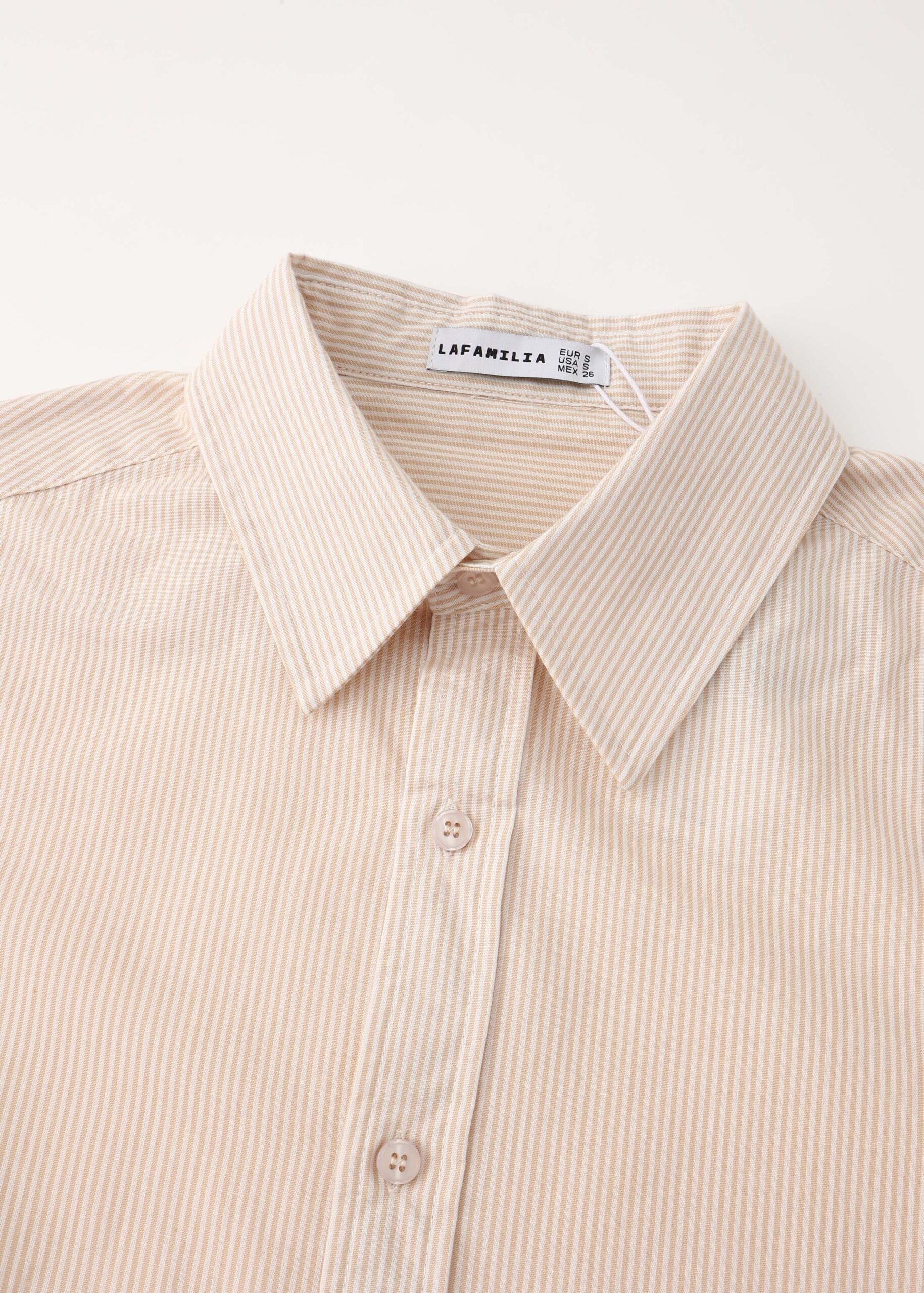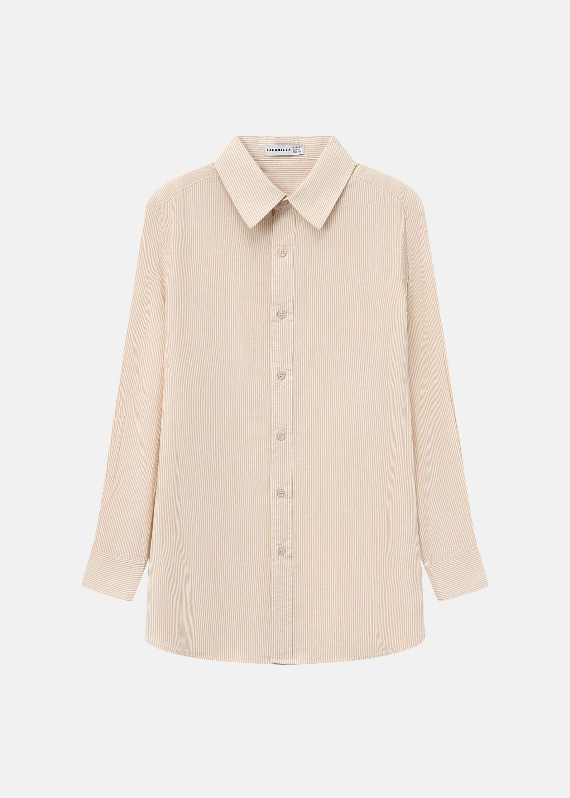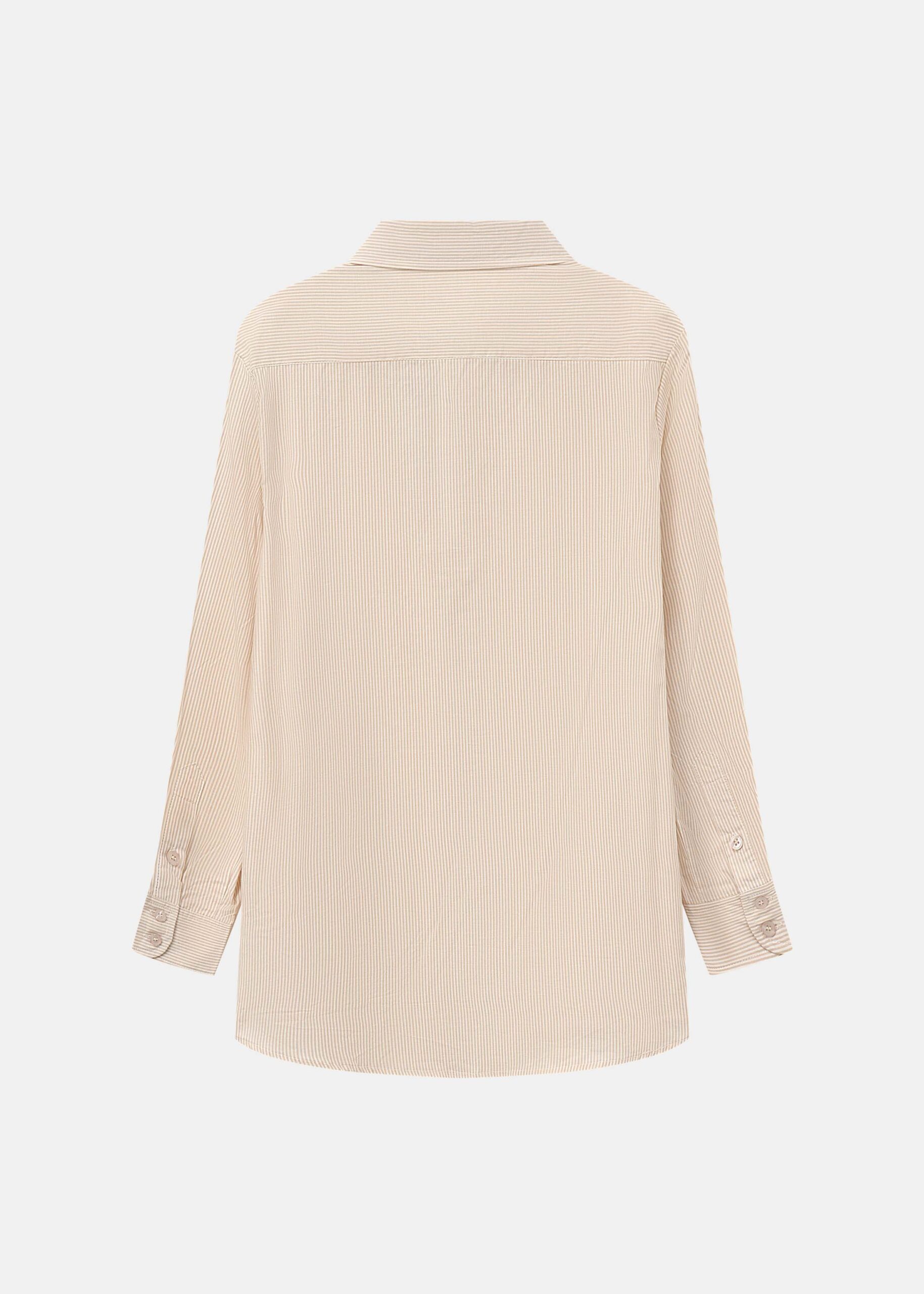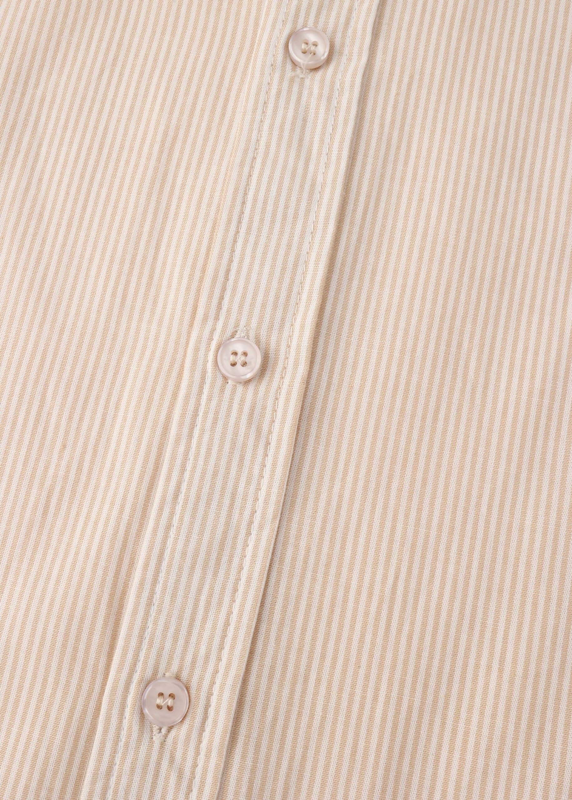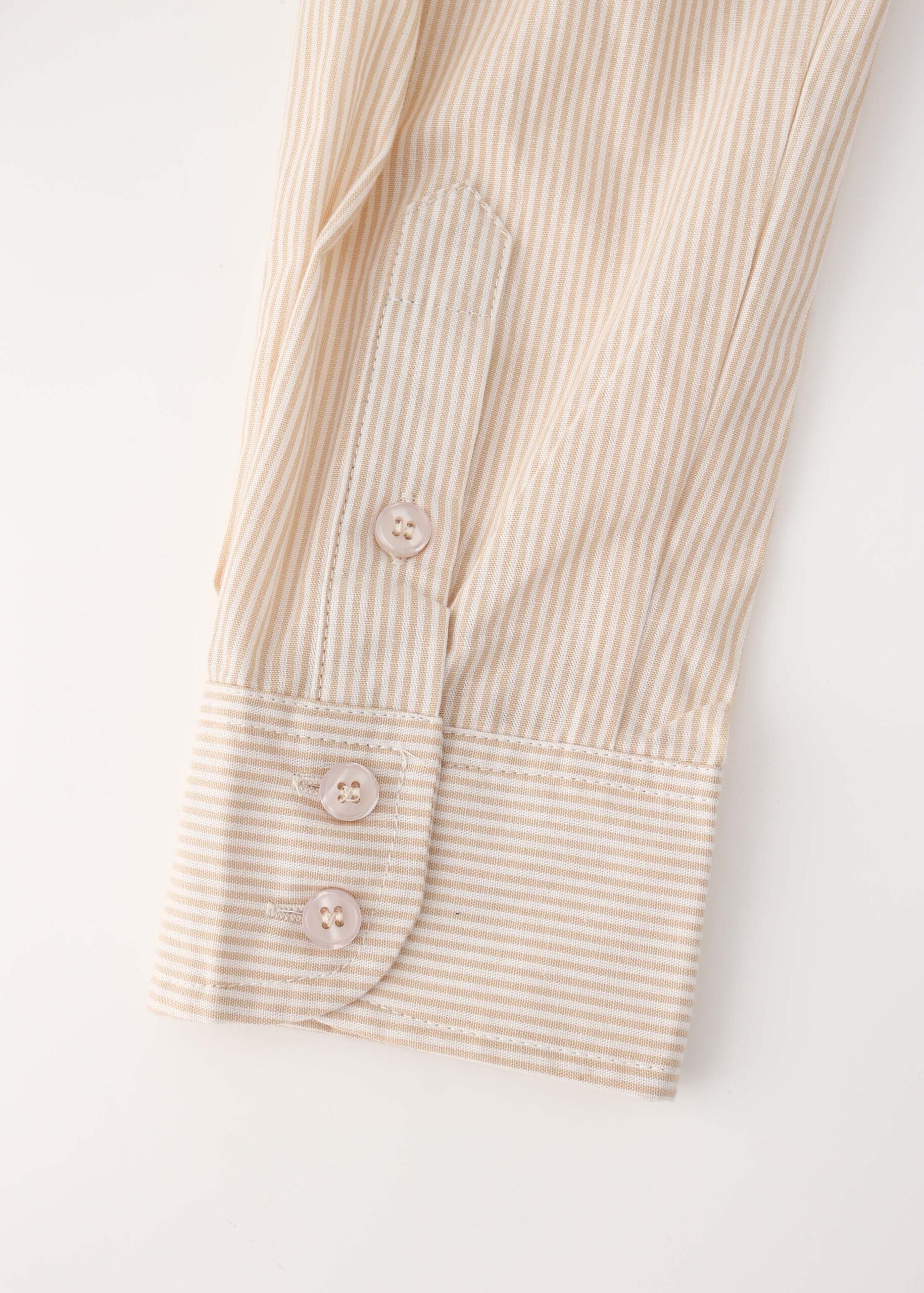 Women shirt, striped, long, front buttons to close, rolled collar with front button, long sleeves with tight cuff, unique and modern