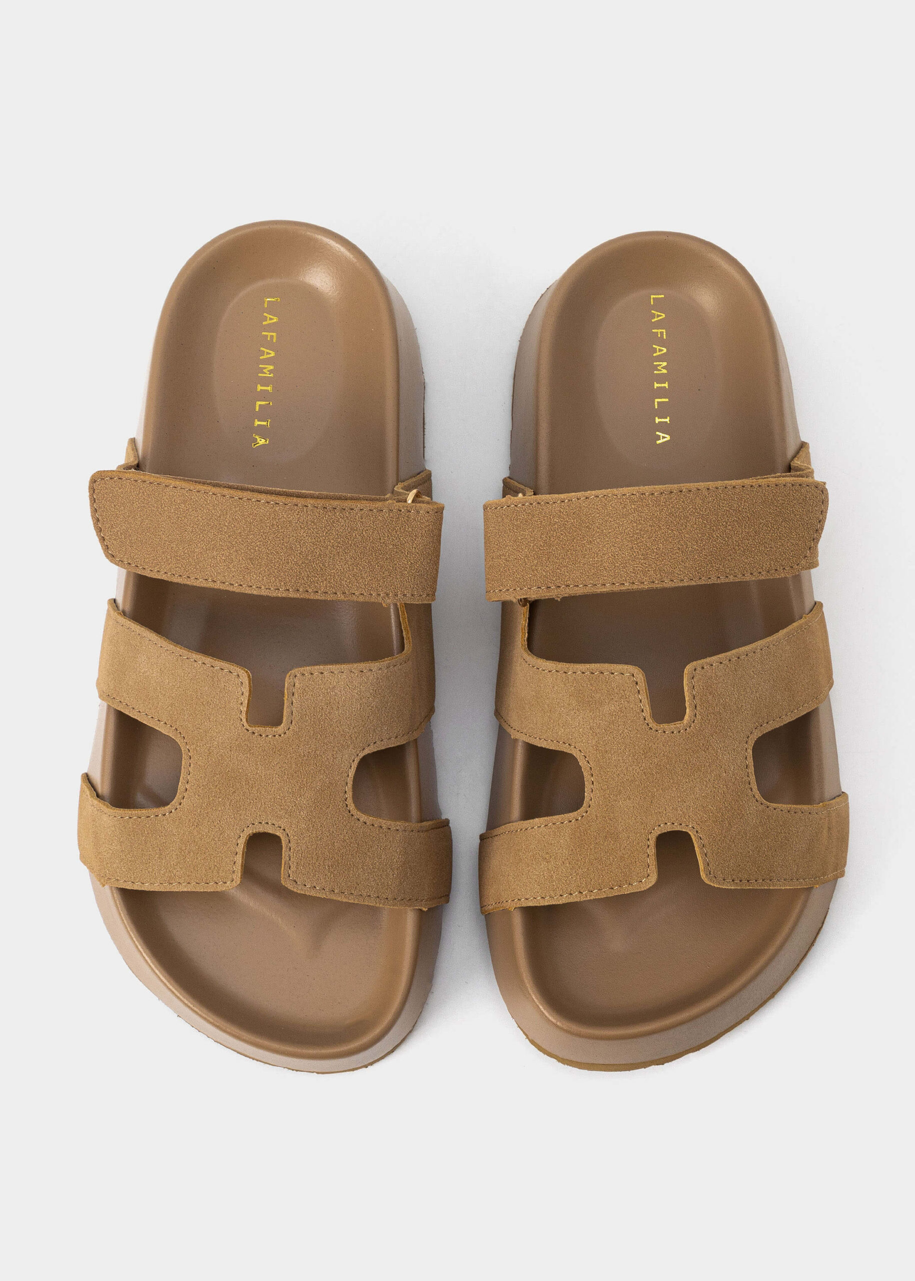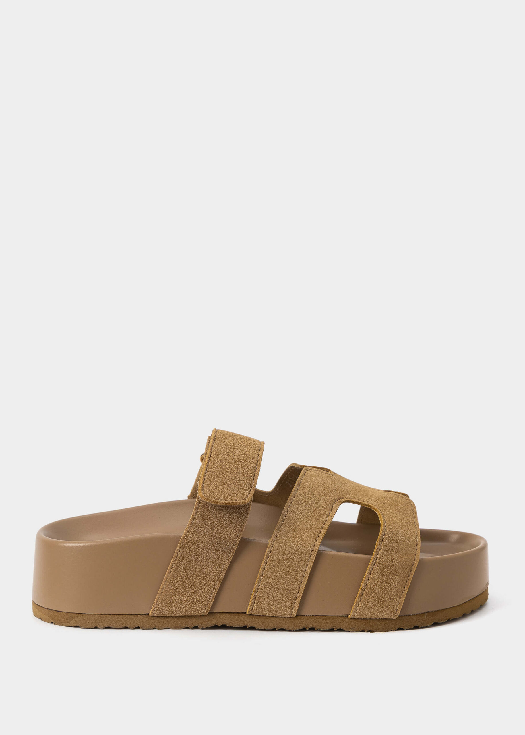 Women slipper, suede, flat, open round toe, upper strap with hook and loop, rubber sole, unique and comfortable