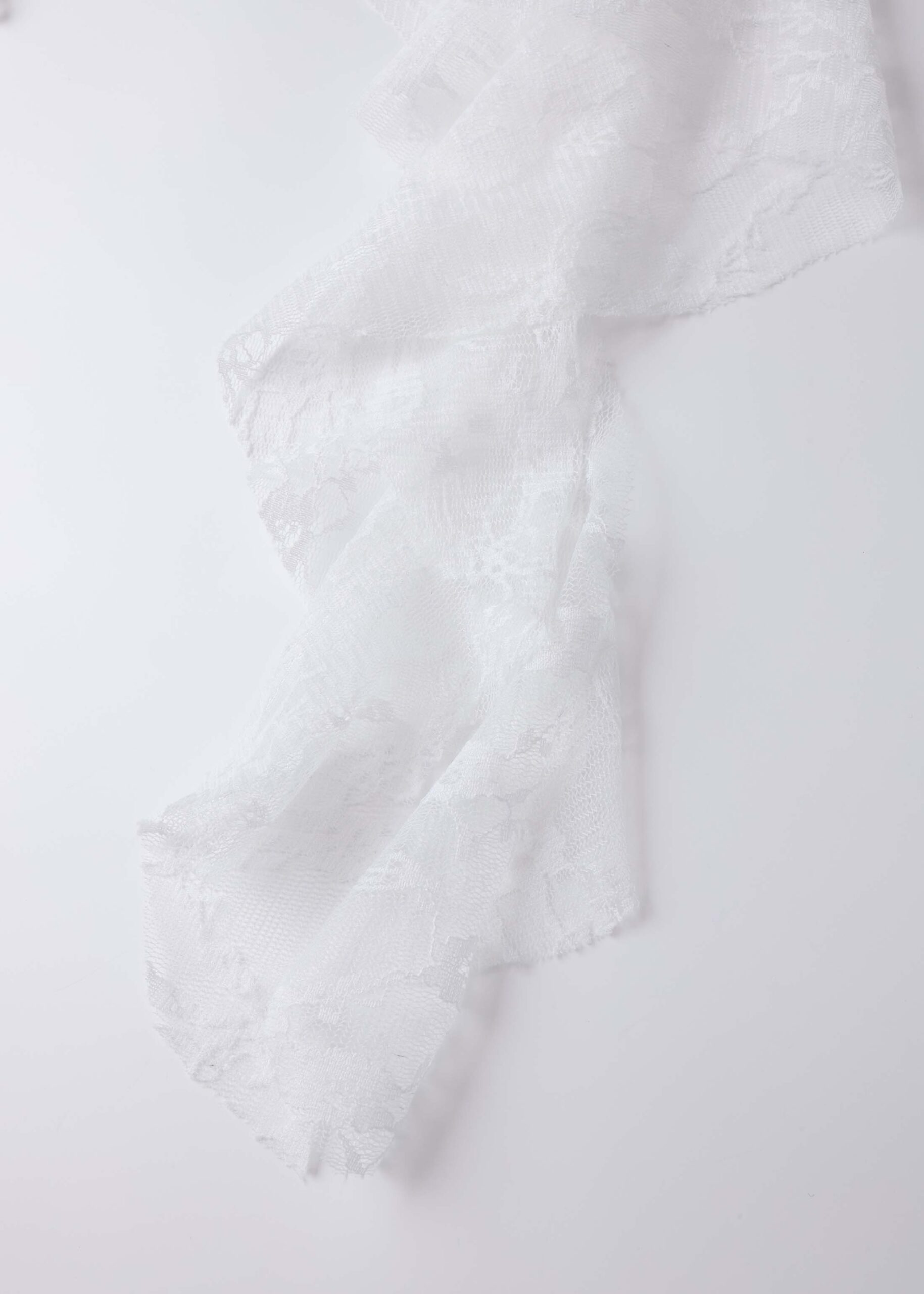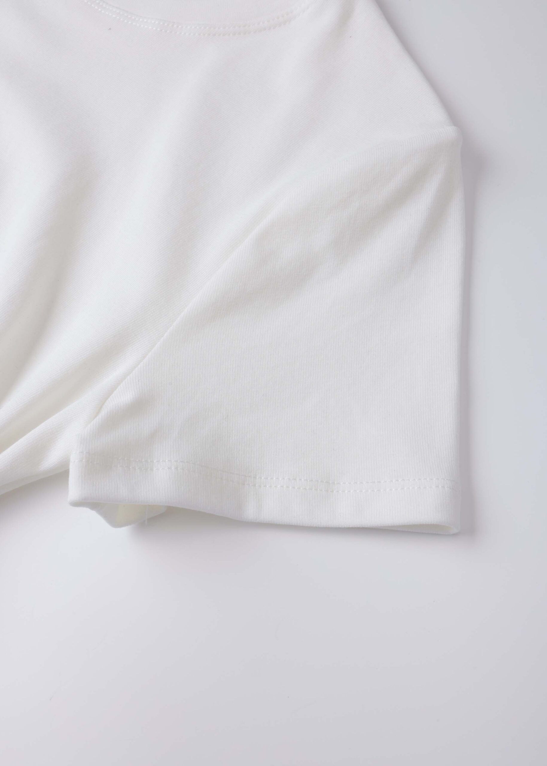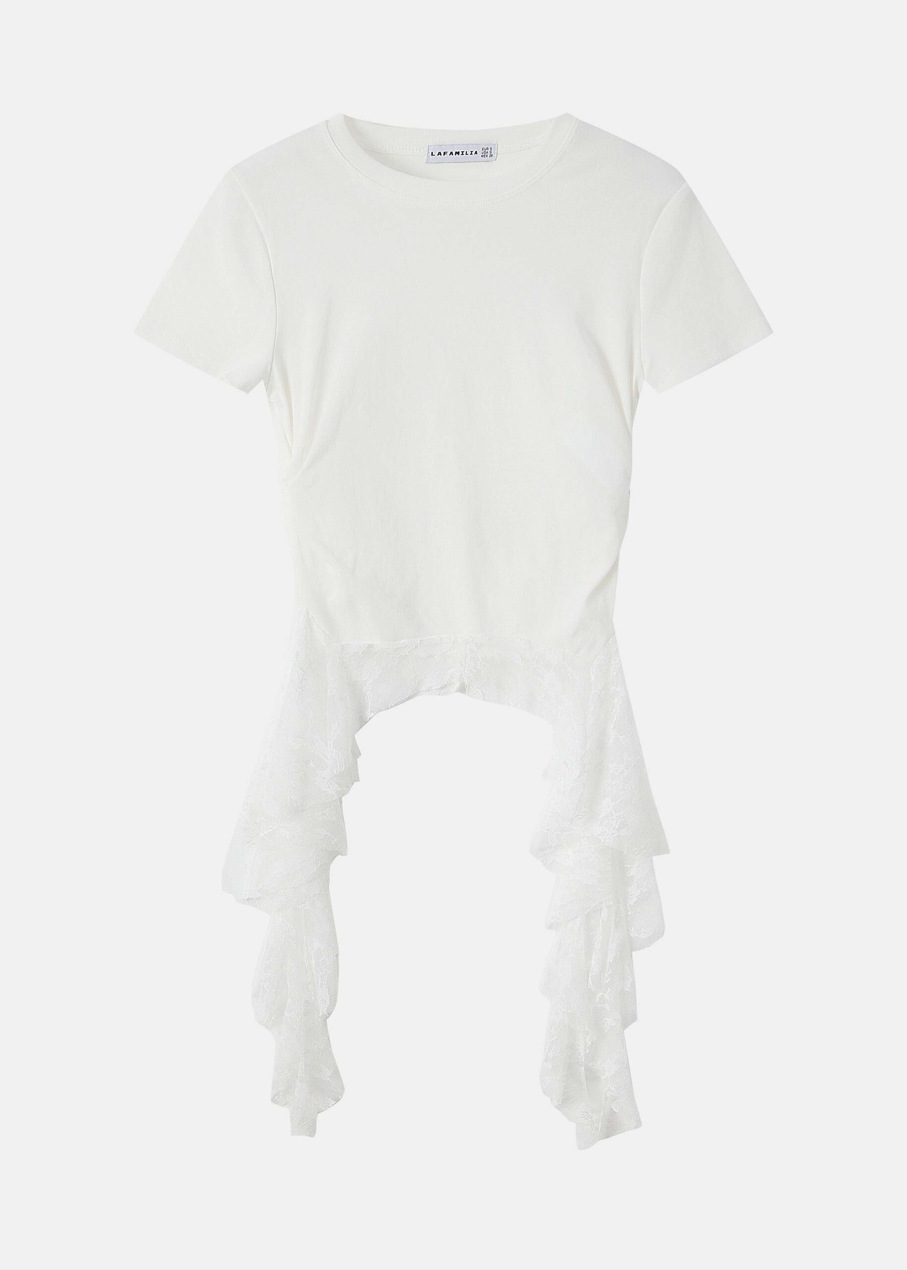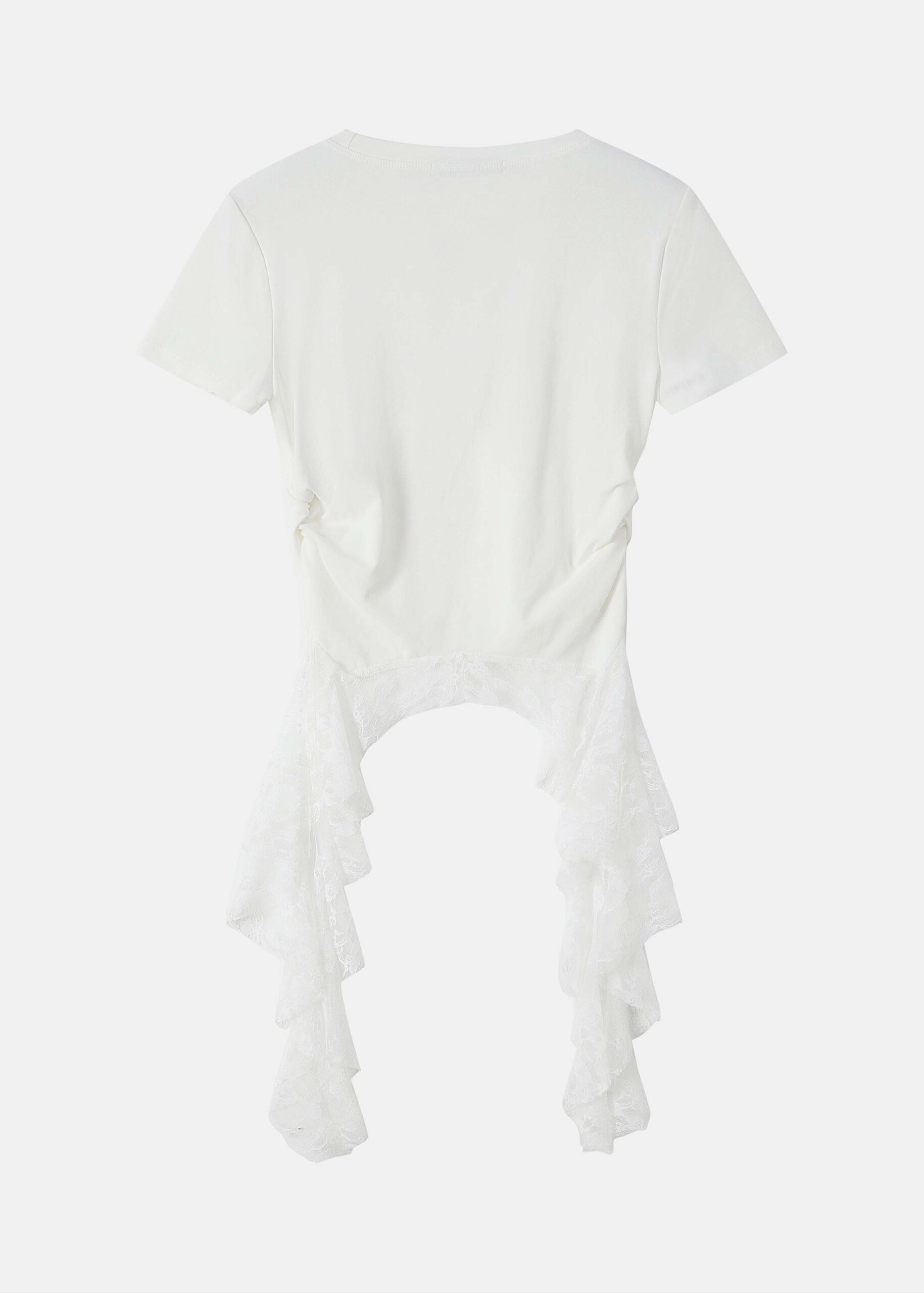 Women t-shirt, crew-neck, short sleeves, asymmetrical hemline adorned with ruffled lace drapes on both sides, unique and modern