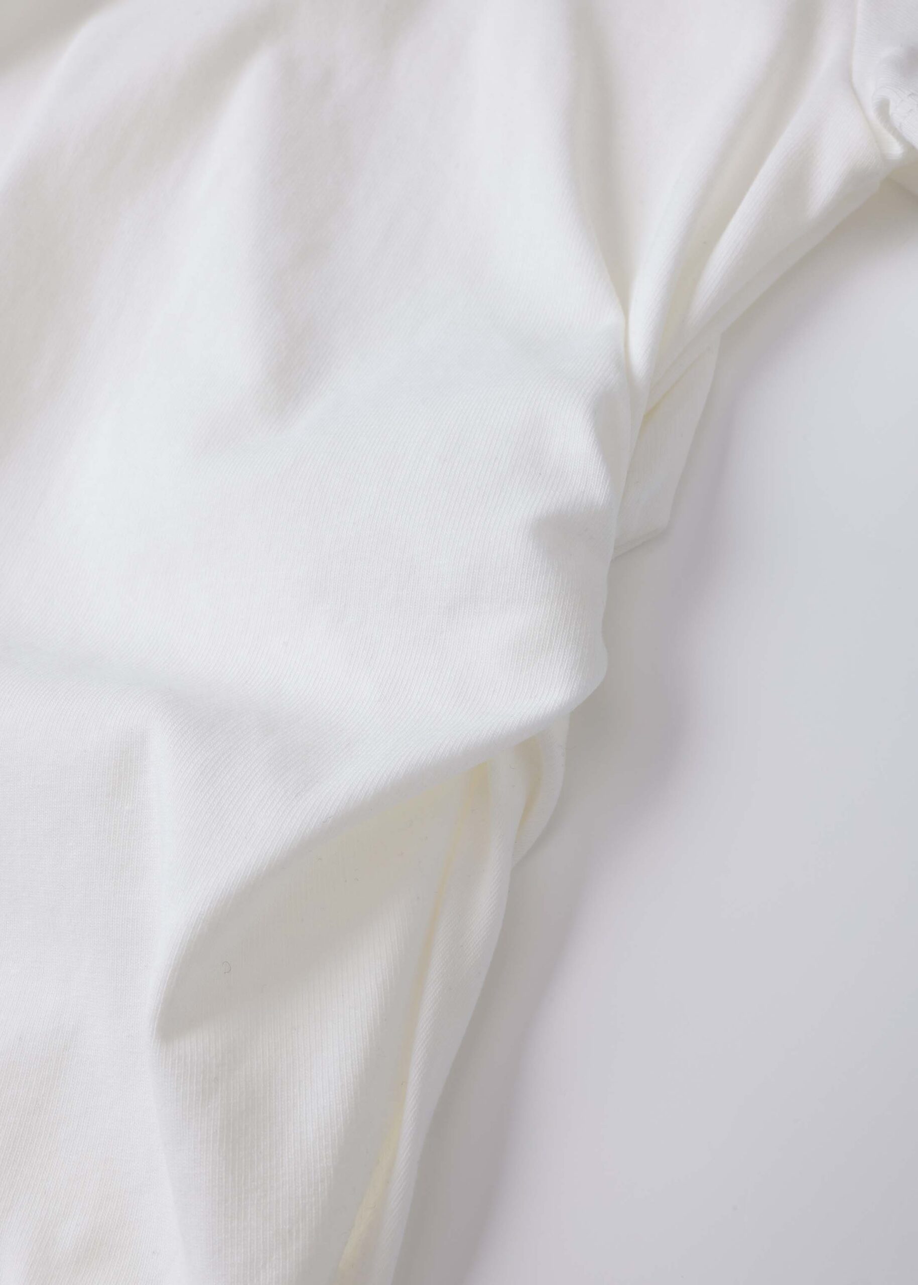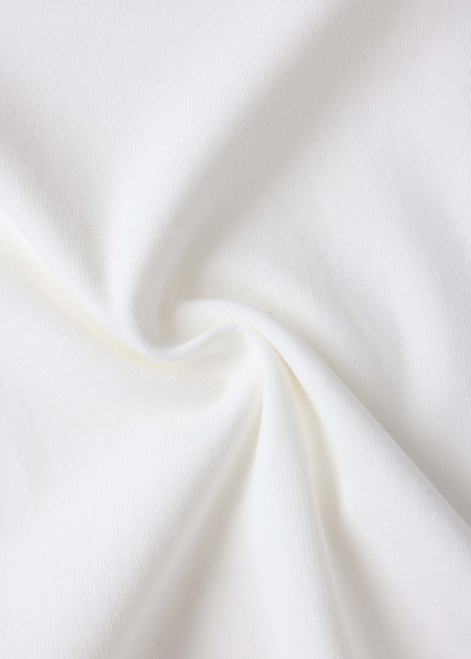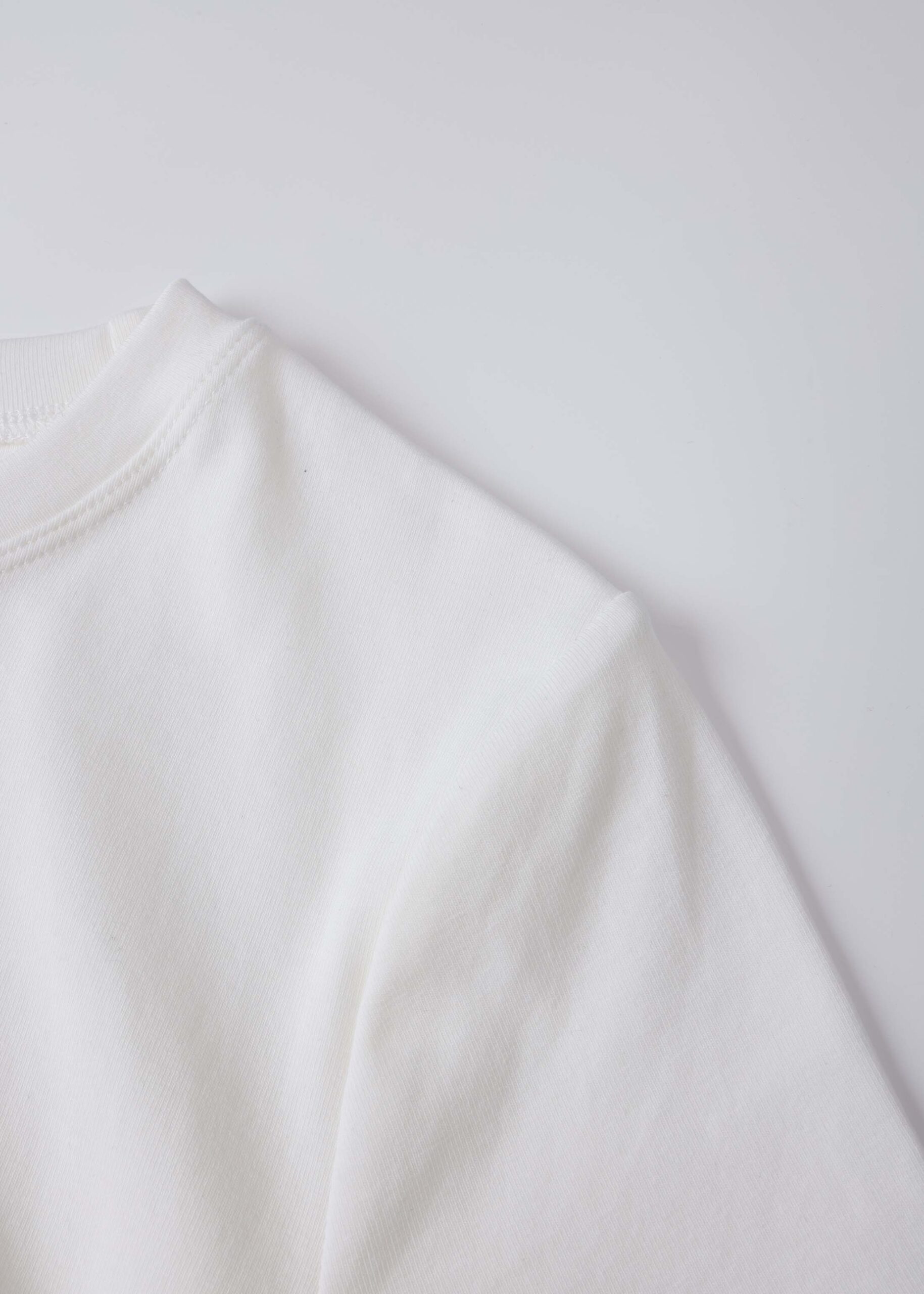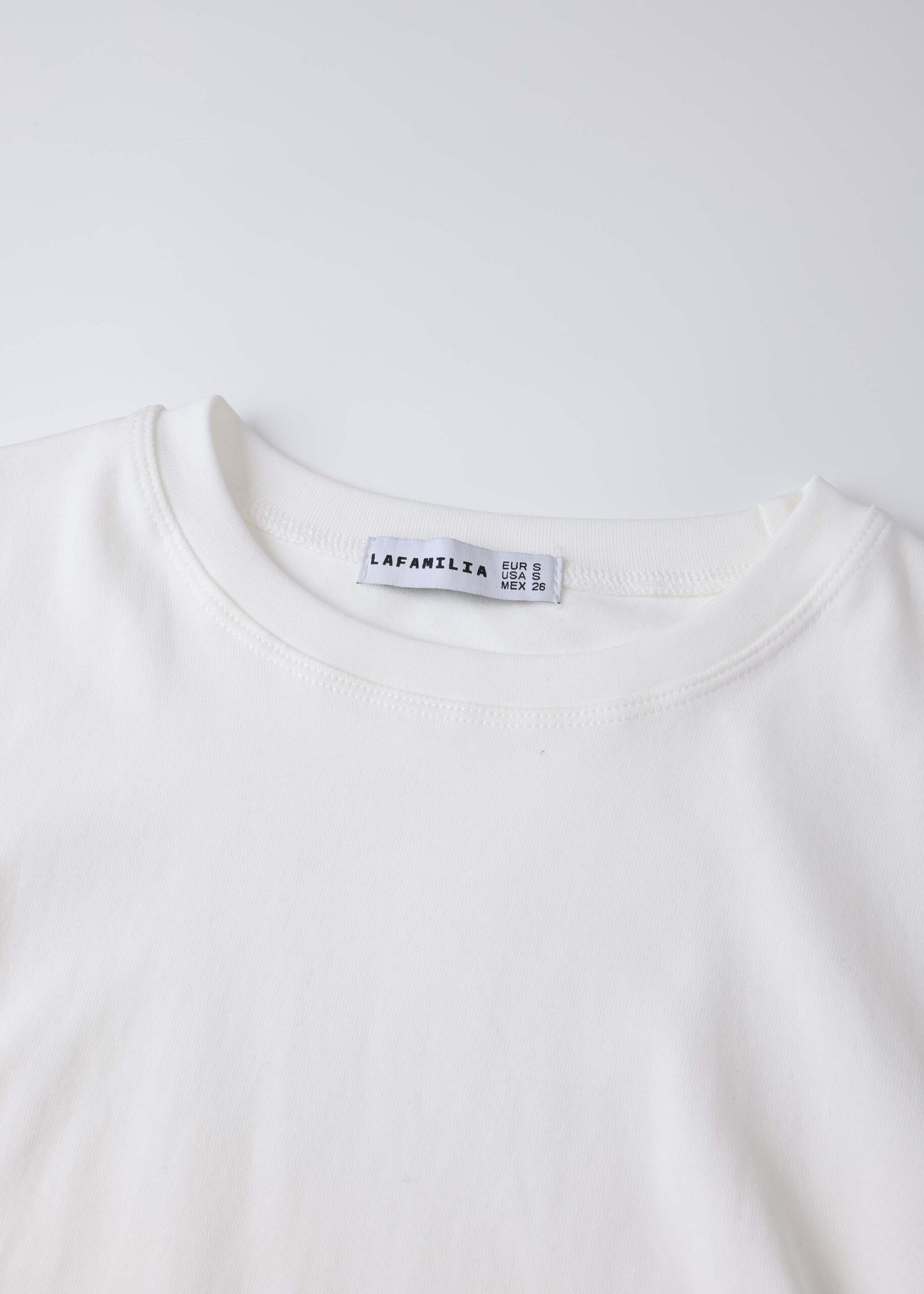 Women t-shirt, crew-neck, short sleeves, asymmetrical hemline adorned with ruffled lace drapes on both sides, unique and modern