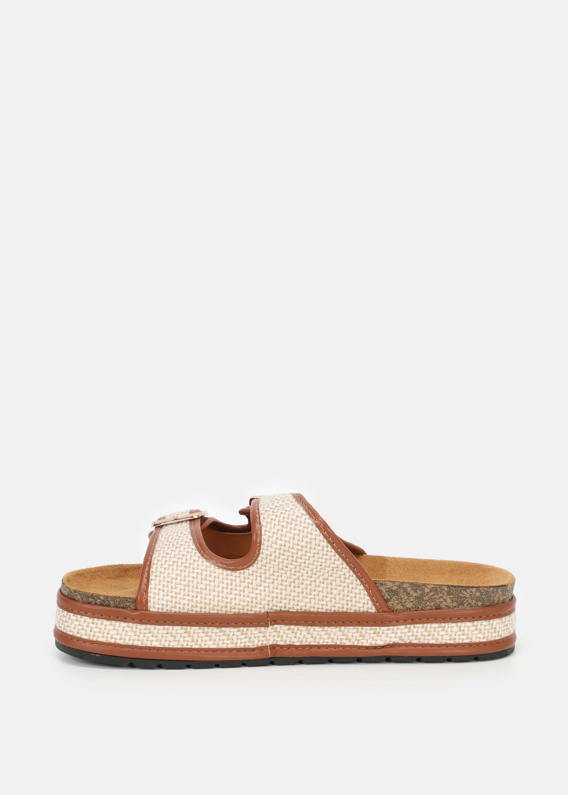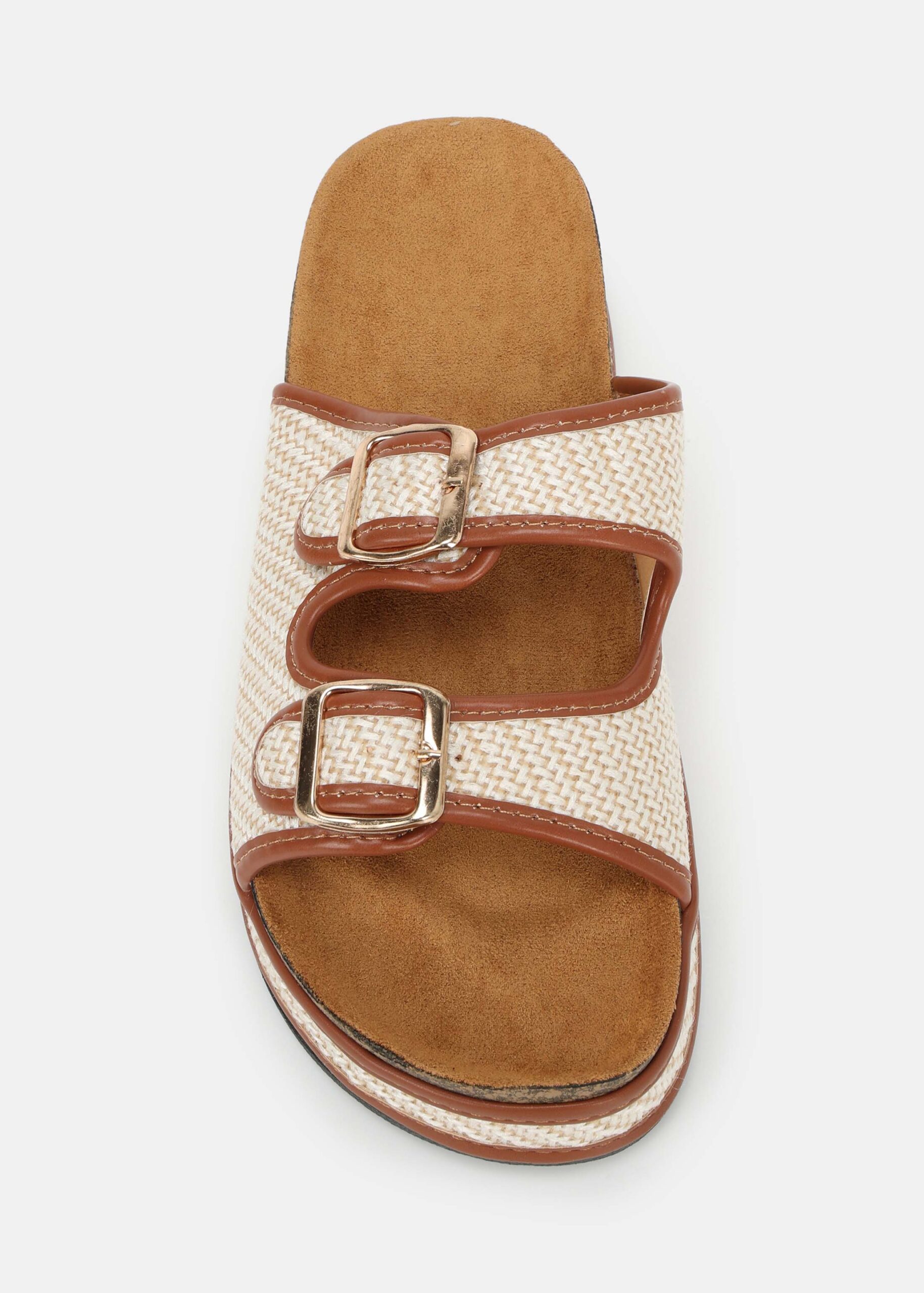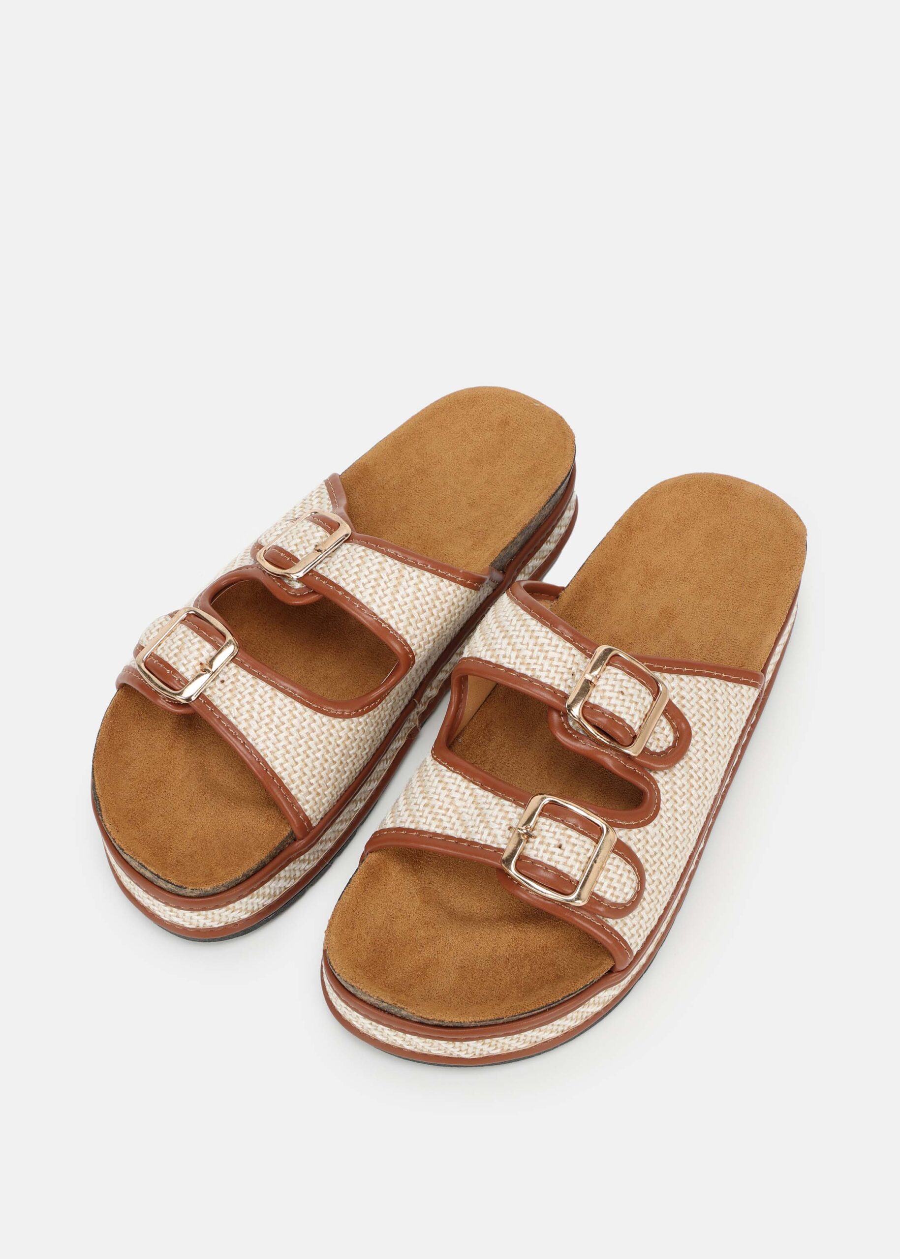 Women slipper, textured woven, open round toe, chunky flat sole, suede insole, upper straps with adjustable metal buckles, comfortable and unique