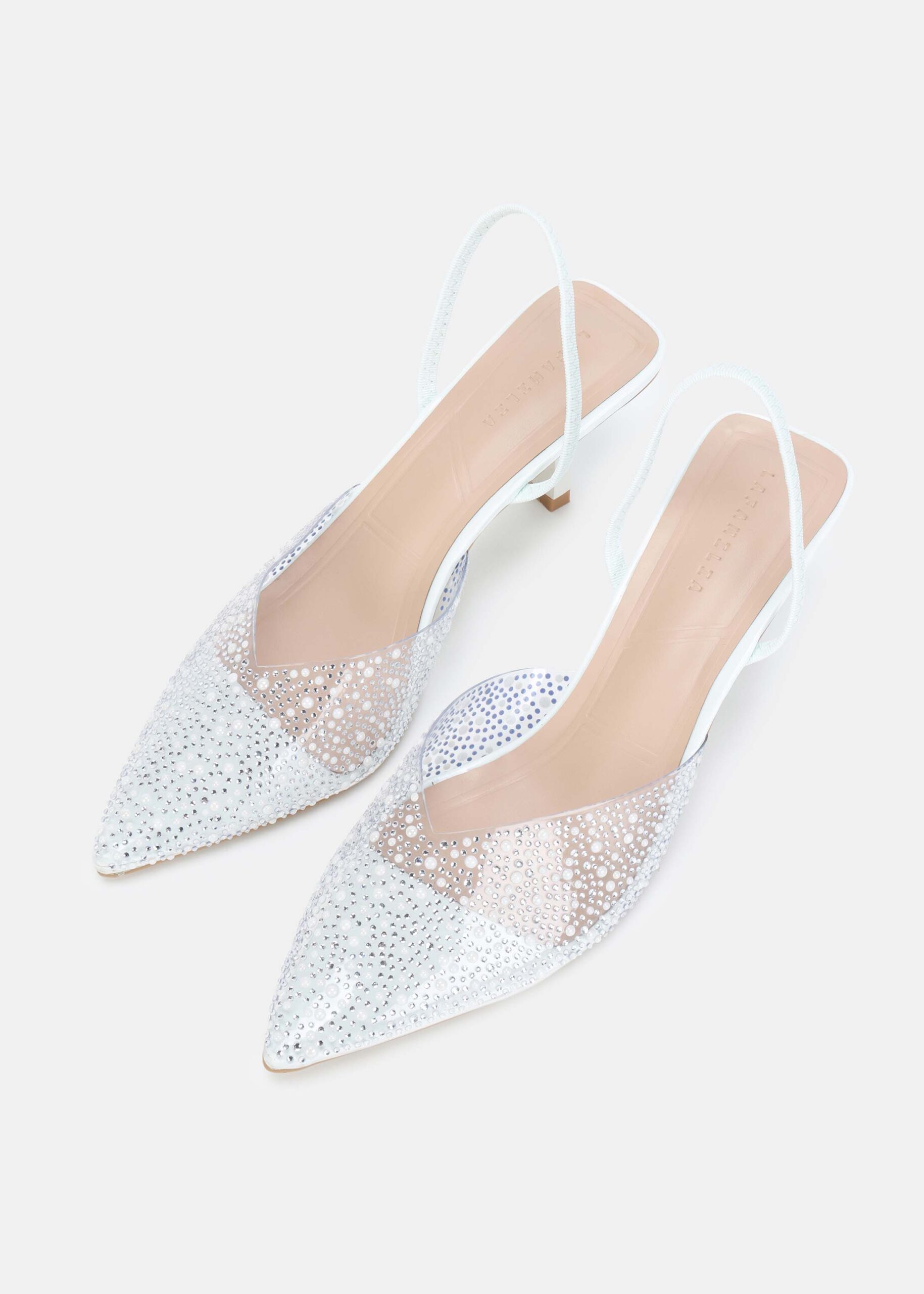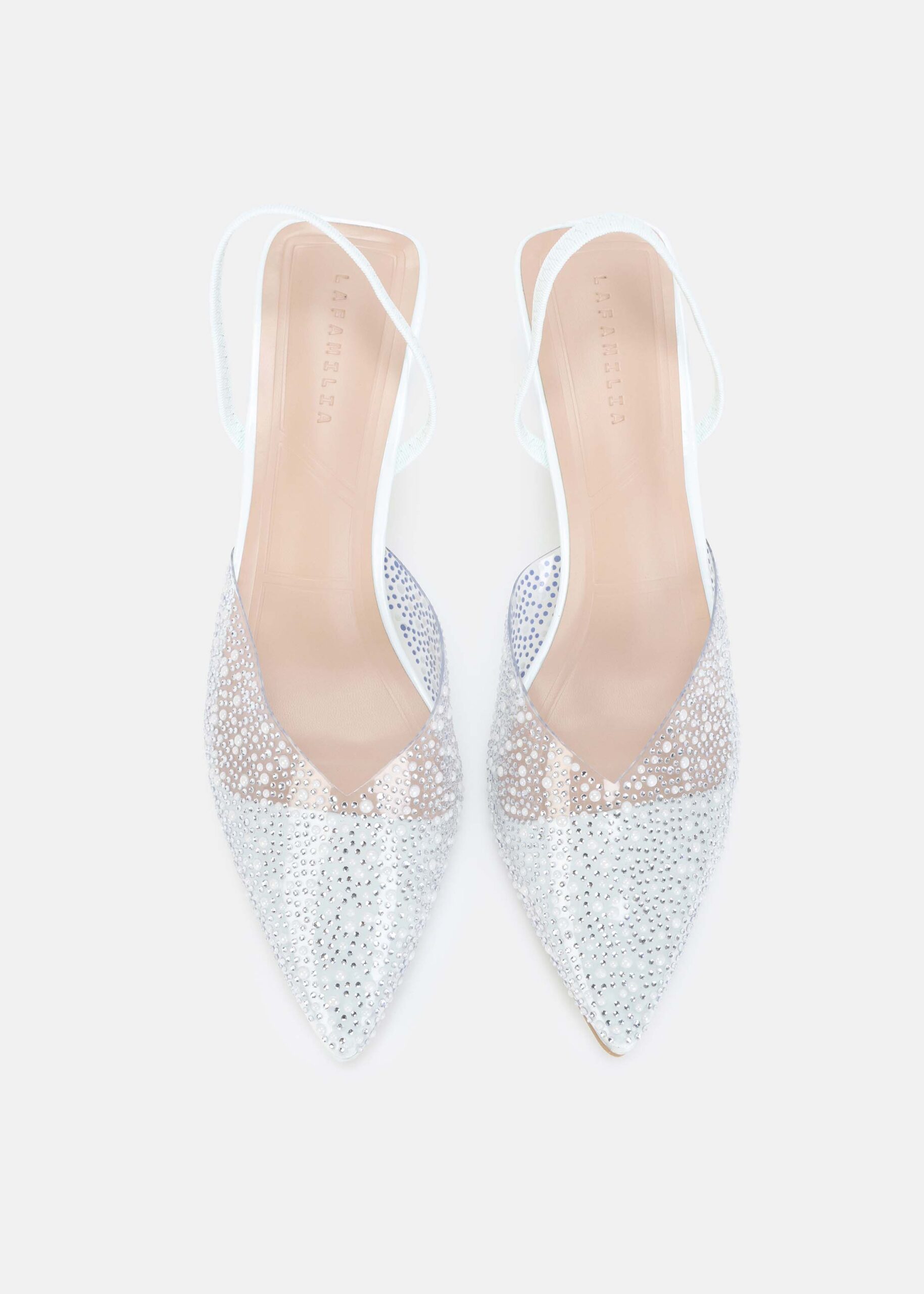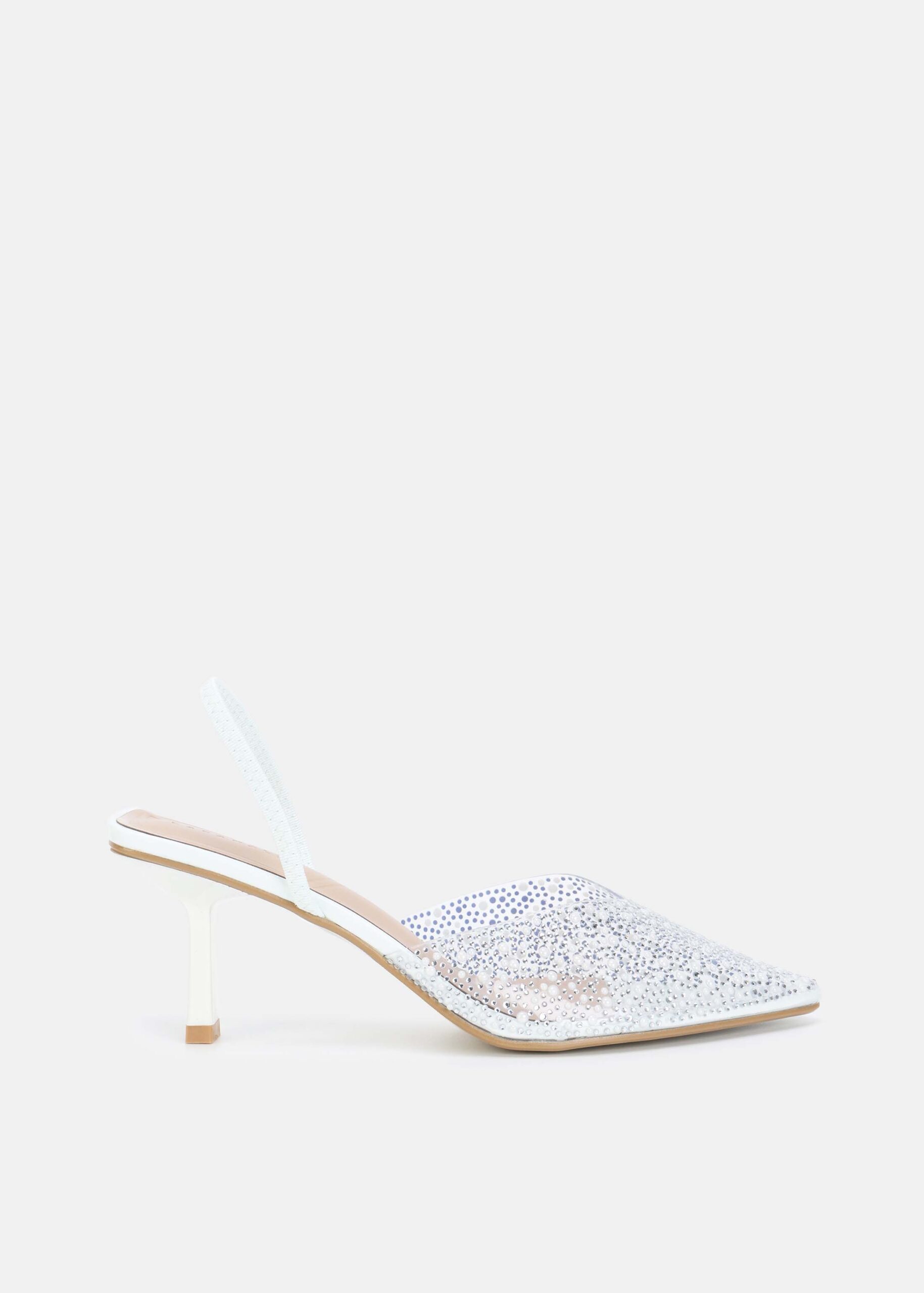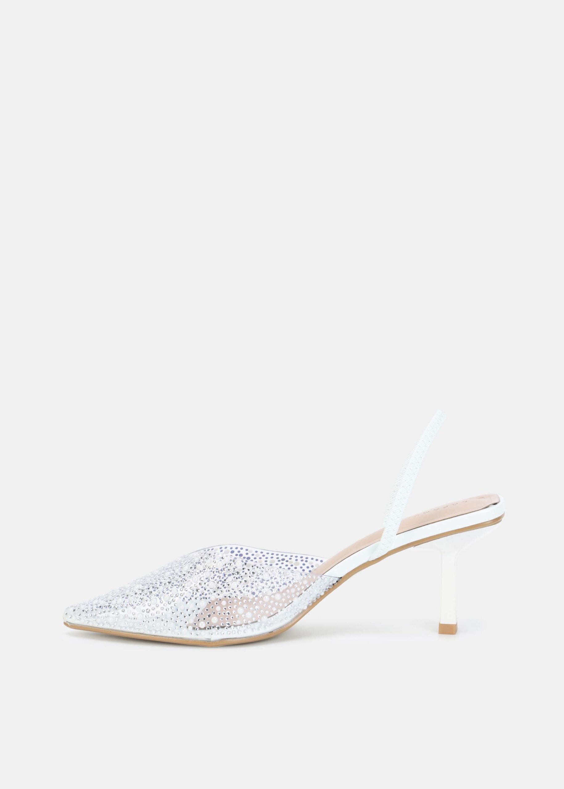 Women sandal, transparent with pearls and strass decor, point toe, elastic ankle strap, heels, unique and modern
