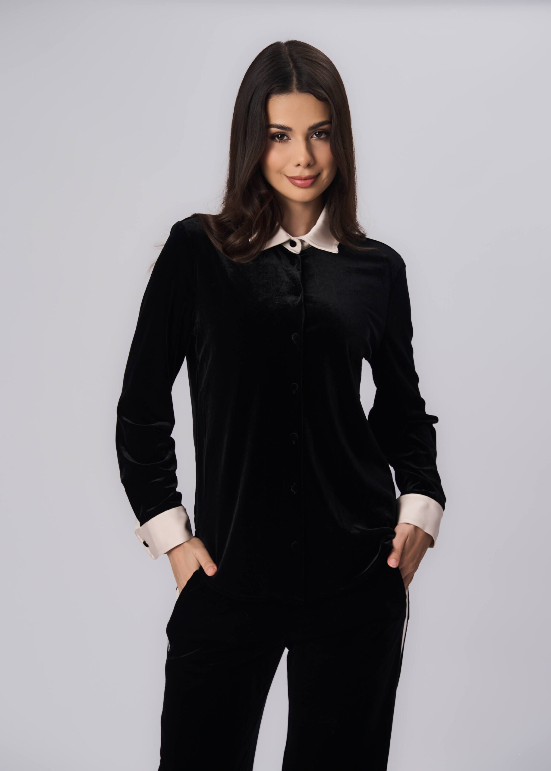 Women shirt, velvet, plain, rolled collar, front buttons to close, long sleeves ,tight cuff with button, unique and suitable with many styles