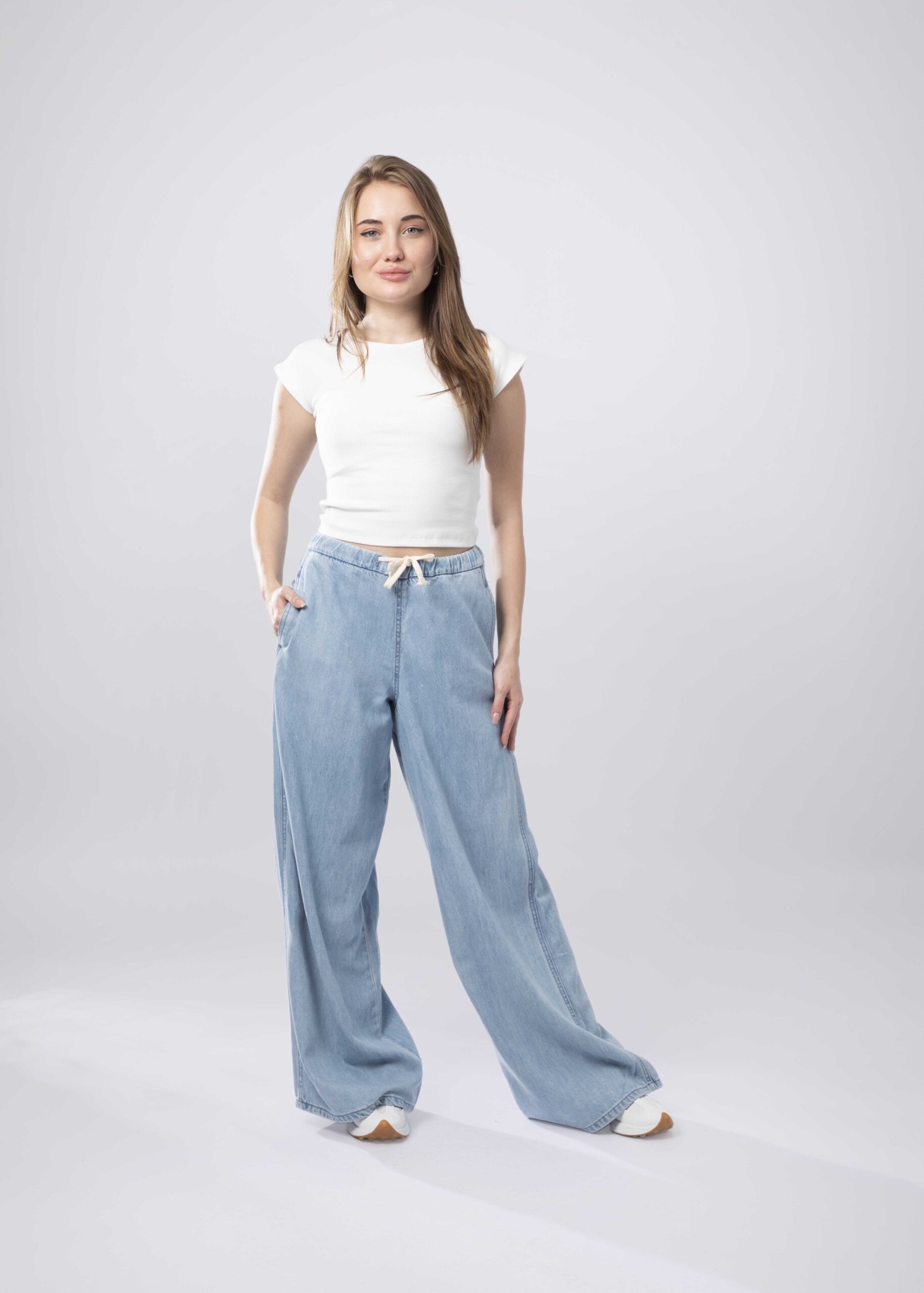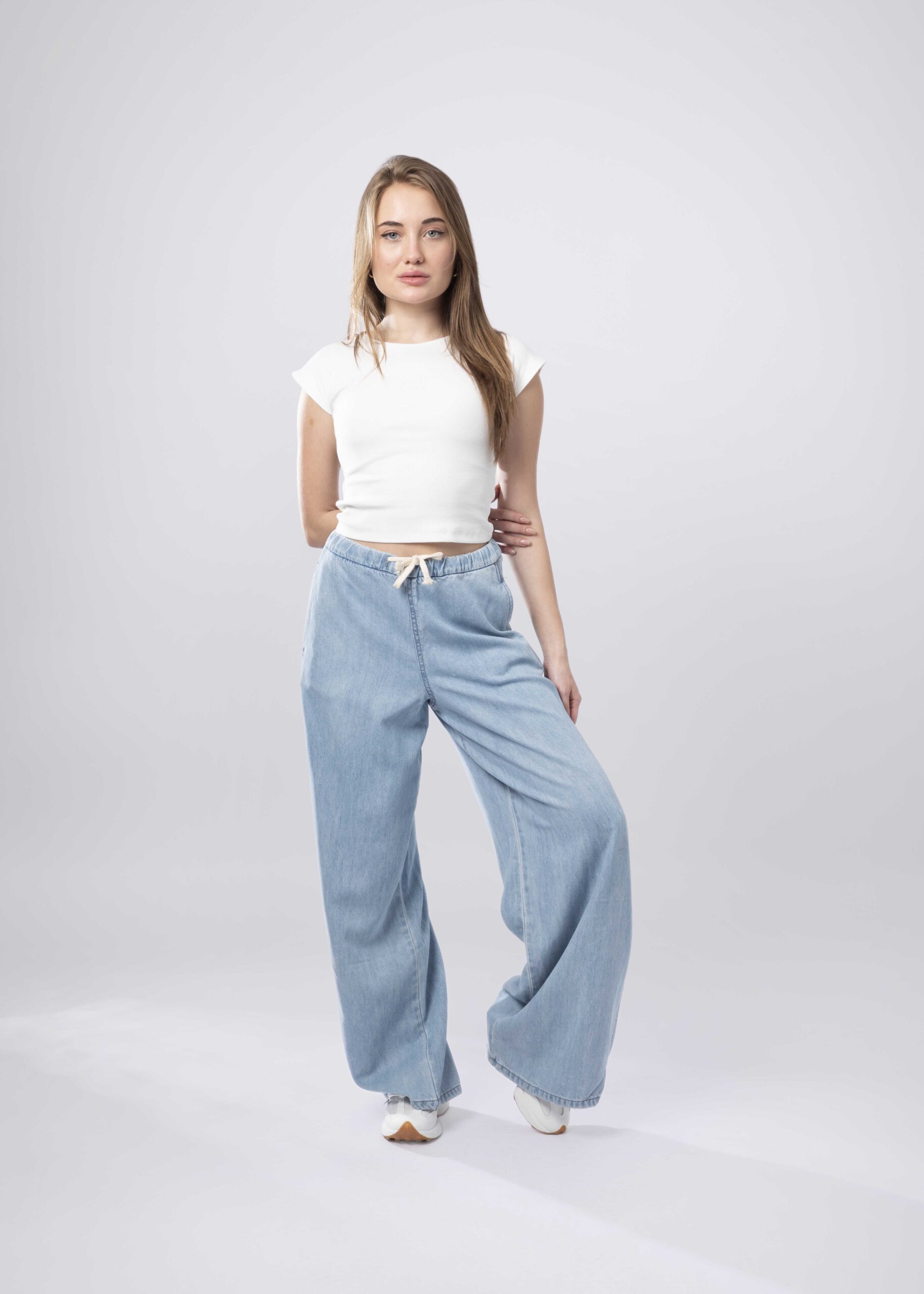 Women trouser, jeans, wide-leg, elastic waist wtih front tie, front pockets, practical and unique