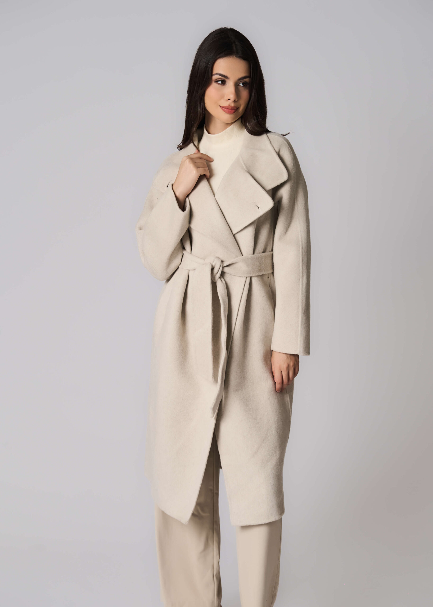 Women coat, wool broadcloth, plain, long, high neck with button, front buttons, long sleeves, waist belt, pockets, unique and warm