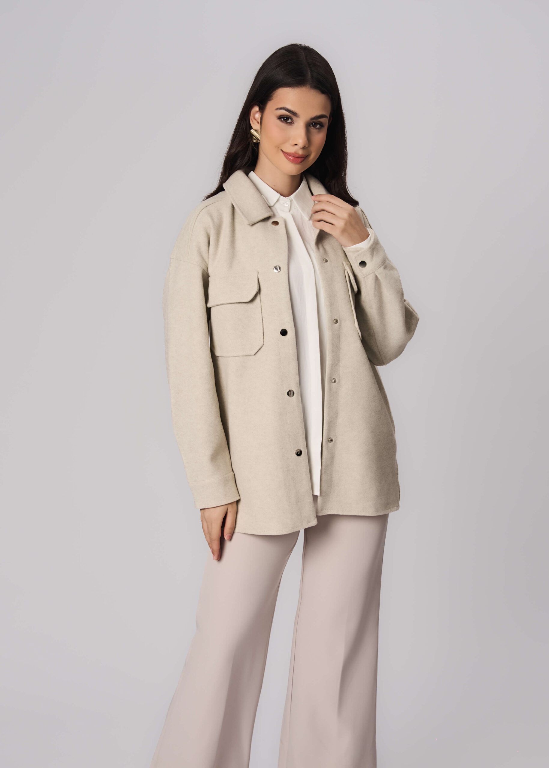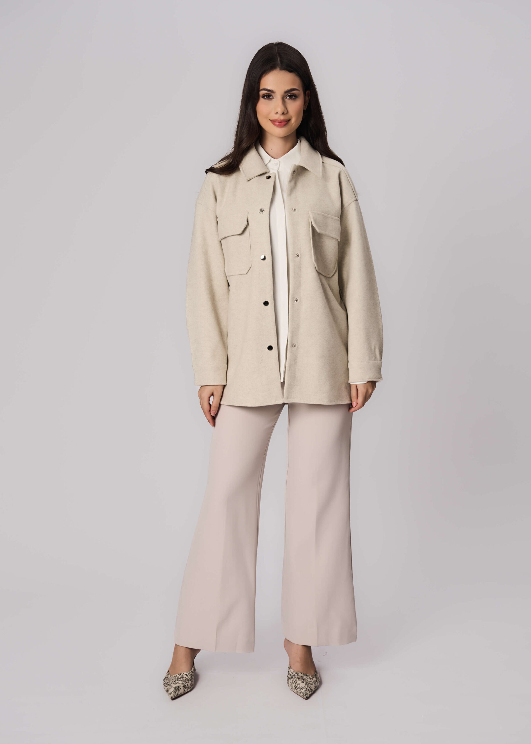 Women jacket, woolen fabric, rolled collar, front snap buttons to close, long sleeves, front pockets, unique and warm