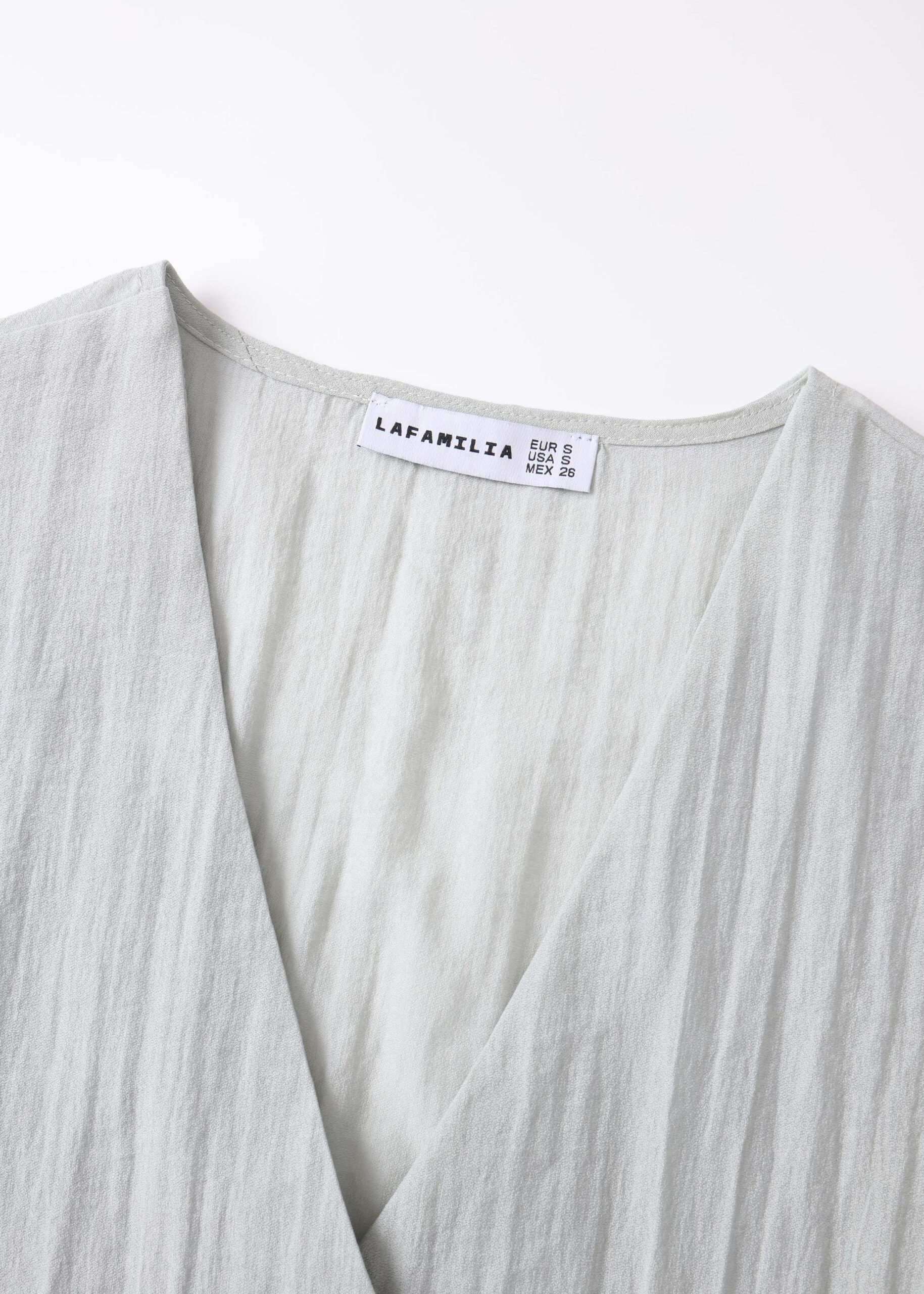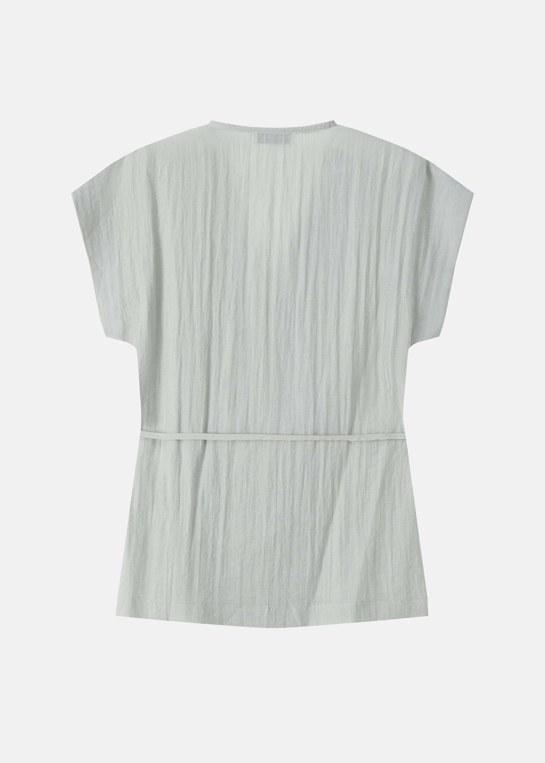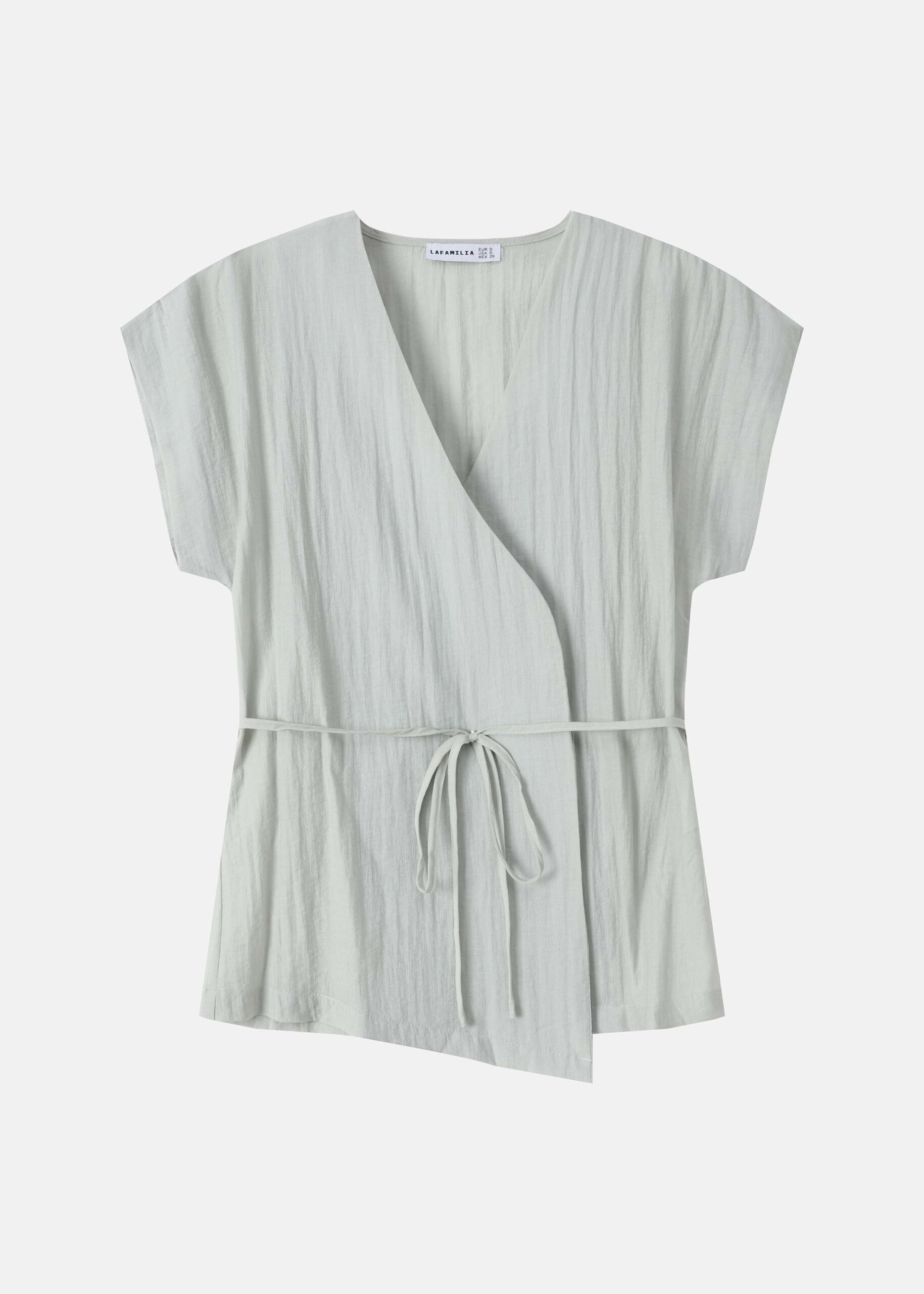 Women top, V neck, short sleeves, wrap around, open with waist tie, unique and modern