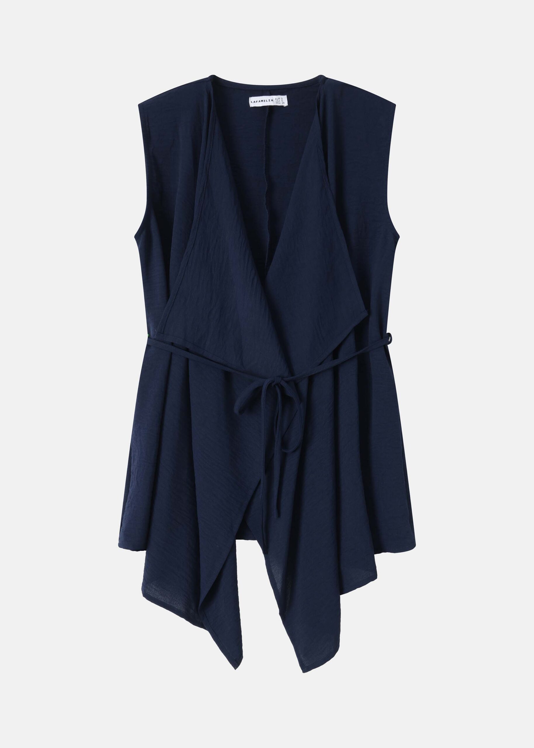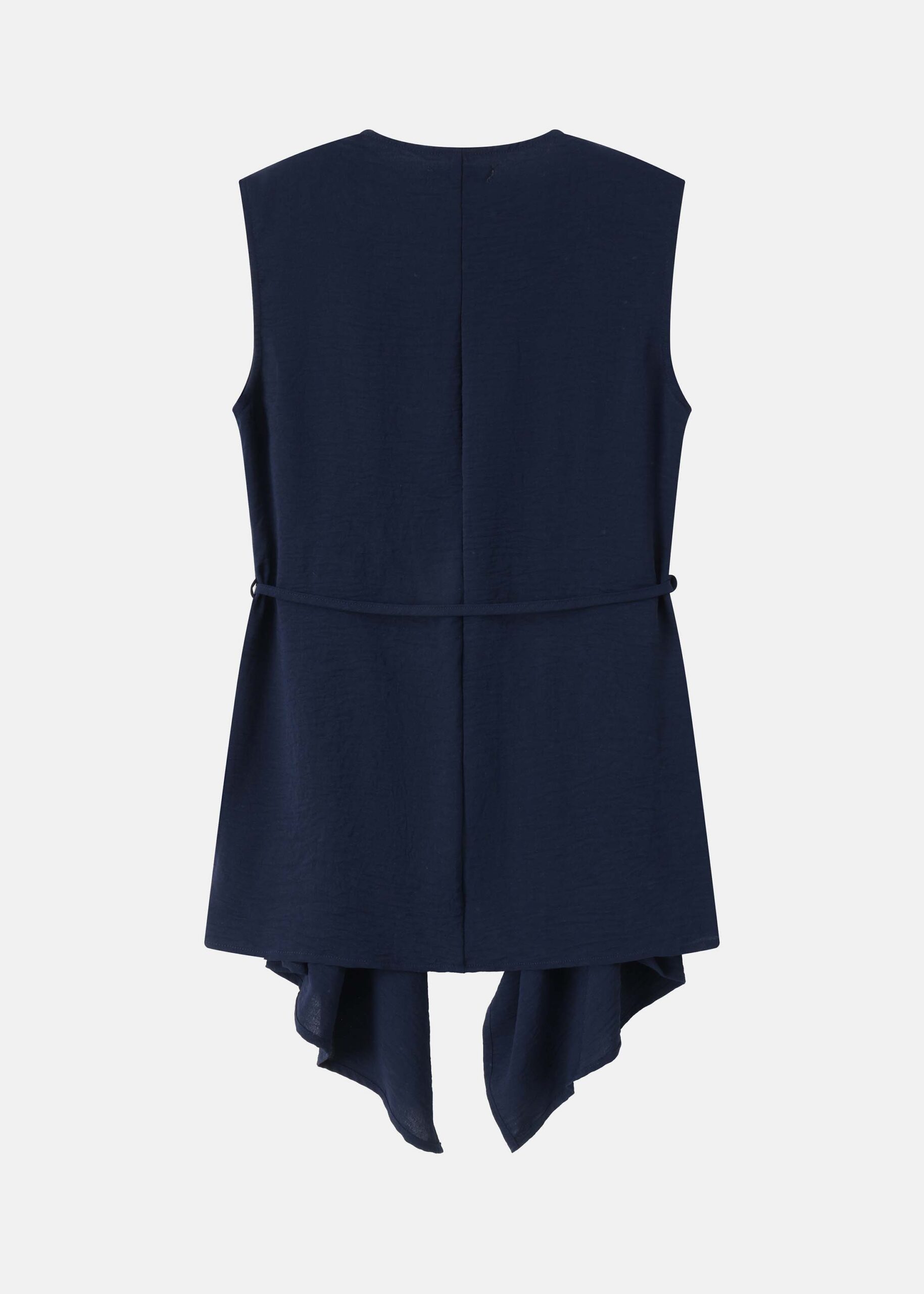 Women vest, wrap-around, lapel collar, waist belt, sleeveless, asymmetrical hem, unique and modern
