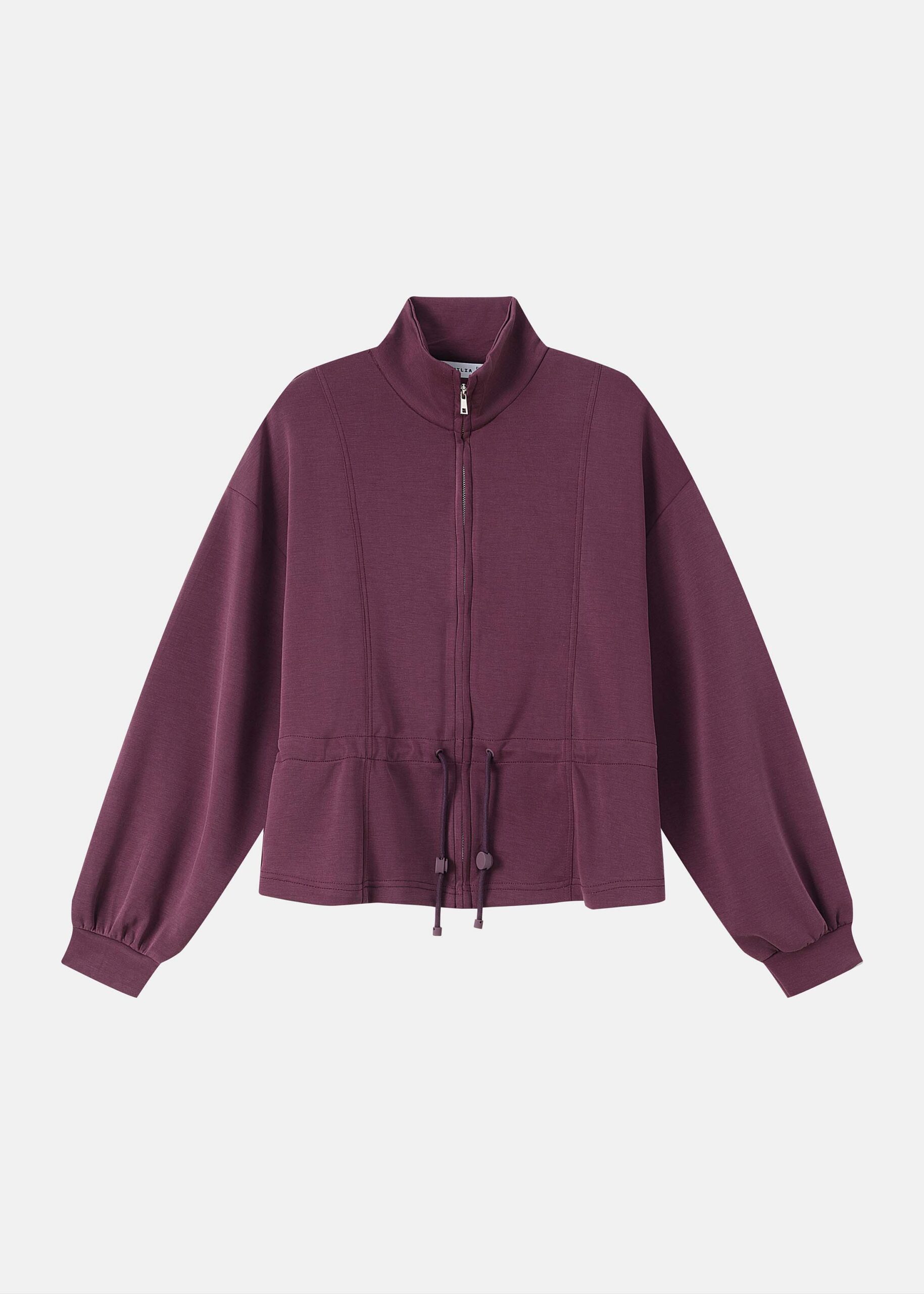 Women jacket, scuba fabric, high collar, front zipper closure, drawstring waist, long sleeves with tight cuff, practical and comfortable