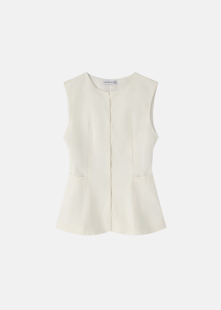 22.50 JODWomen vest, round neck, sleeveless, hidden placket from the front, front pockets, peplum design, unique and modern