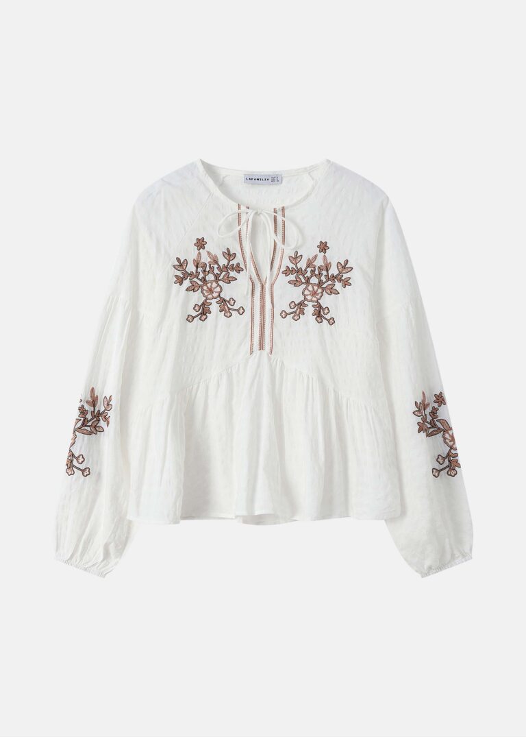 18.50 JODWomen blouse, embroidered decor, V neck with front tie, long sleeves with tight cuff, unique and modern