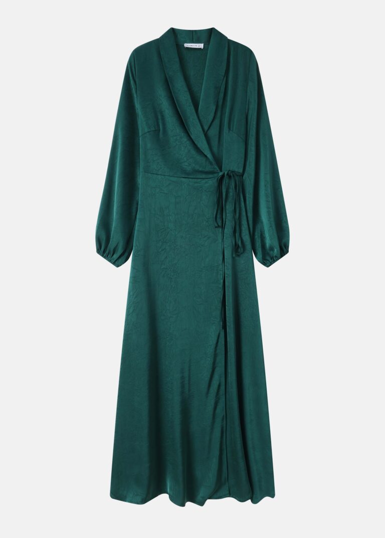 29.90 JODWomen dress, maxi, crinkled satin, wrap-around design from the front with side tie, V rolled neck, long sleeves with elastic cuff, unique and suitable for many occasions