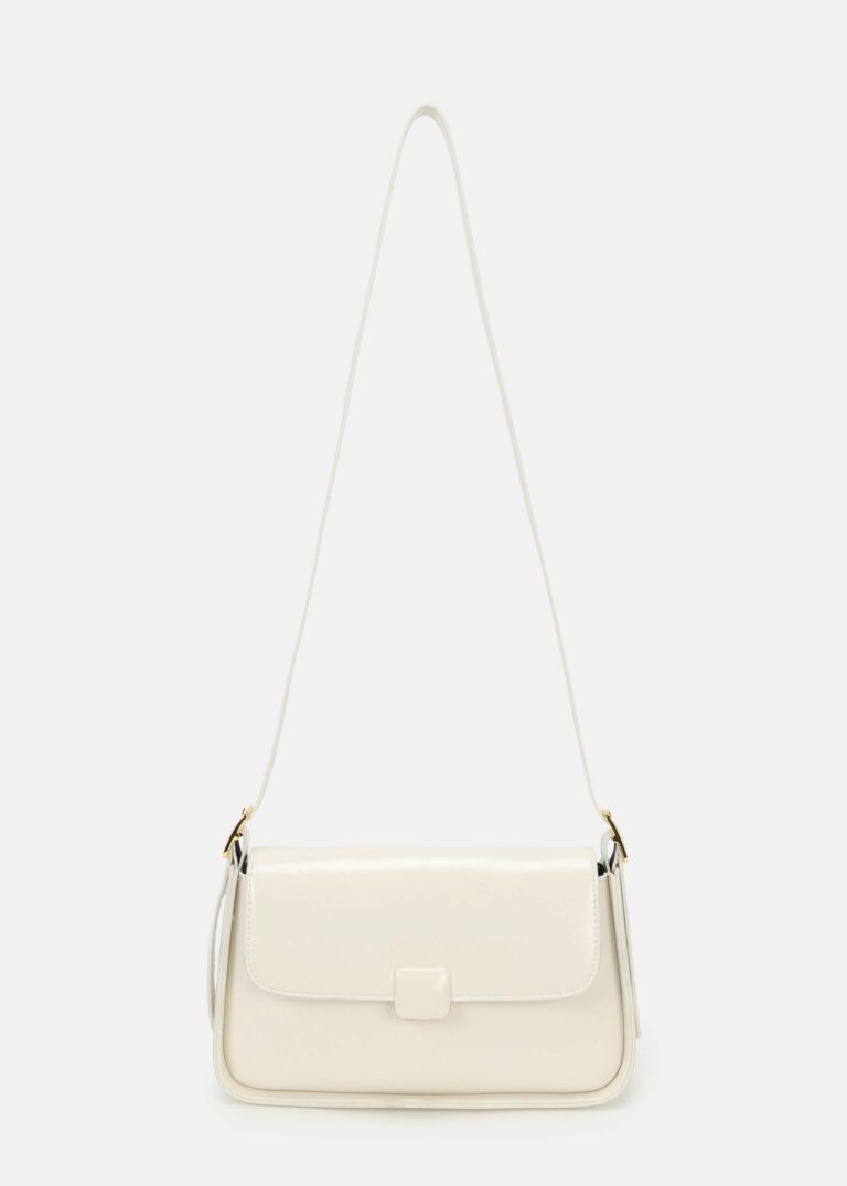 Women bag, leather, front flap with snap button, adjustable and detachable shoulder strap, detachable hand strap, upper zip closure, unique and modern