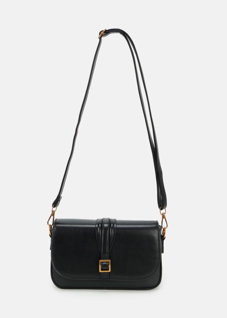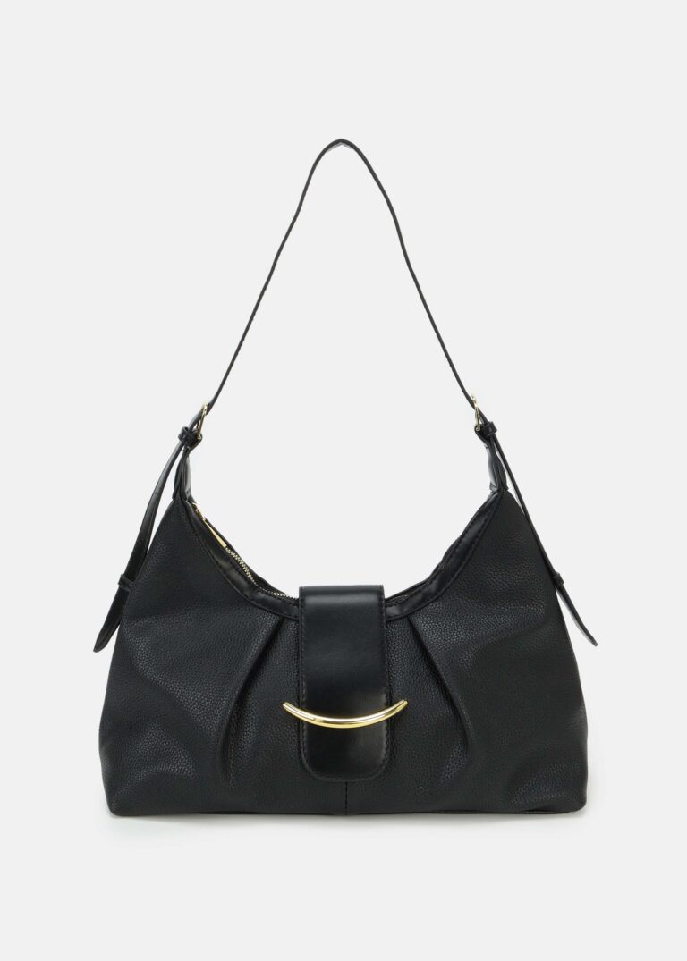 Women bag, leather, hand strap, adjustable and detachable shoulder strap, front strap with metallic buckle decor, top zip closure, unique and modern