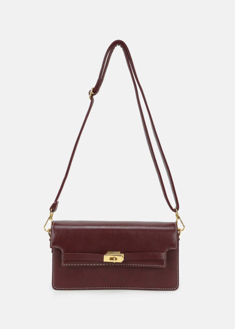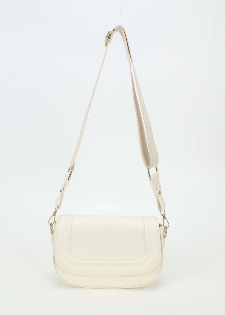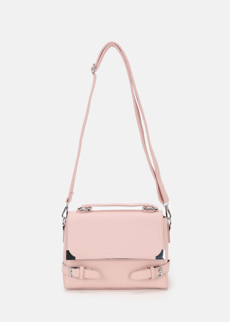 Women bag, leather, front flap with snap button to close, sides belt decor, hand strap, adjustable and detachable shoulder strap, upper zip closure, unique and modern