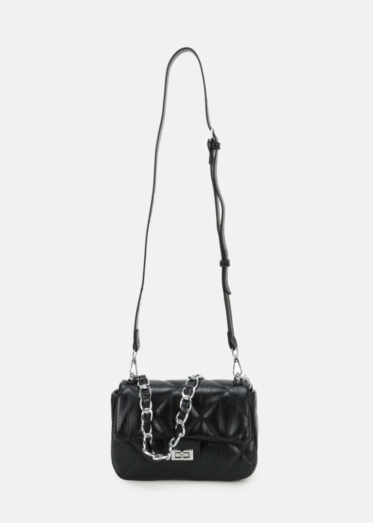 Women bag, leather, quilted with textured pattern, front flap closure with metal buckle, top zip closure, detachable and adjustable long shoulder strap, fixes shoulder strap with chain decor, elegance and unique