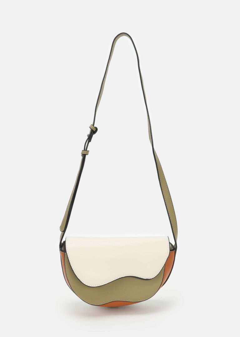 Women bag, leather, color-block, front flap with snap button to close, adjustable shoulder strap, back pocket, upper zip clousre, unique and modern