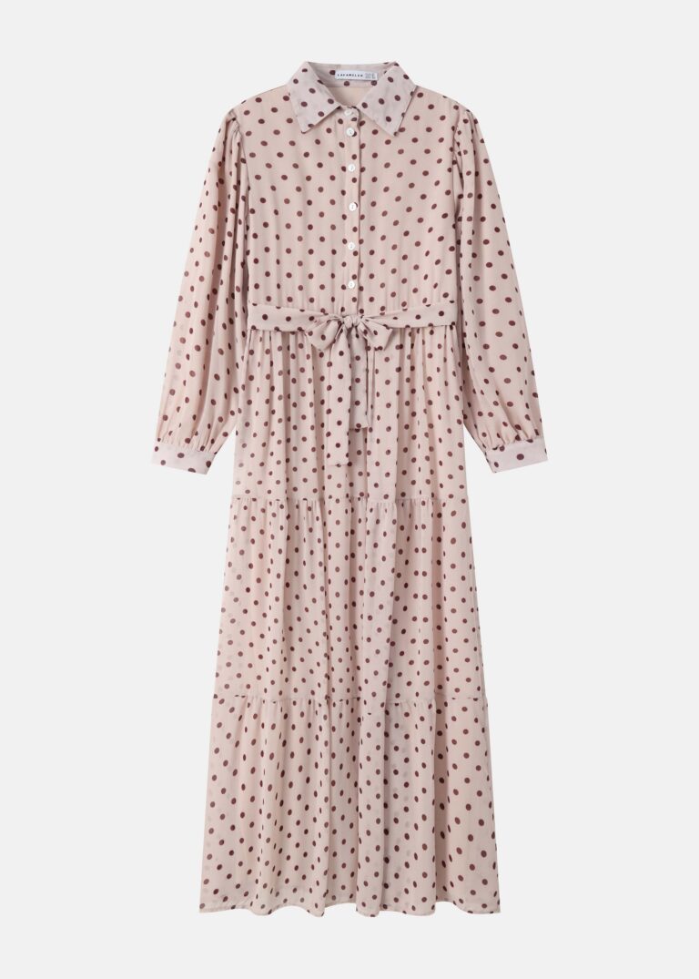 29.90 JODWomen dress, long, dotted, rolled collar, front buttons to close, long sleeves with tight cuff, waist tie, layers design, unique and modern